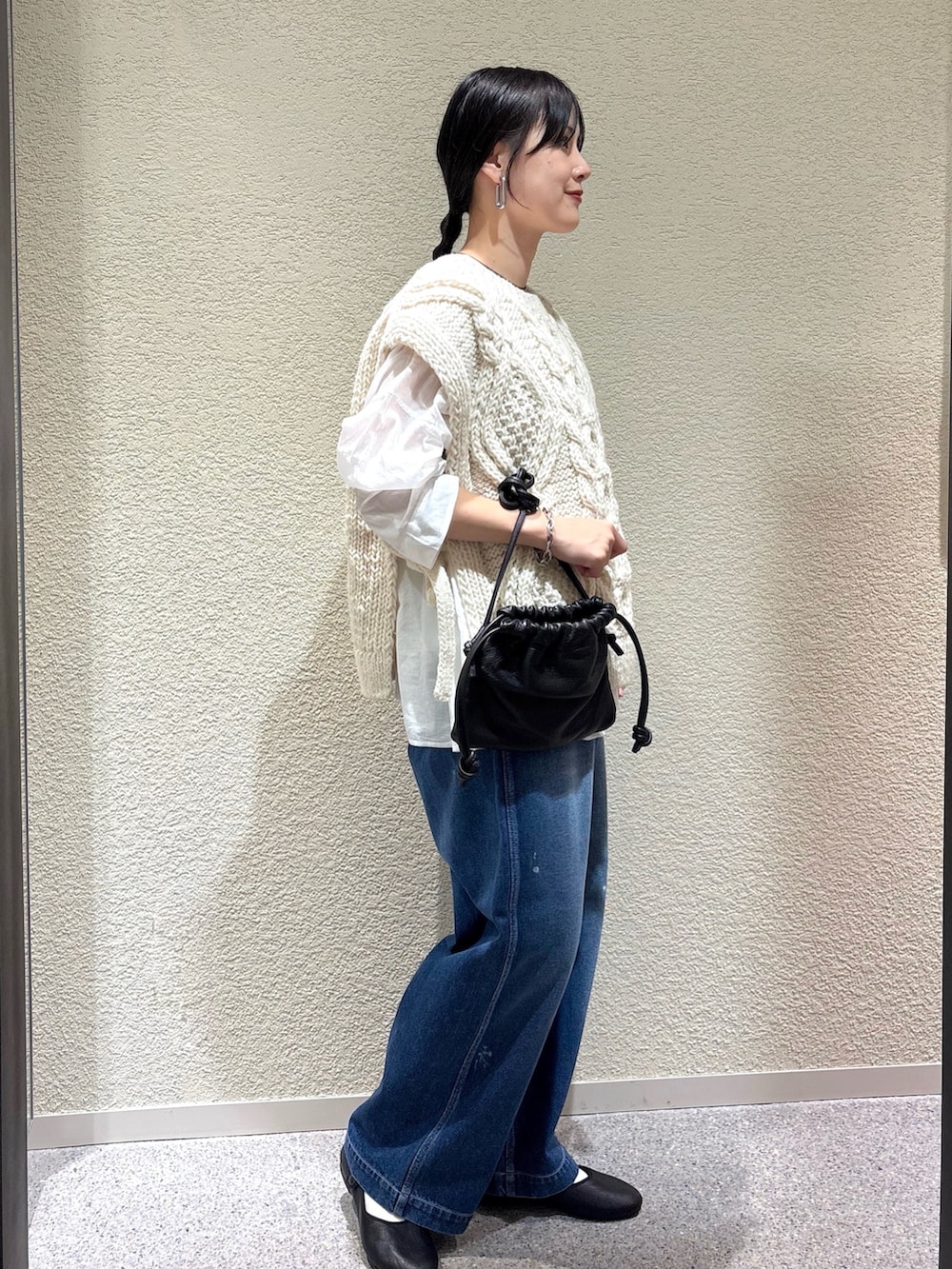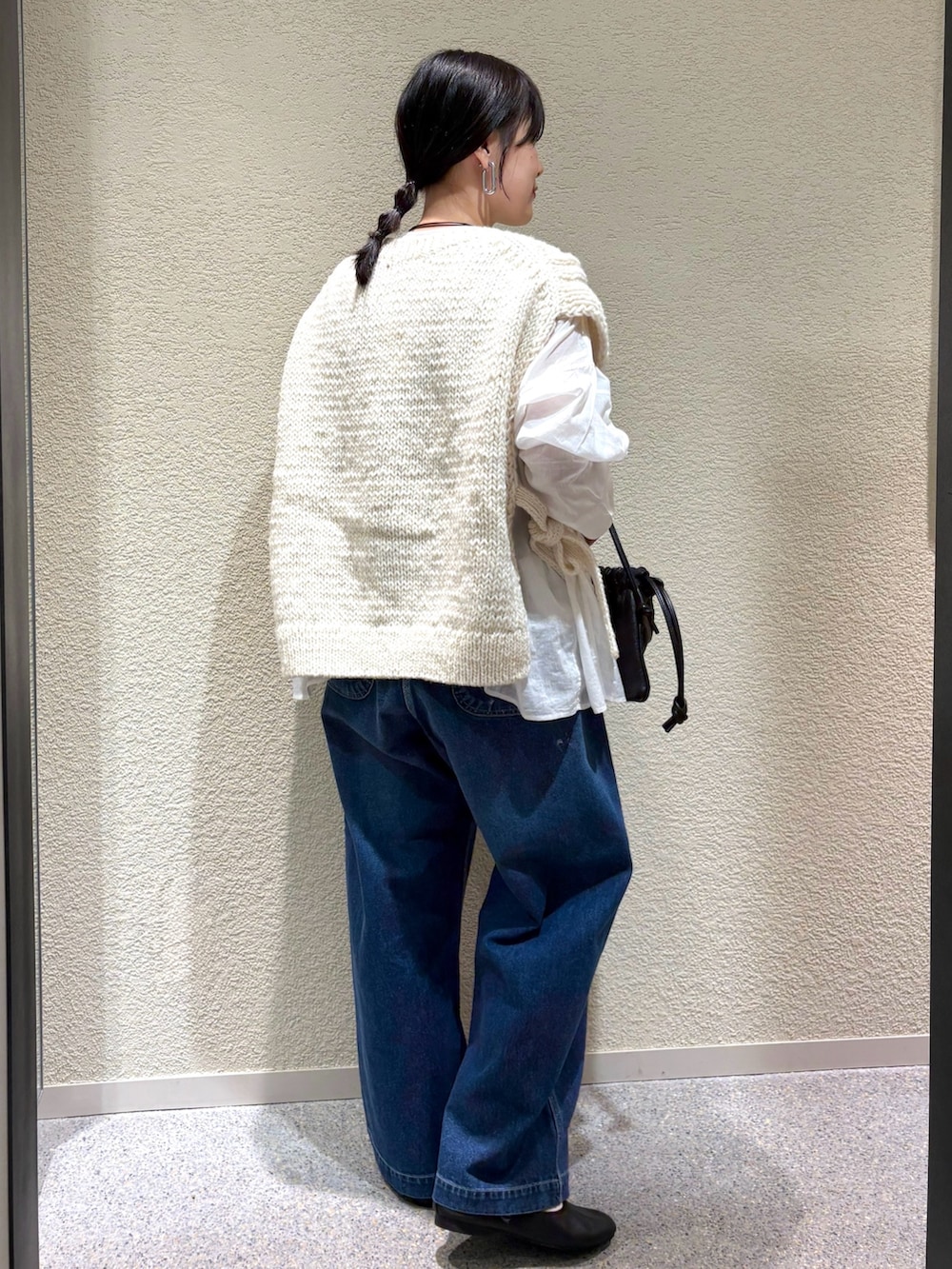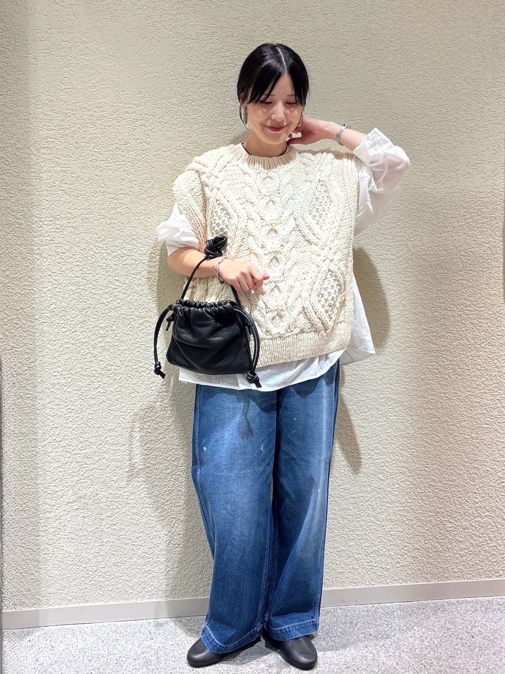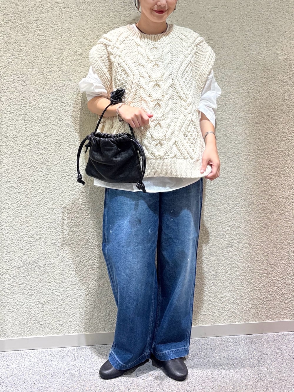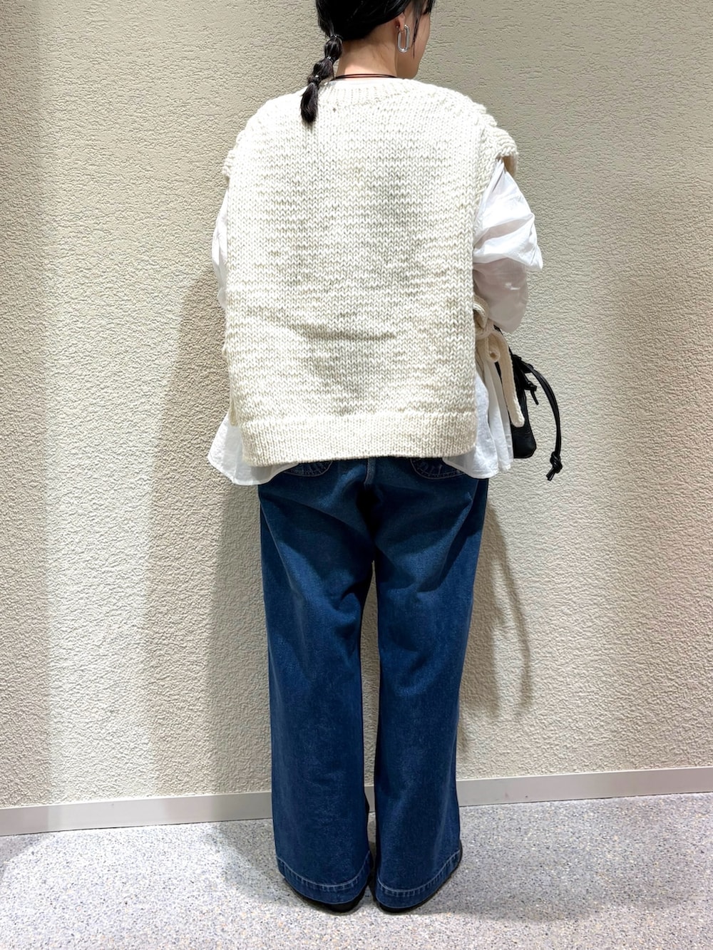・オフホワイト×アイボリーのニュアンス配色に、ユーズドデニムを合わせてバランスよくカジュアルダウン