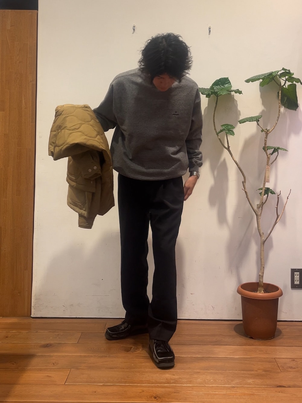 別注snowpeakスウェットと機能性素材使用完声パンツでコーデ組みました。色味のあるアウターでアクセントつけました。リバーシブルのアウターなので気分によって変更可能です。snowpeakに関しては形から別注で作ってます。差別化できるよう杢っぽいカラーになってます👍裾のリブは強めになってて丸みを帯びるようになってます。首元も詰まっててアウターとの合わせも調整しやすくなってます。