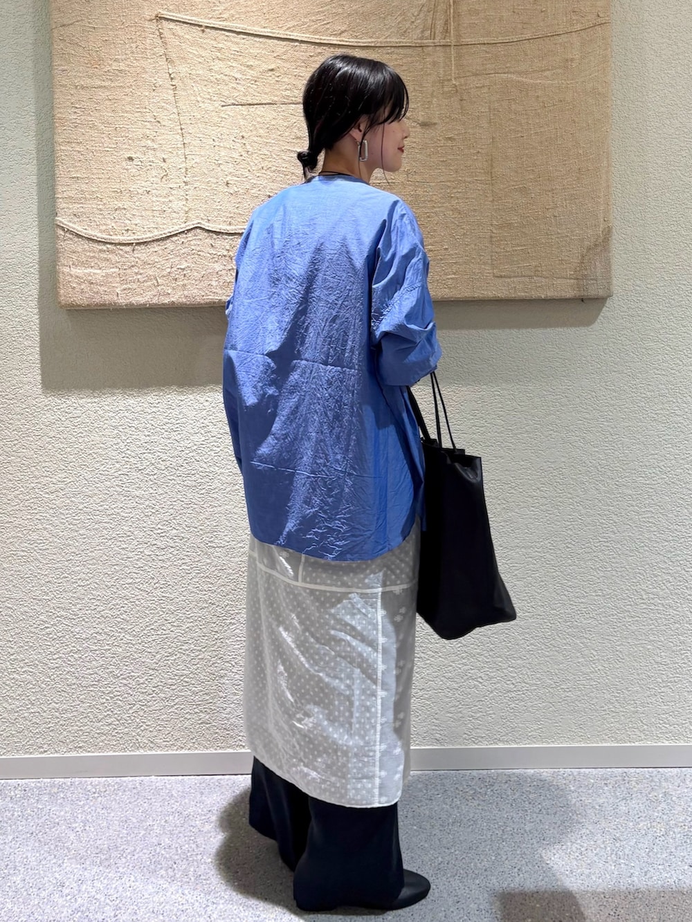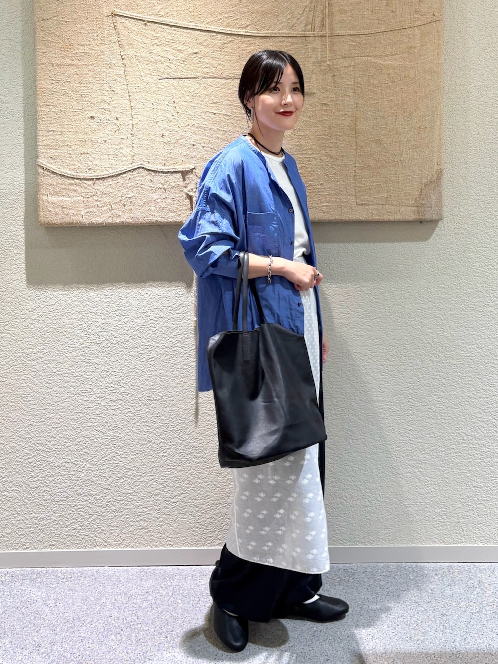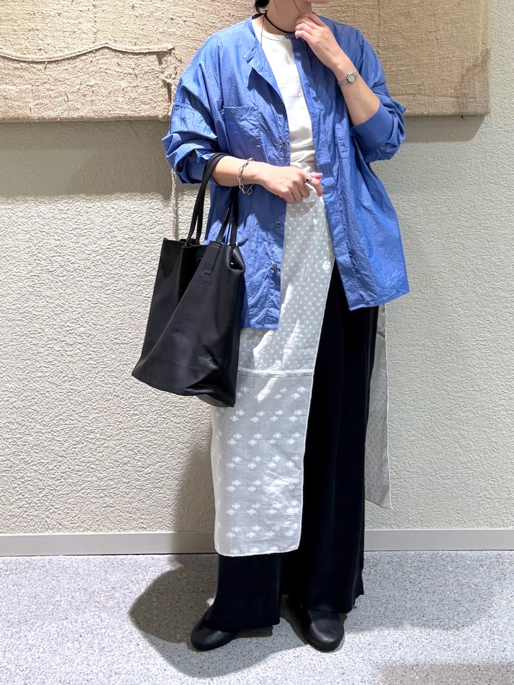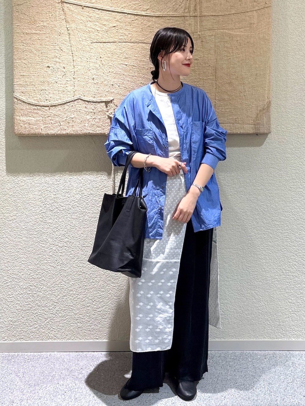 ボタンを開けて羽織として着用。ゆるっとしたシルエットが軽やかな抜け感を演出。