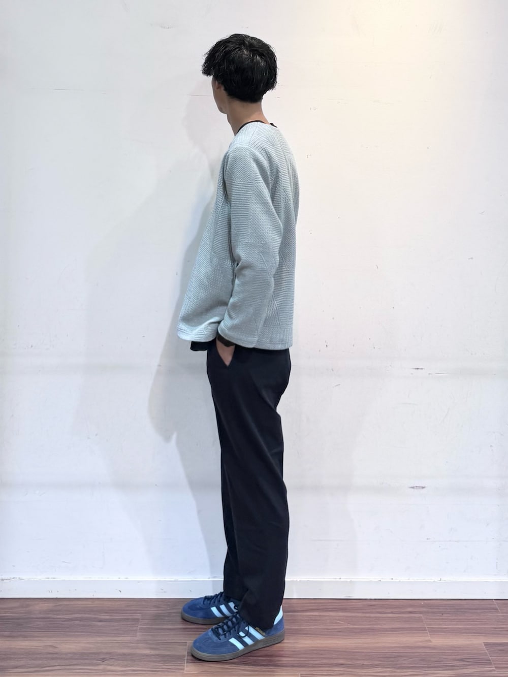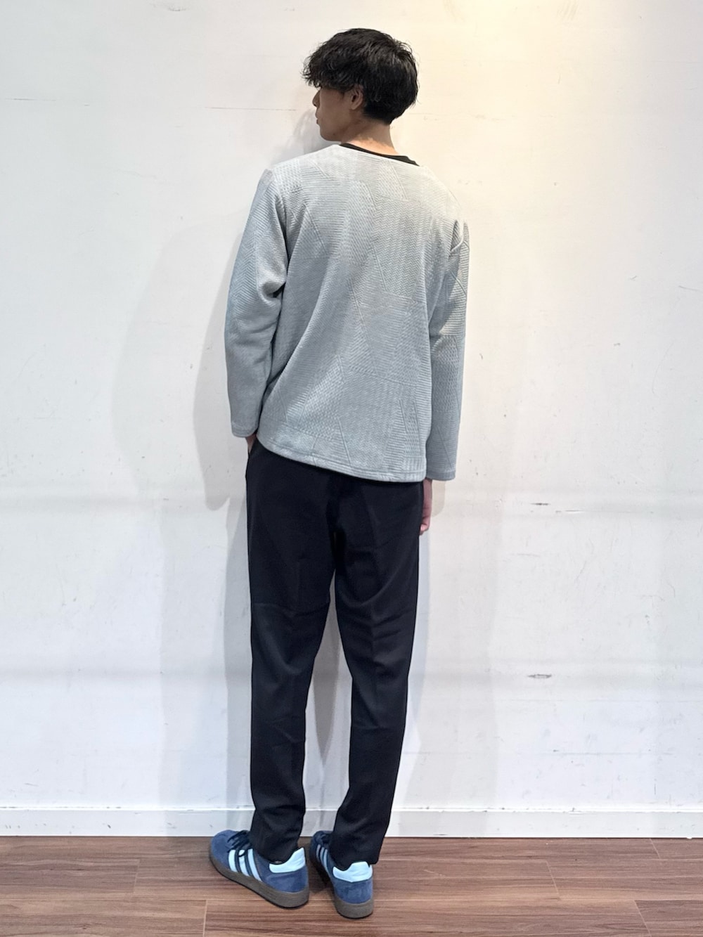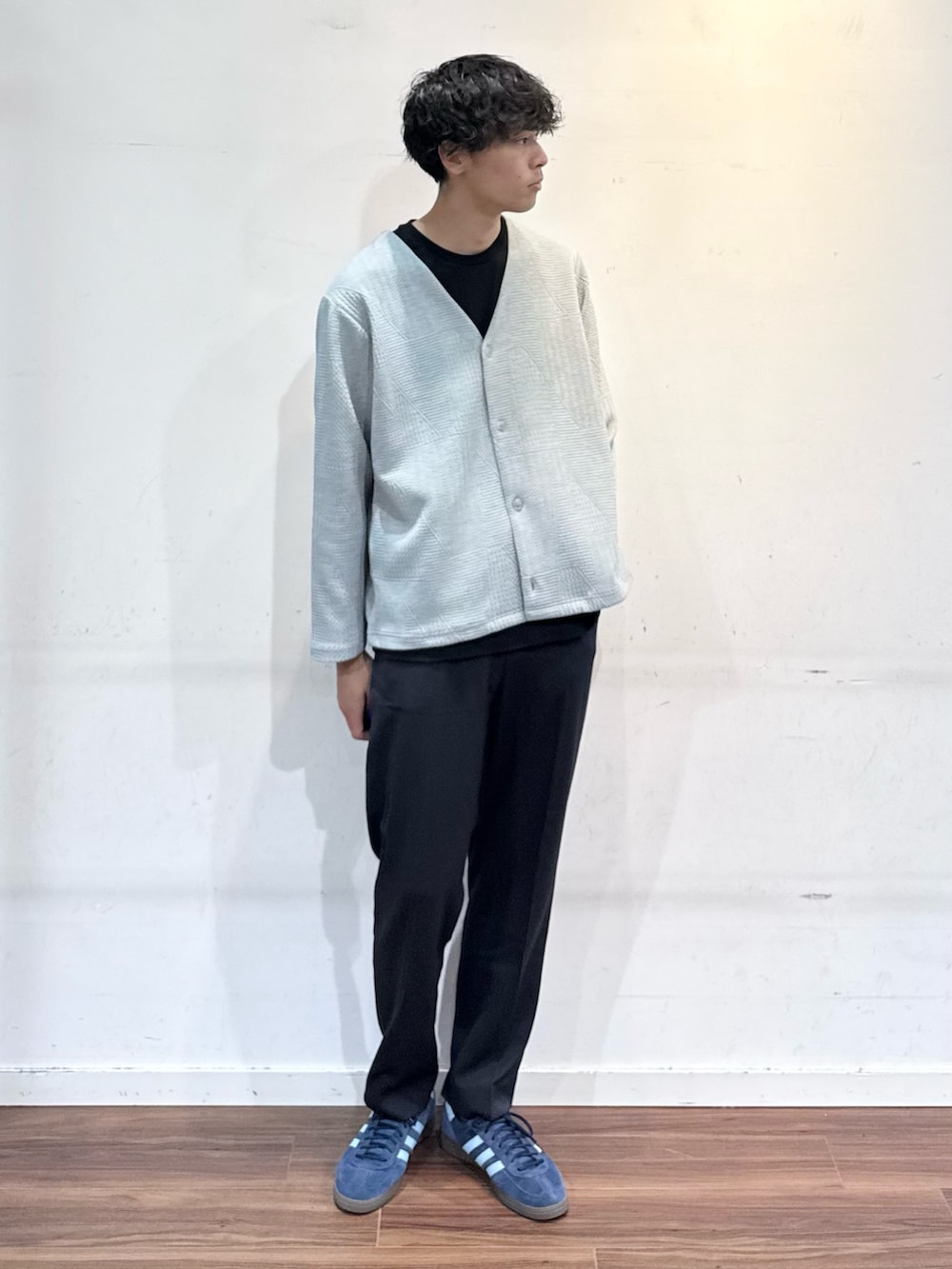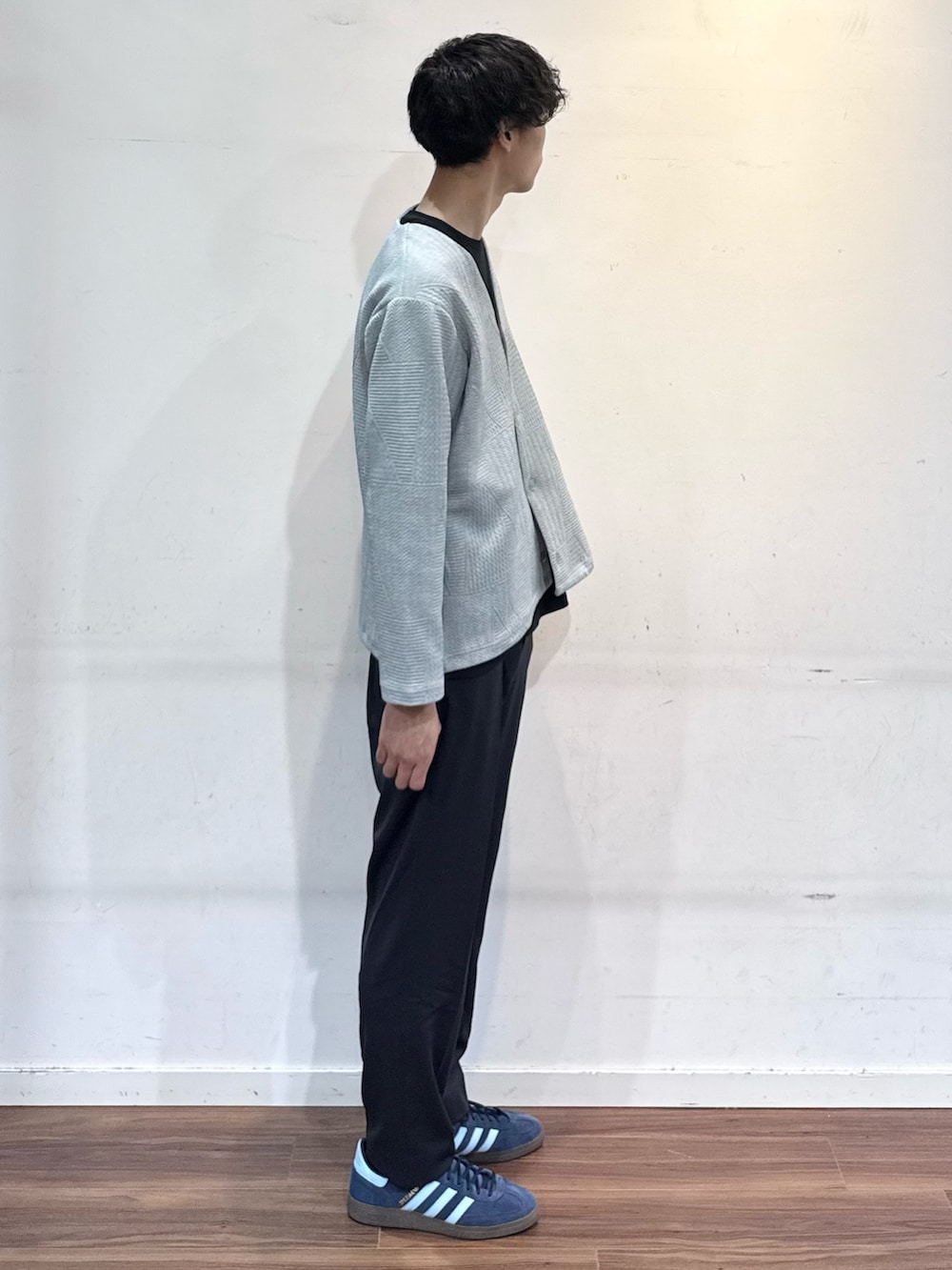 デザイン際立てるためにインナー、スラックスはシンプルなもので。