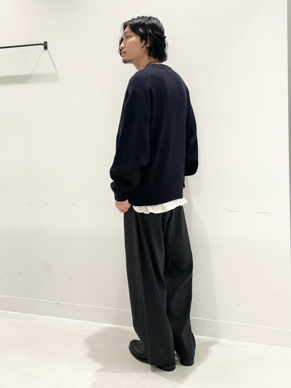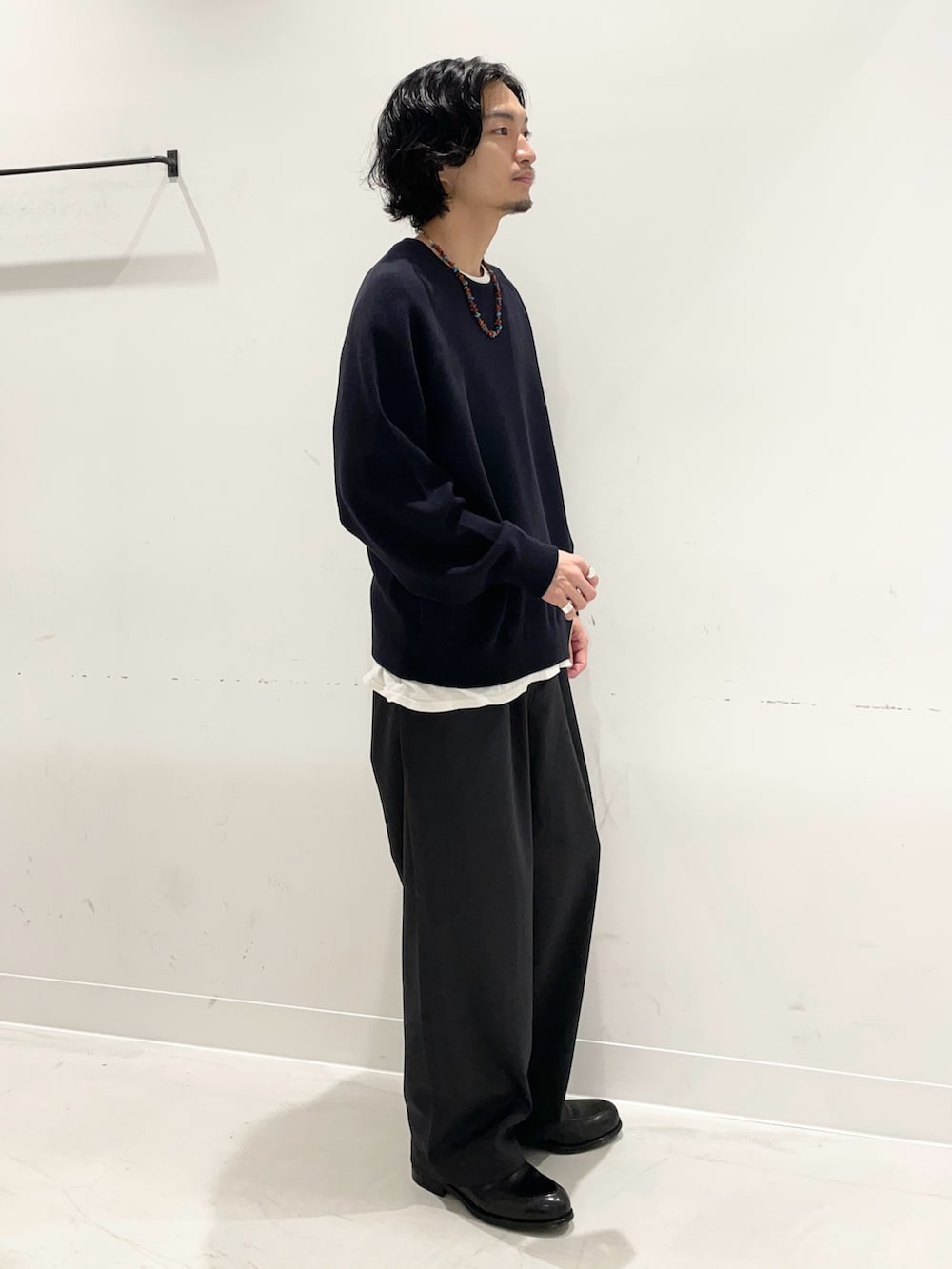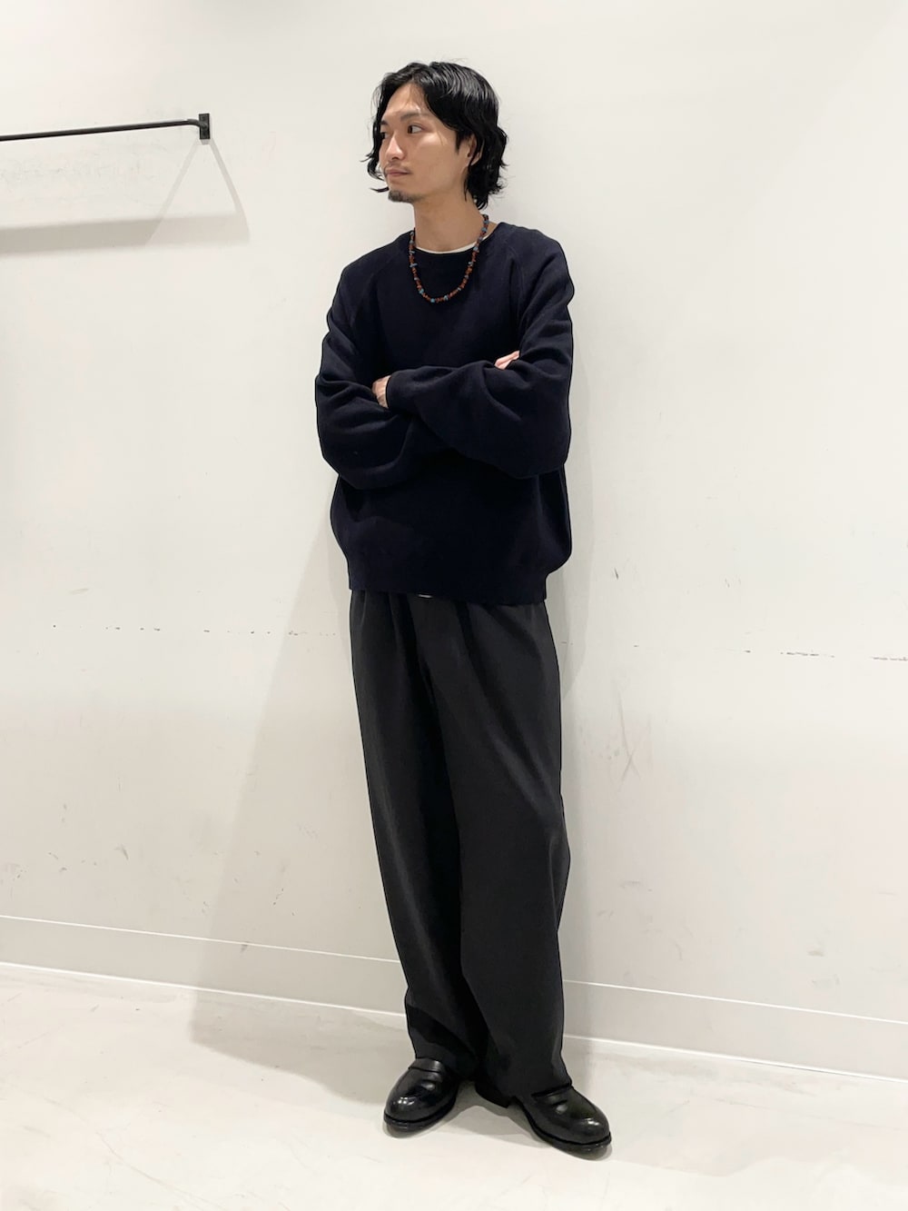 スウェットの様なニットで合わせやすく、スラックス合わせも◎