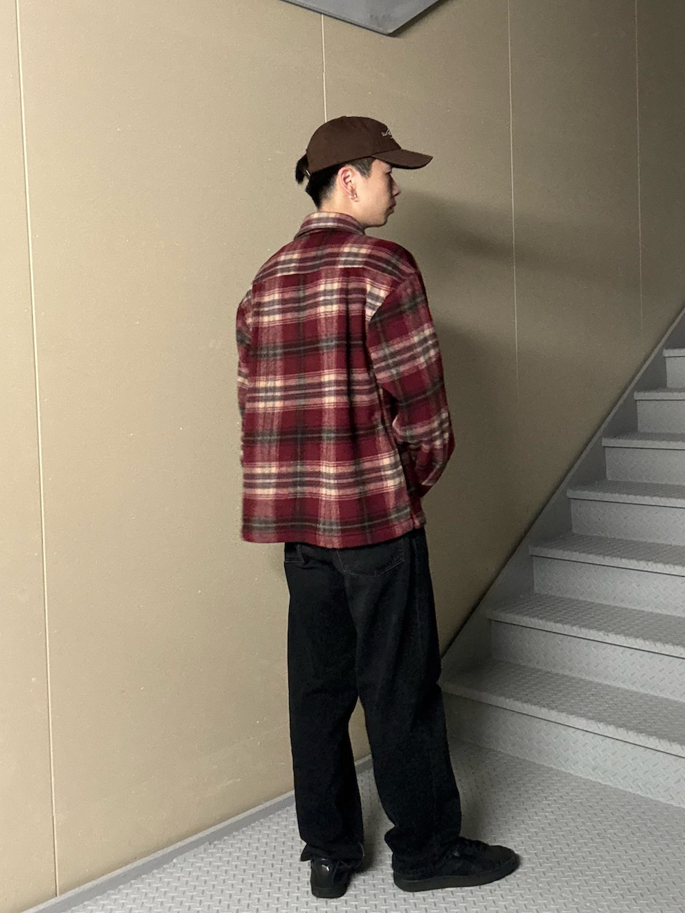 バーガンディ×ブラウンのチェックシャツを主役に、黒のワイドパンツとブラウンキャップでトーンを統一。