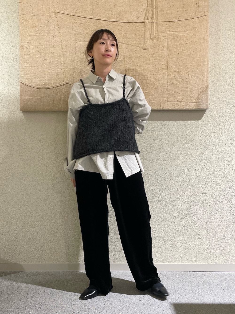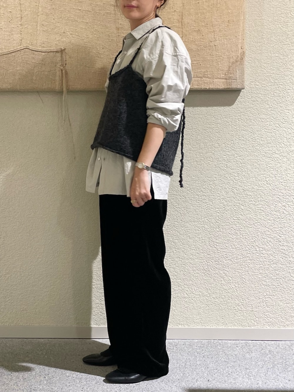 ボトムもとろりとした質感のレーヨンシルクベルベットパンツを合わせました。