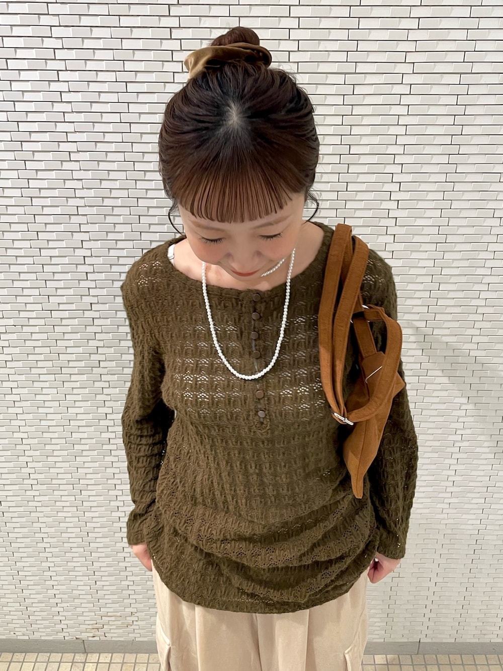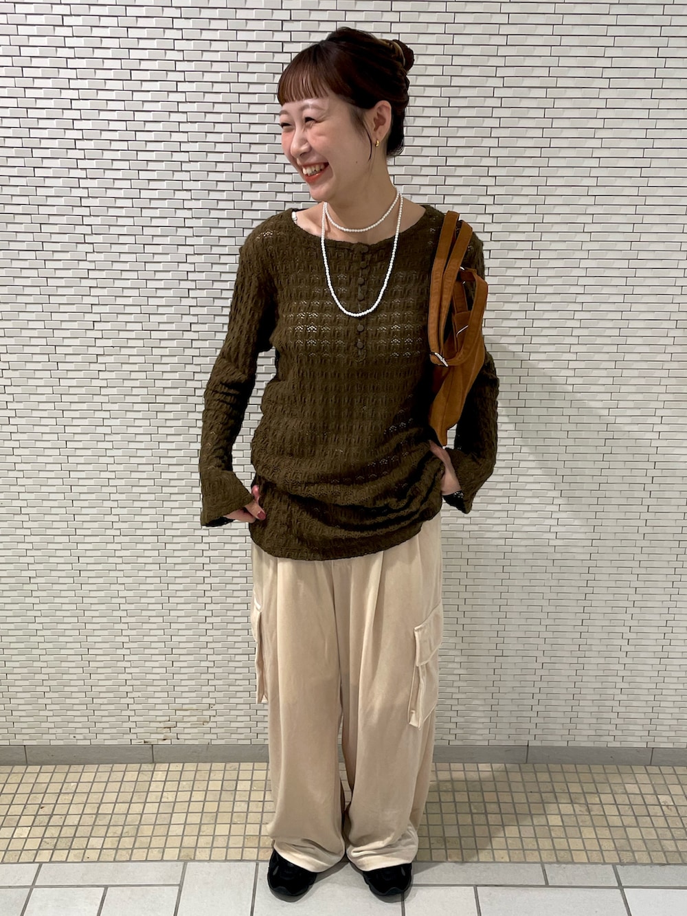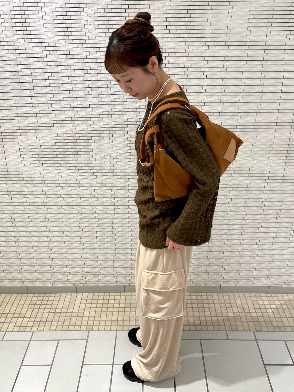 カーキのトップスにアイボリーのパンツで合わせるのが可愛いです🫒🐏