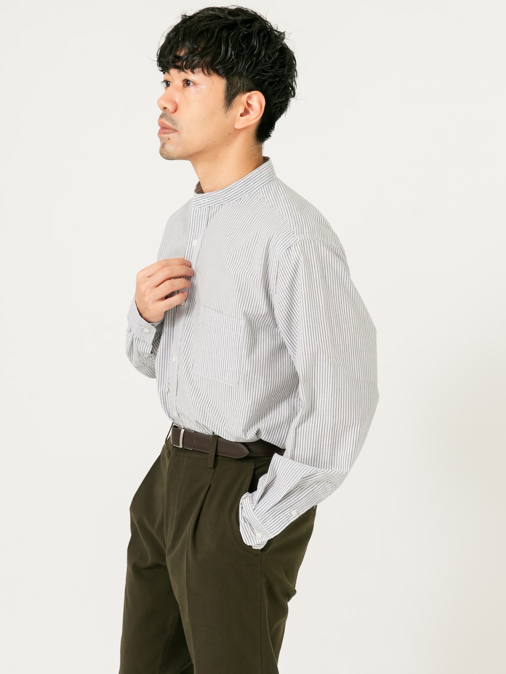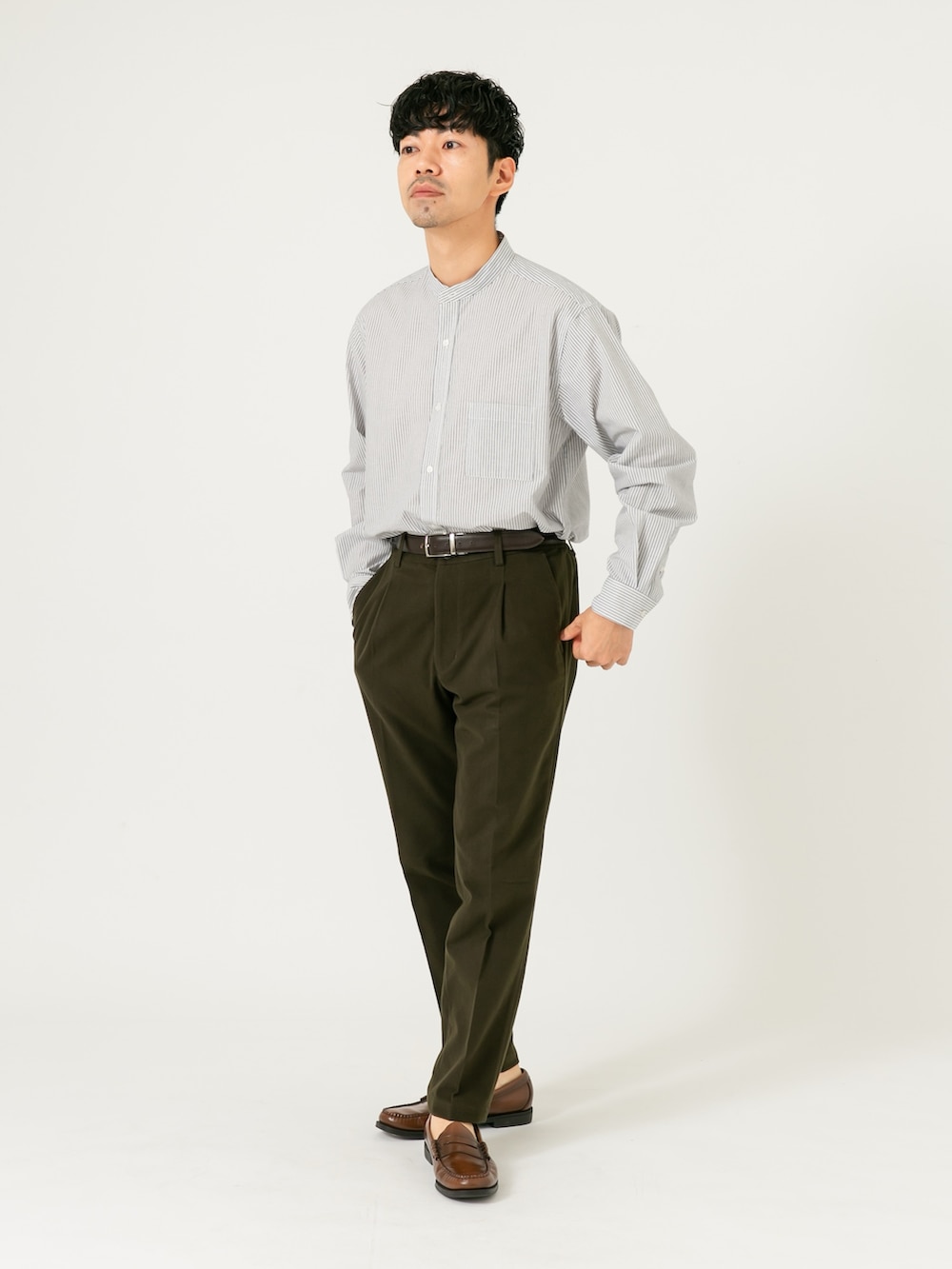 シャツはバンドカラーで決めすぎずスマートか印象に。