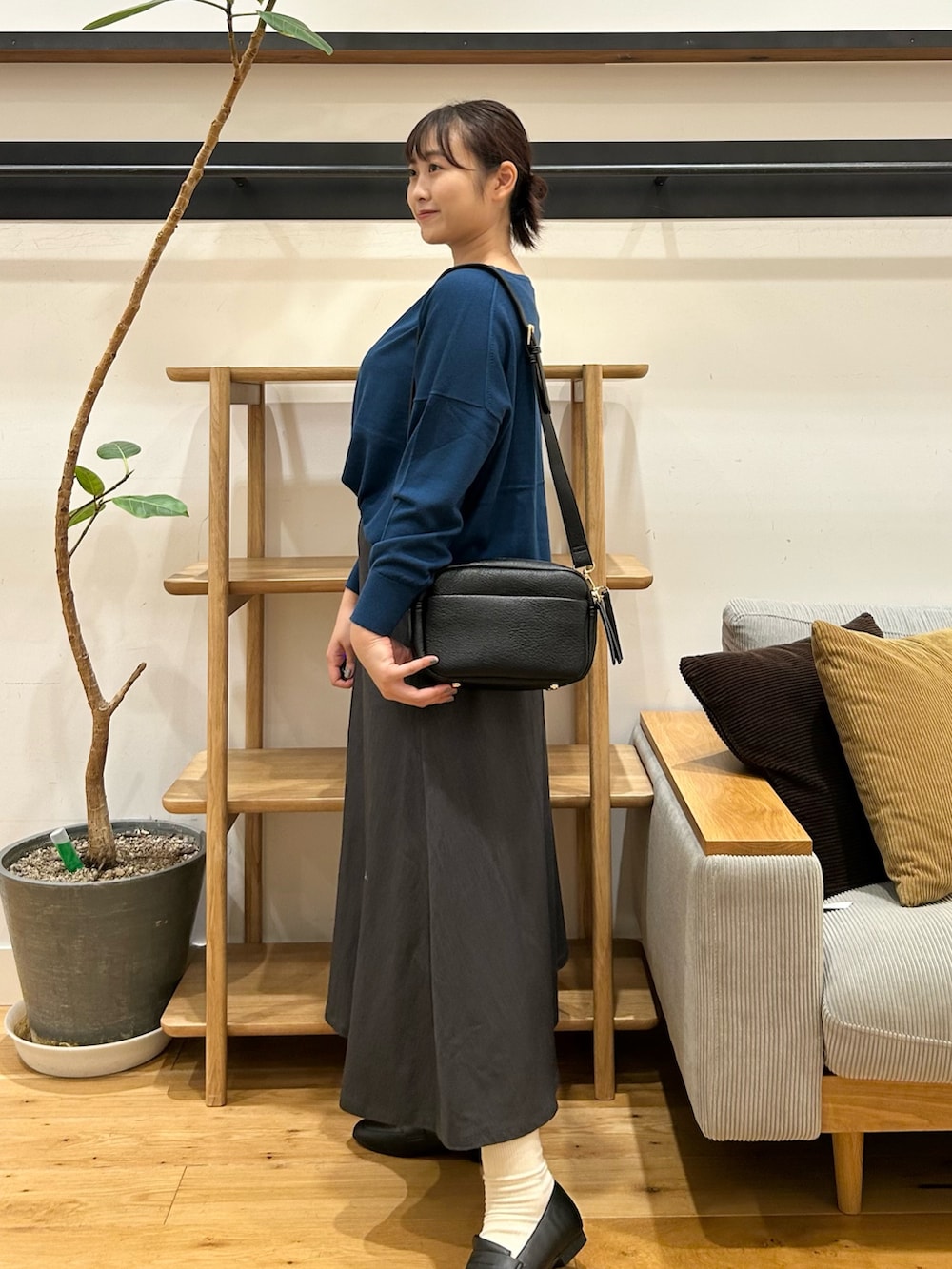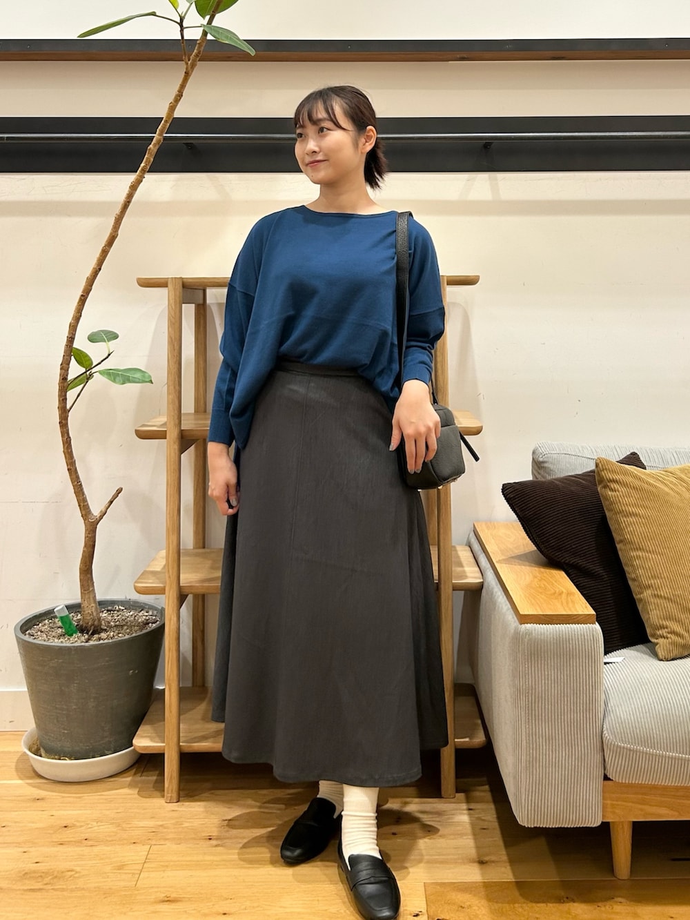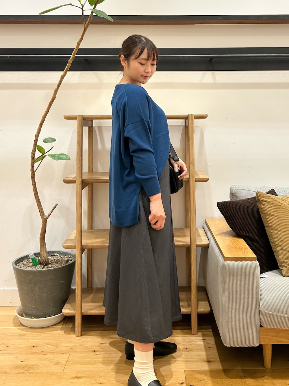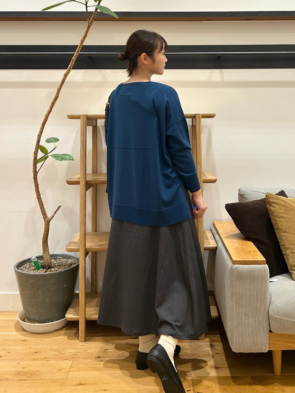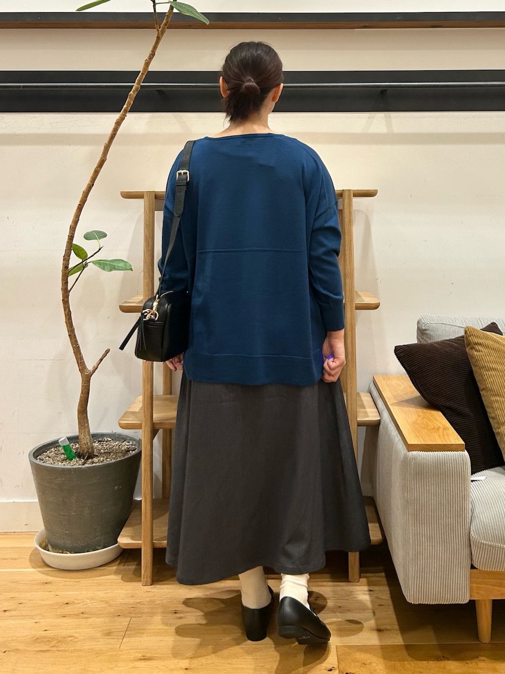 ブルーの薄手ニットは、肌触りの良い極めて柔らかい生地なので、身体のラインを程よく残したまま体型をカバーしてくれます。年代問わず綺麗に着ていただけそうです✨