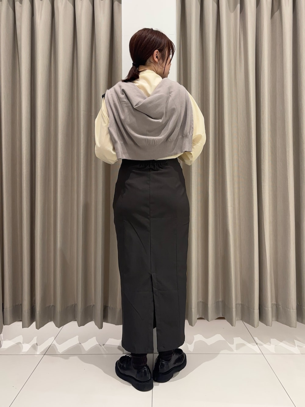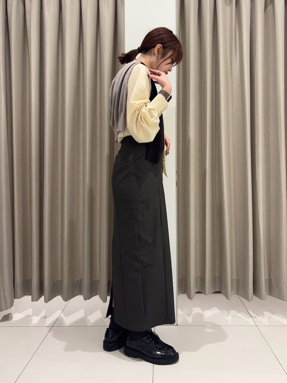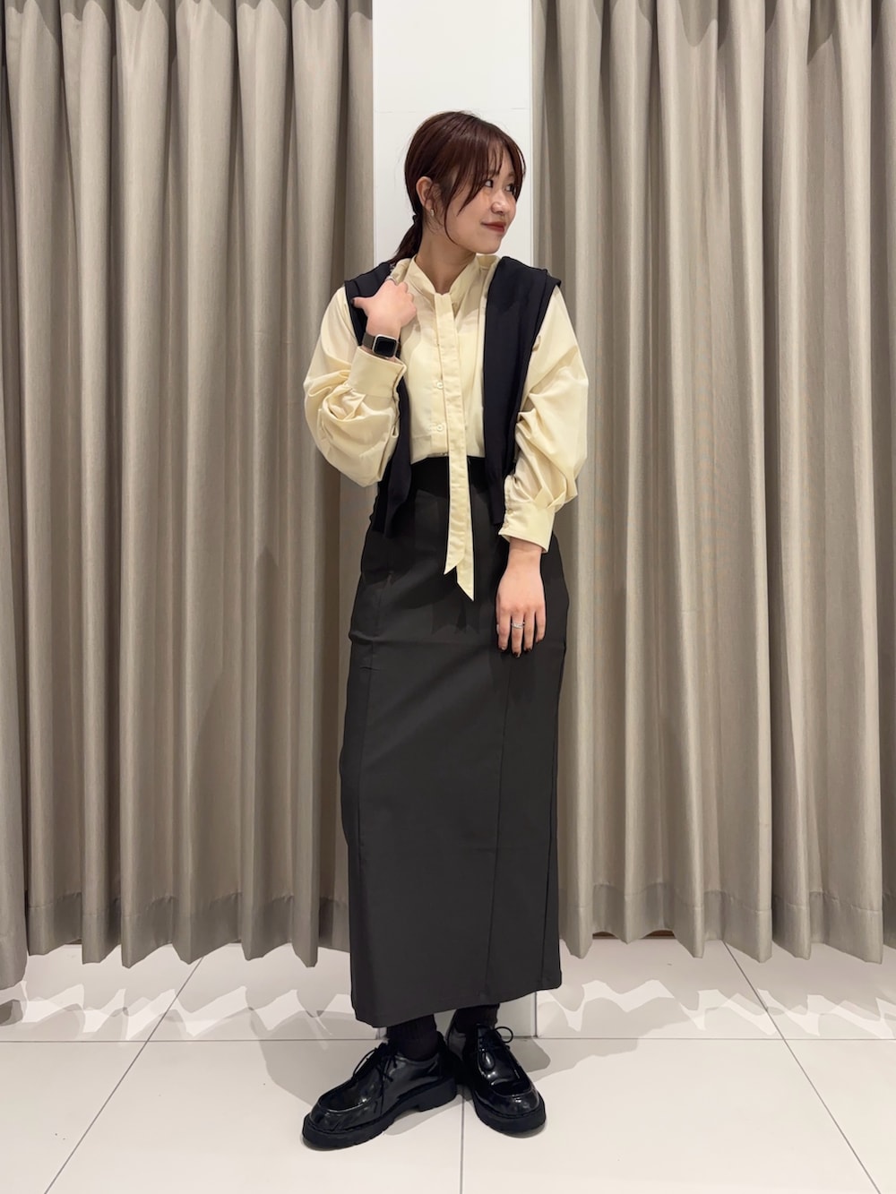 着用のボウタイブラウスはデニム合わせをすればカジュアルダウンできる万能アイテム。