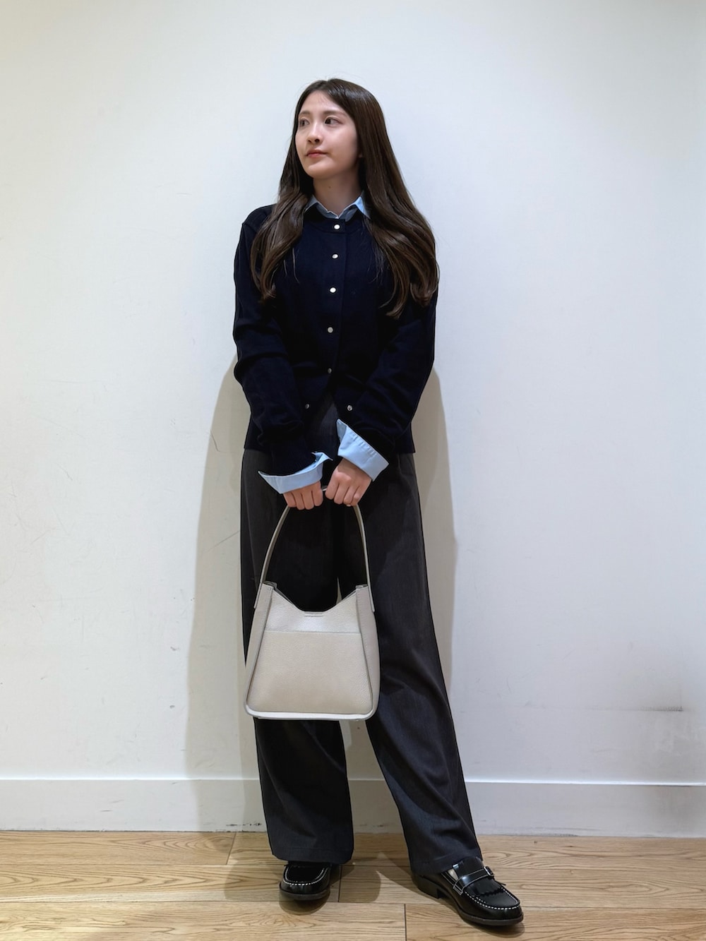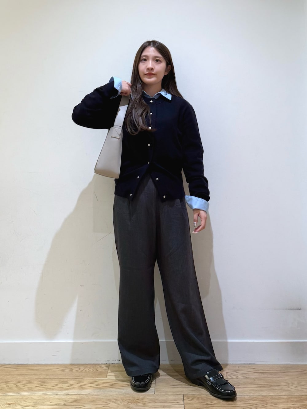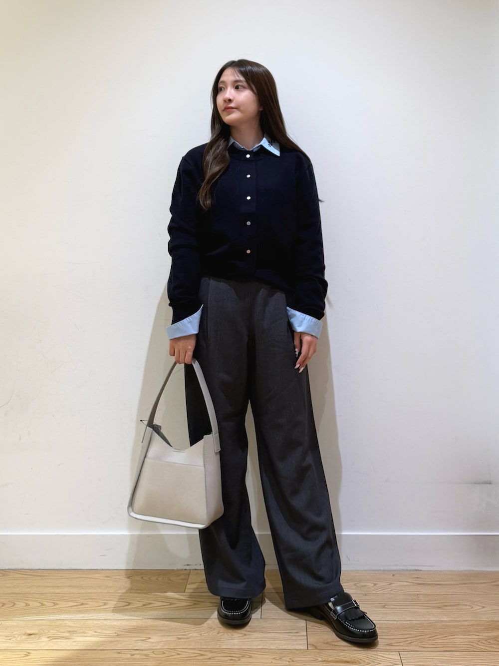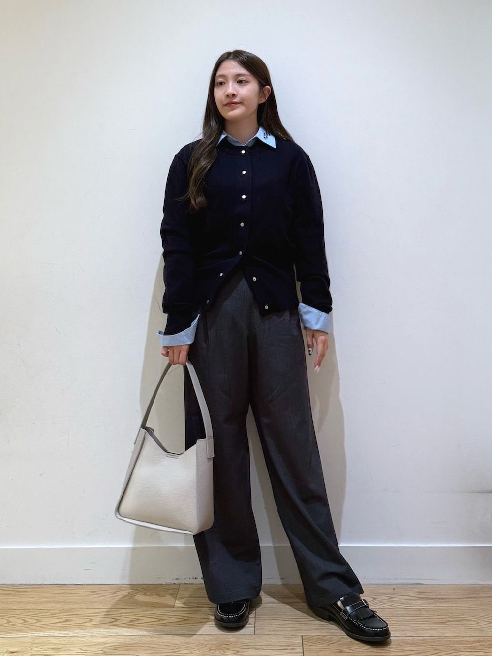 衿ロゴ刺繍カラーシャツは、トップスとしてもニットなどのインナーでも羽織でも使えるので1枚持っておくと便利です!