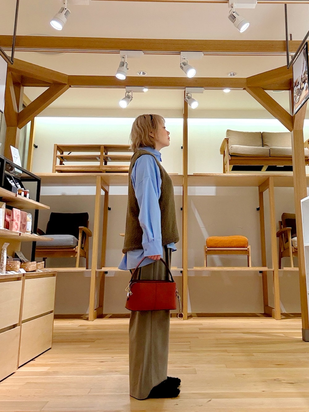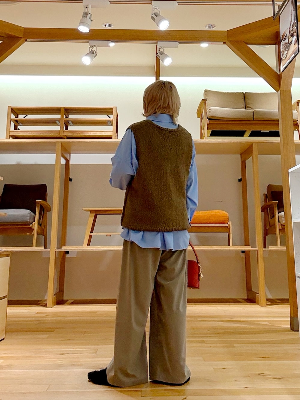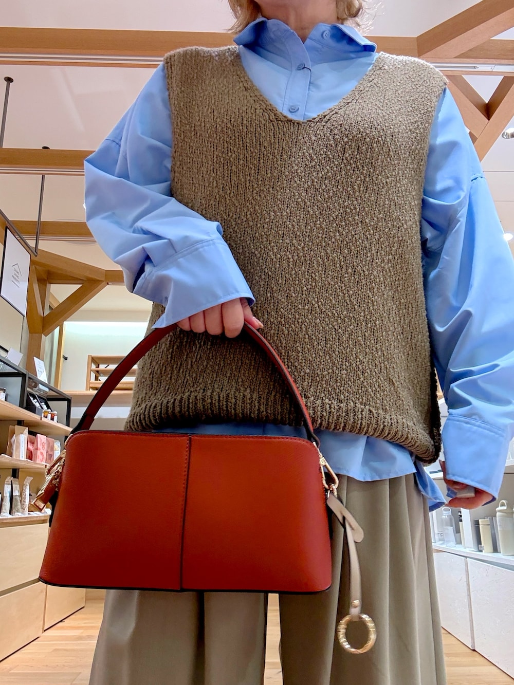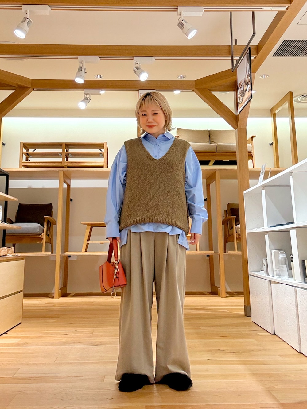 この時期に着たくなるブラウンやベージュ、何かぼやけるなとかこの色味むずかしいと感じる時におすすめなのがブルーのシャツです。さわやかな色味がポイントになり顔色がぼやけにくいのでおすすめです。パンツはきちんと感がでるのにウエストゴムのイージーパンツを合わせてみました。ラインがキレイで楽ちんな最高のパンツです。小物のバッグに差し色オレンジを足して秋色コーデにしました。