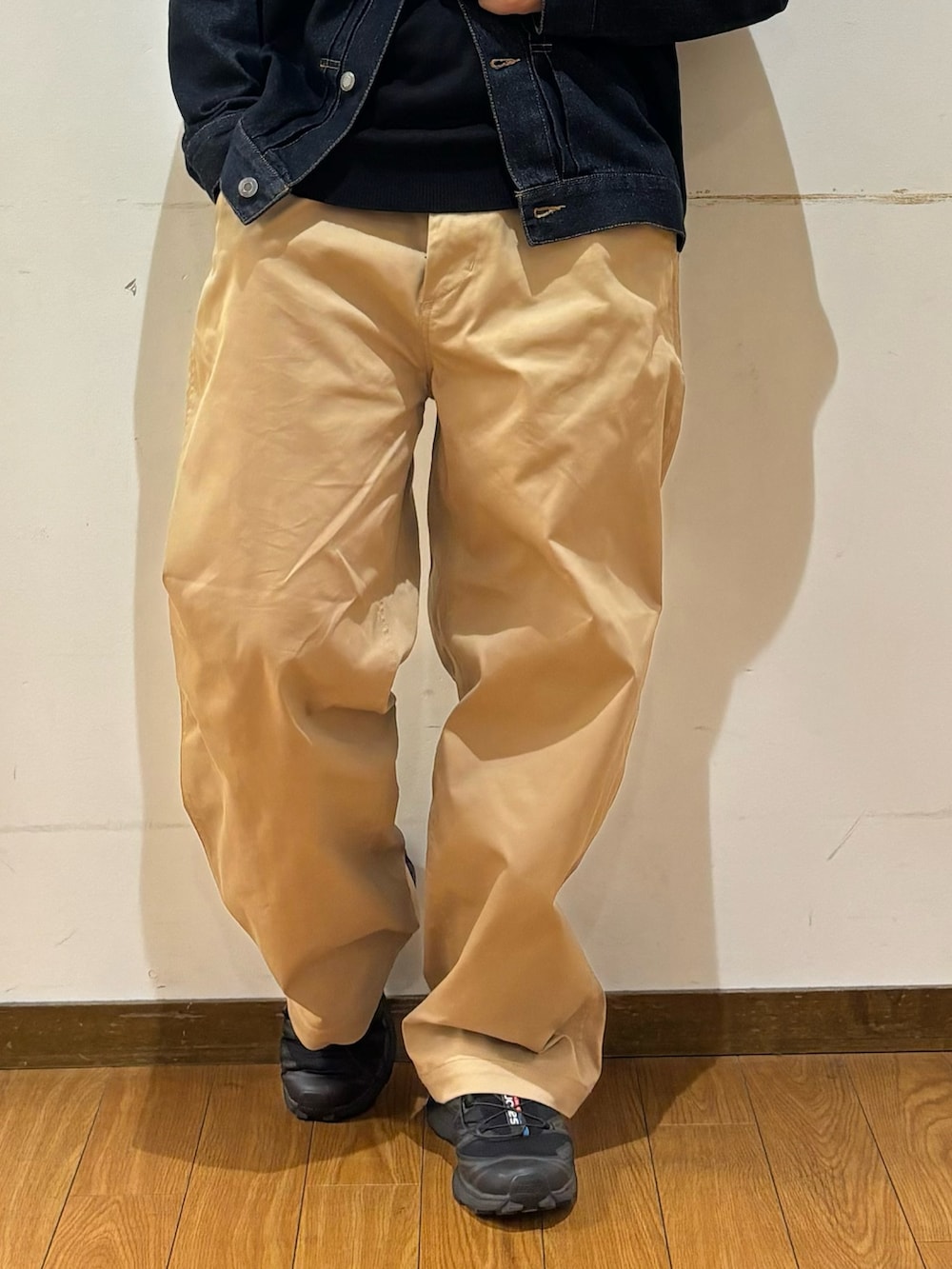 ウエストのベルトとワイドなシルエットが特徴的なパンツで、秋冬に使いやすいベージュもポイントです!