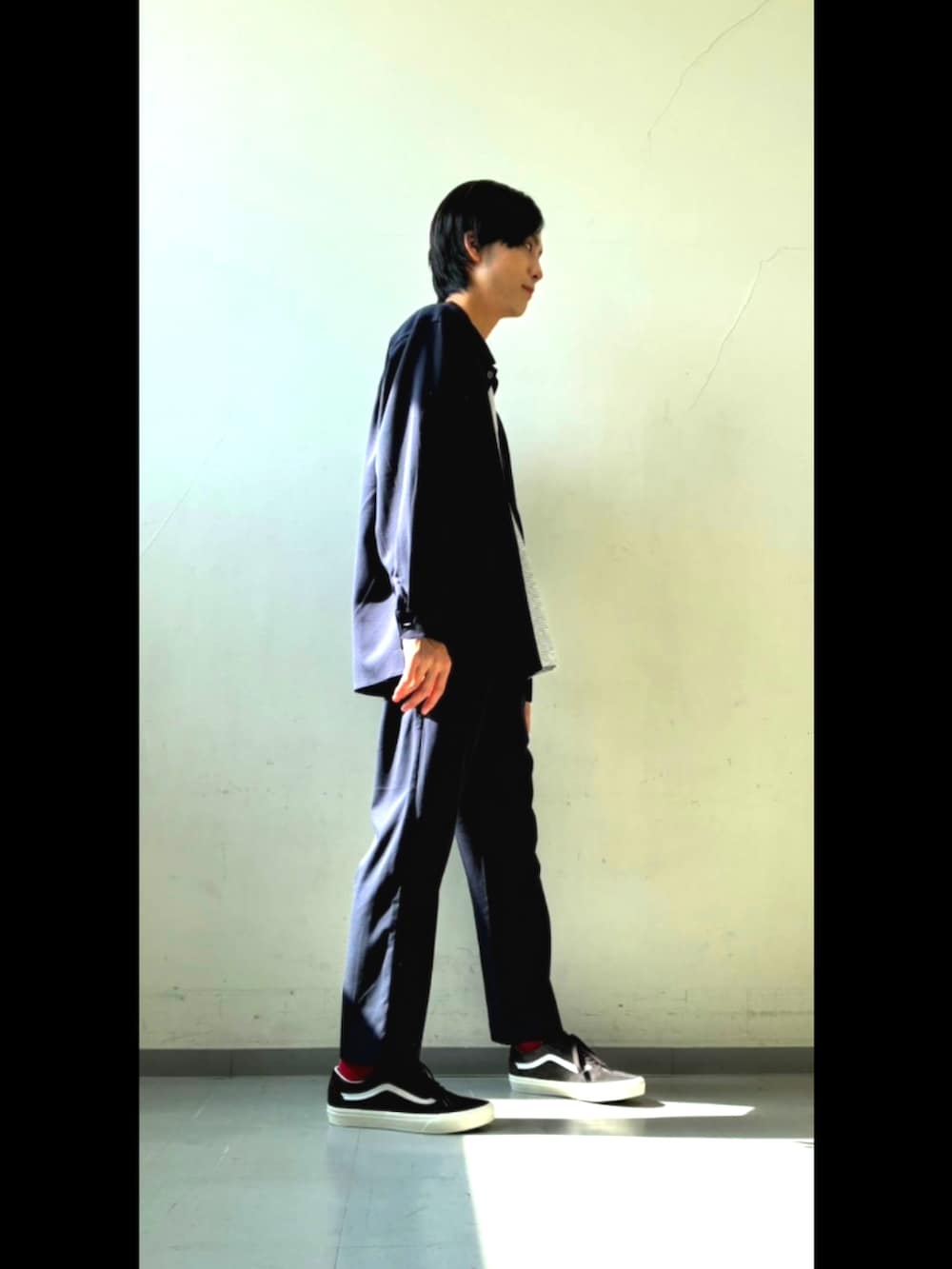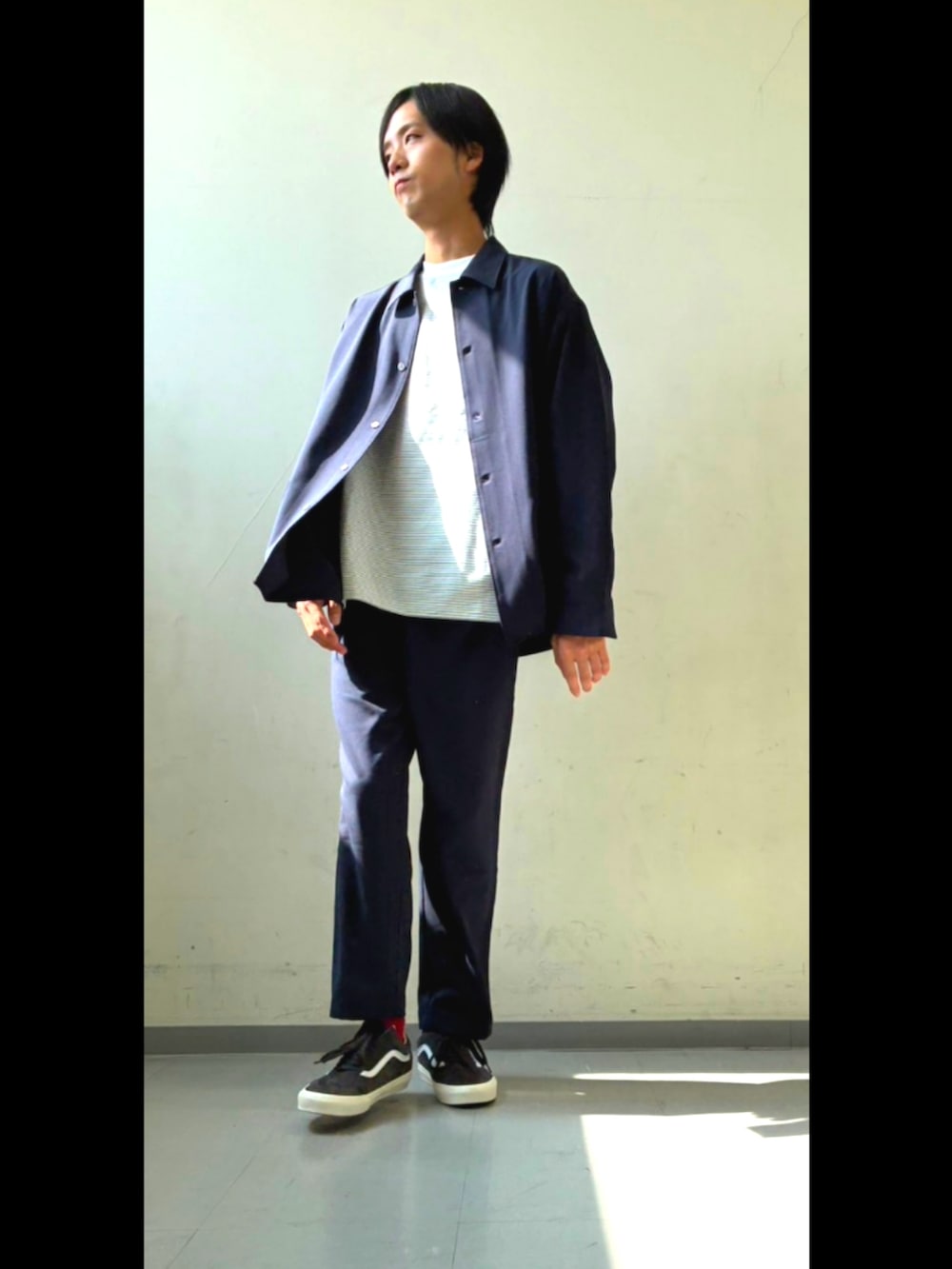 落ち着いたネイビーのセットアップに、カジュアルなボーダーでバランスをとりました。