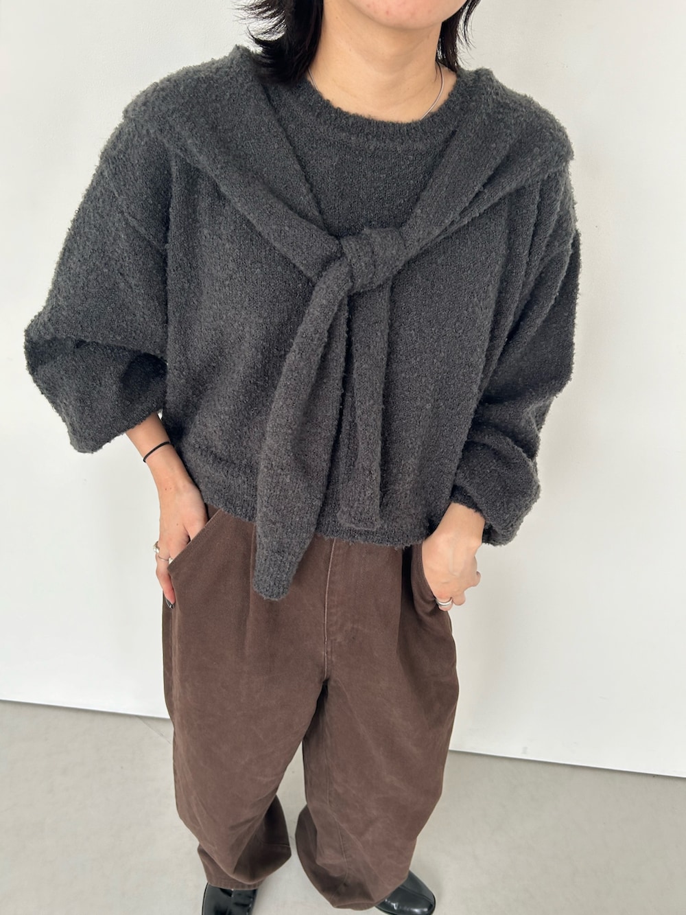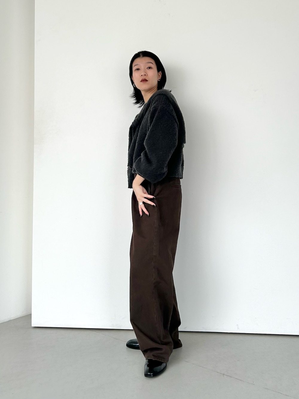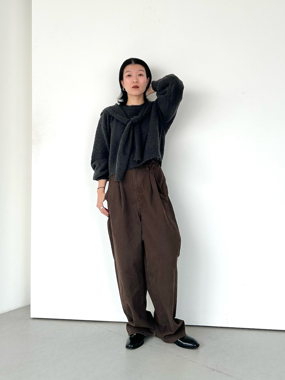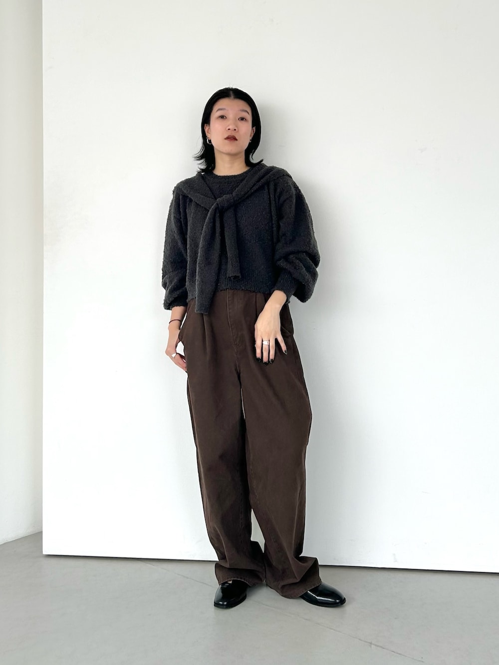 合わせたパンツはウエストがフリルになっていて、トップスインのスタイルも
