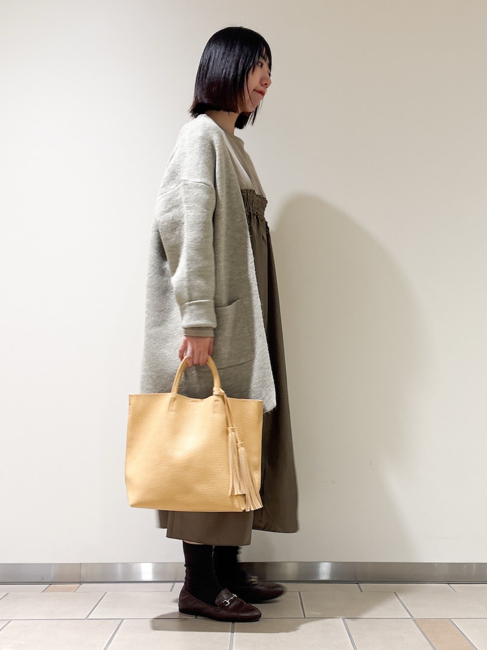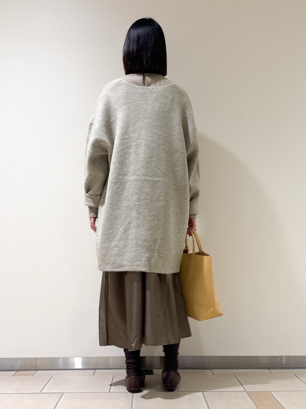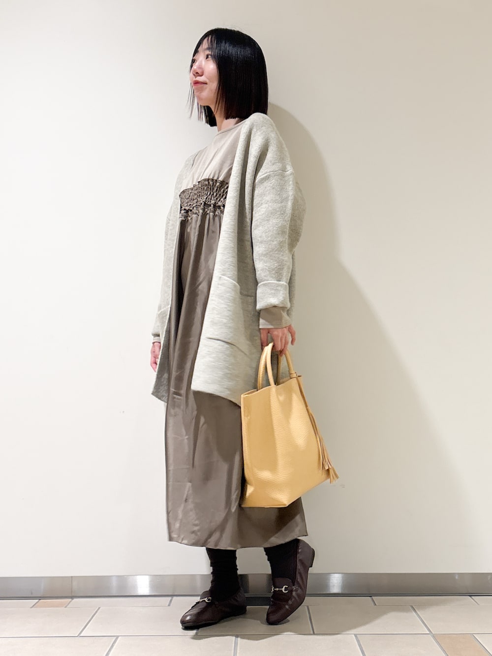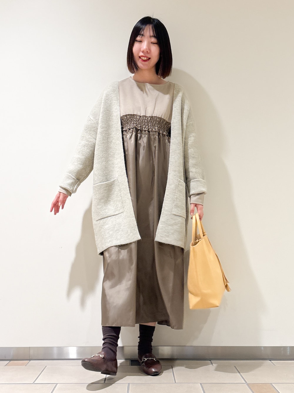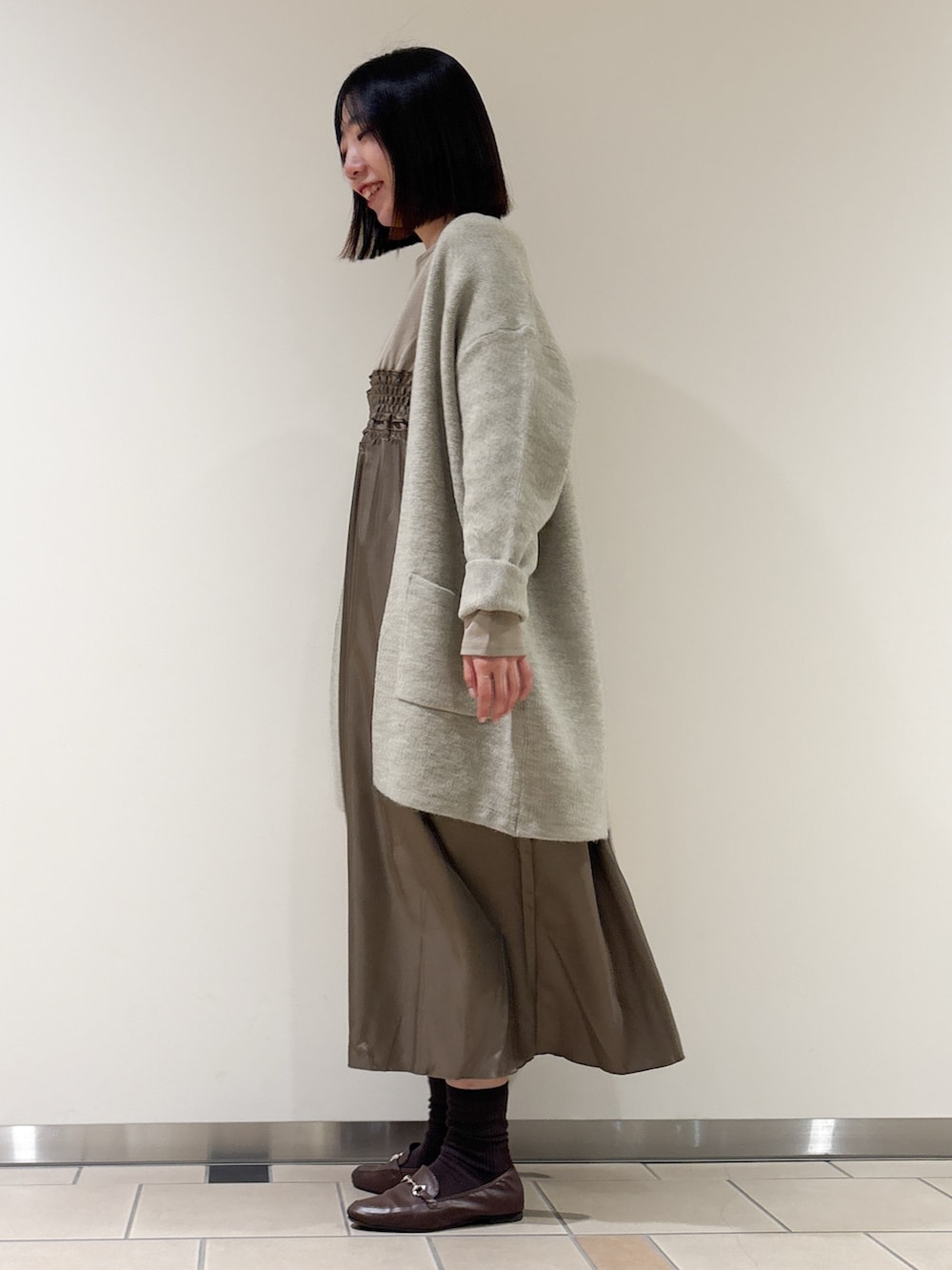 今回はワンピースと合わせました。シャーリングデザインとスカート部分に光沢があり上品見えします♩