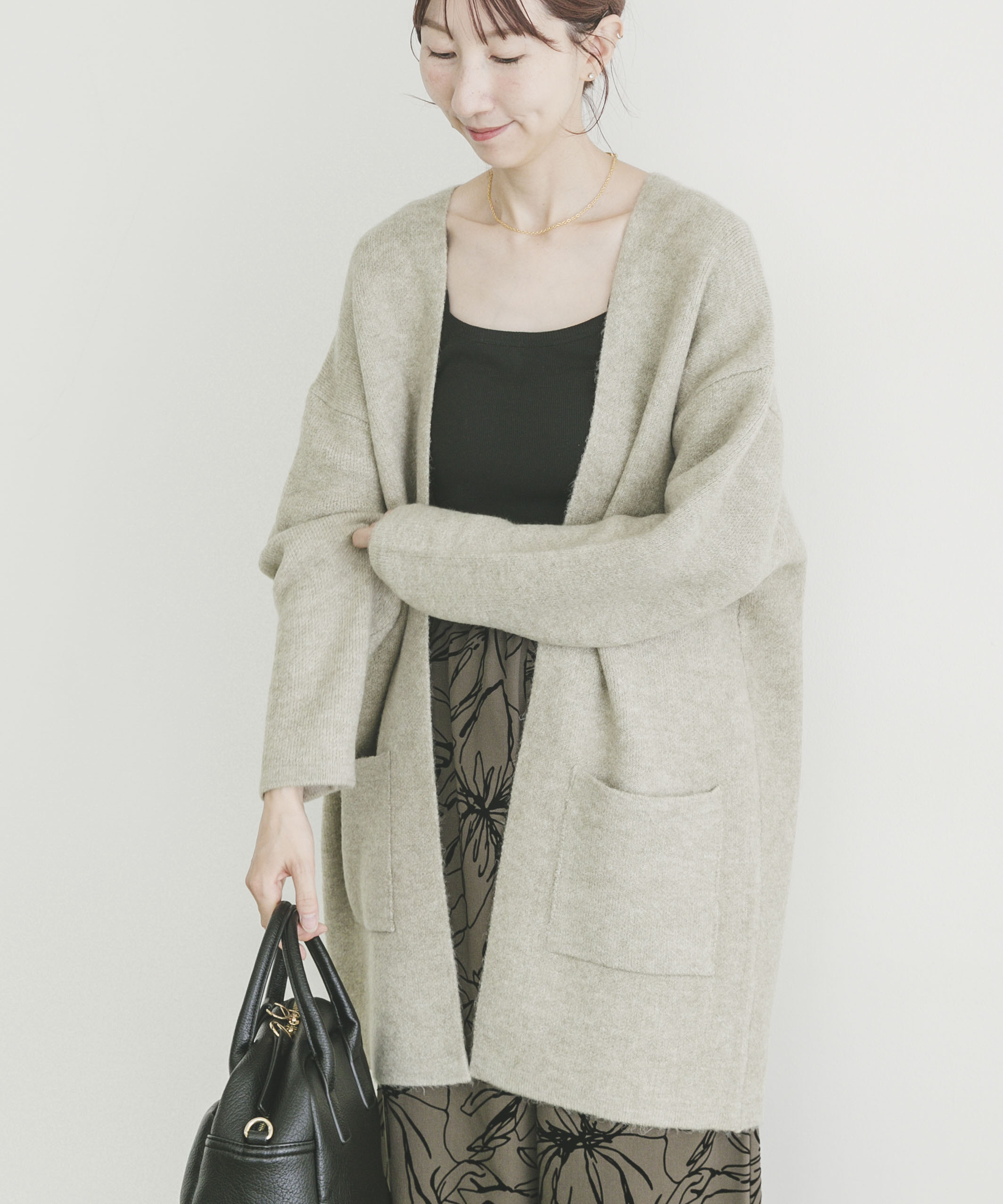 ボタンが無くさっと羽織れるニットガウンです◎しっかり肉厚な生地が安心感もあり、着丈も長いのでこれから冷える季節にぴったり^^