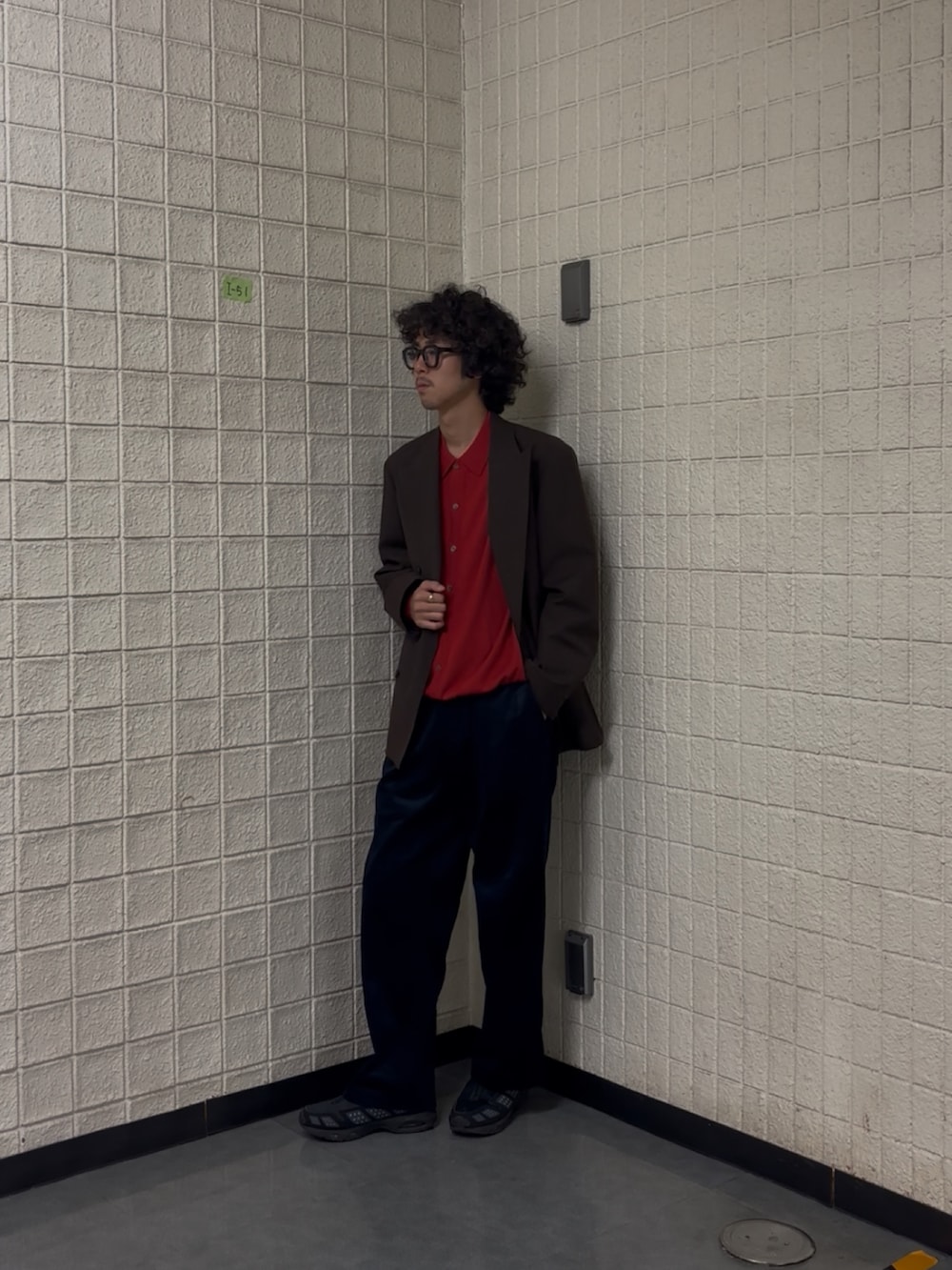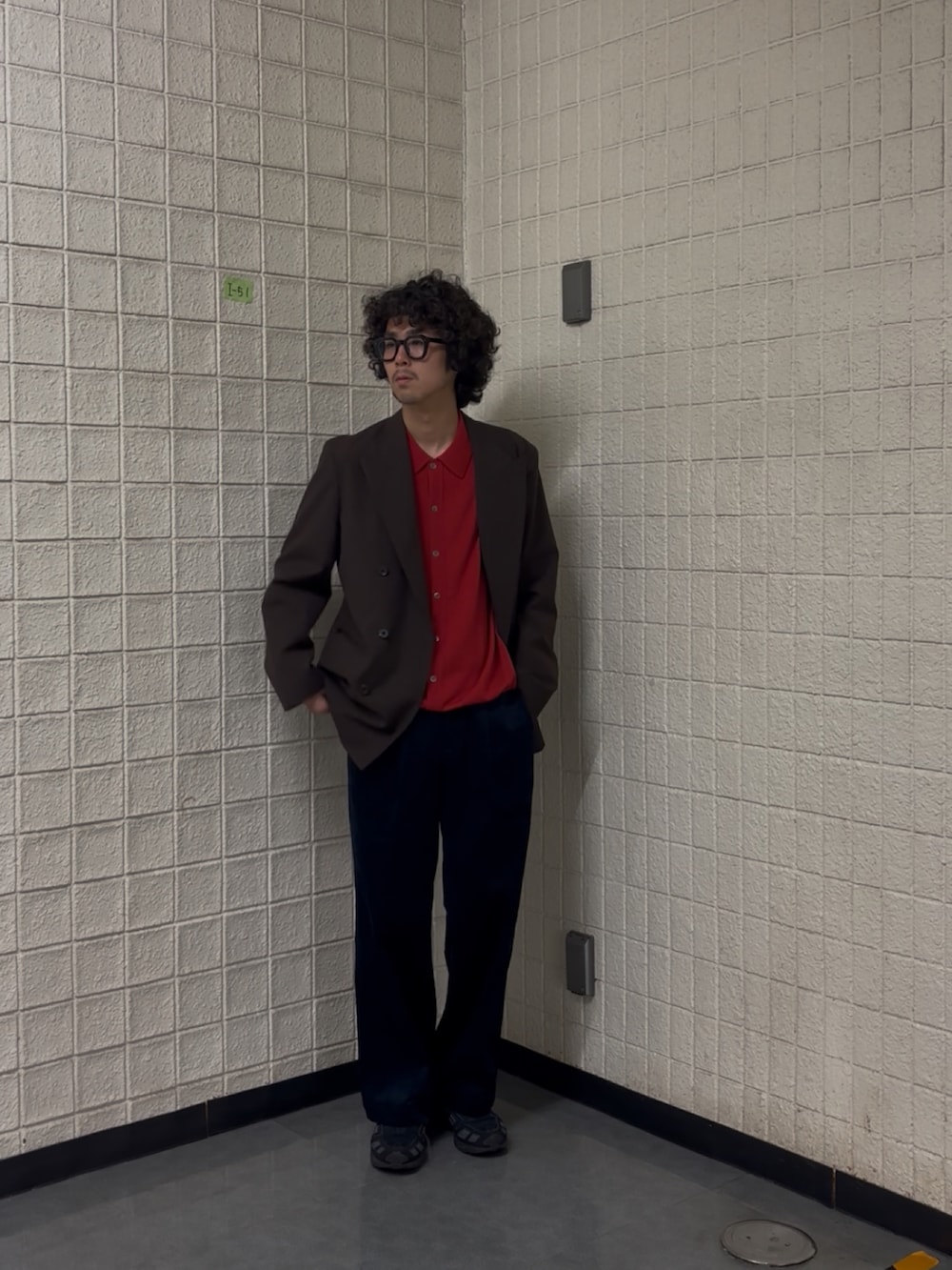 差し色の赤で、重くなりがちな秋服のスタイルに立体感を出しました。