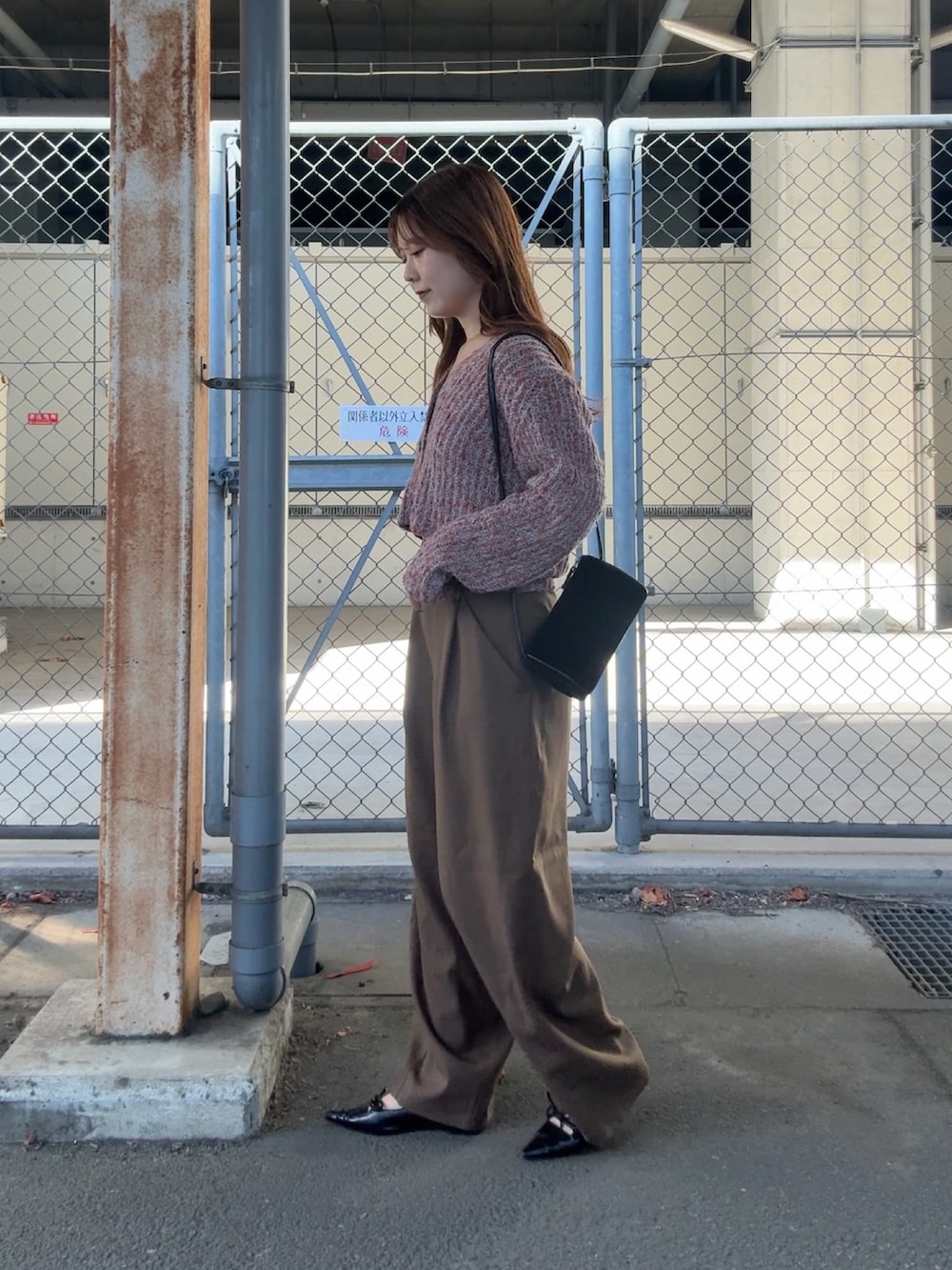 スラックスは、ウエストがボタンで2段階調節できるのでローウエスト気味にも使っていただけます!秋冬ぽい温かみのある生地感です!