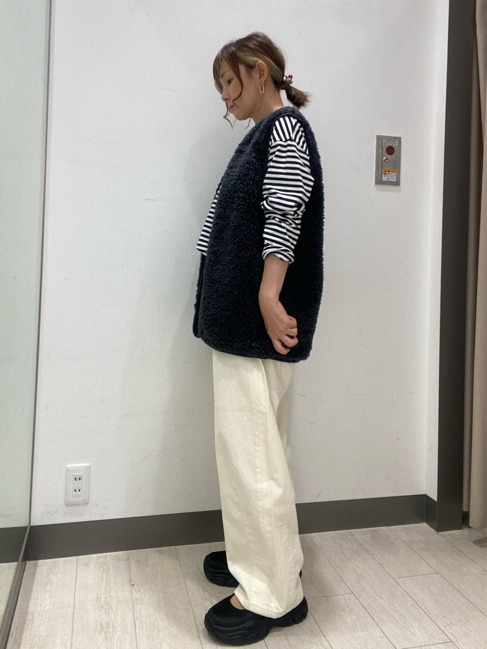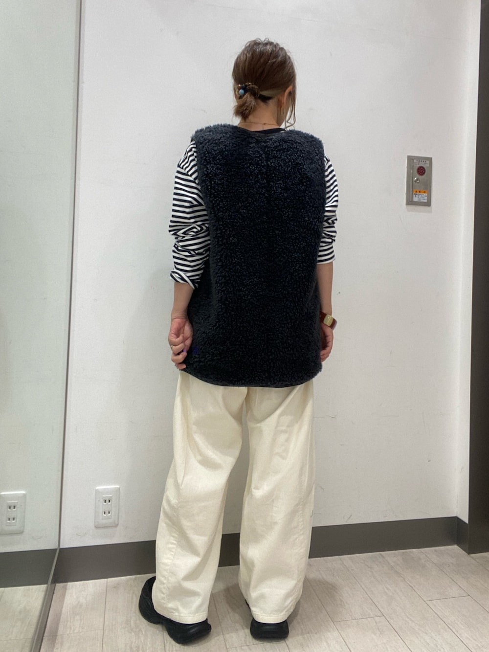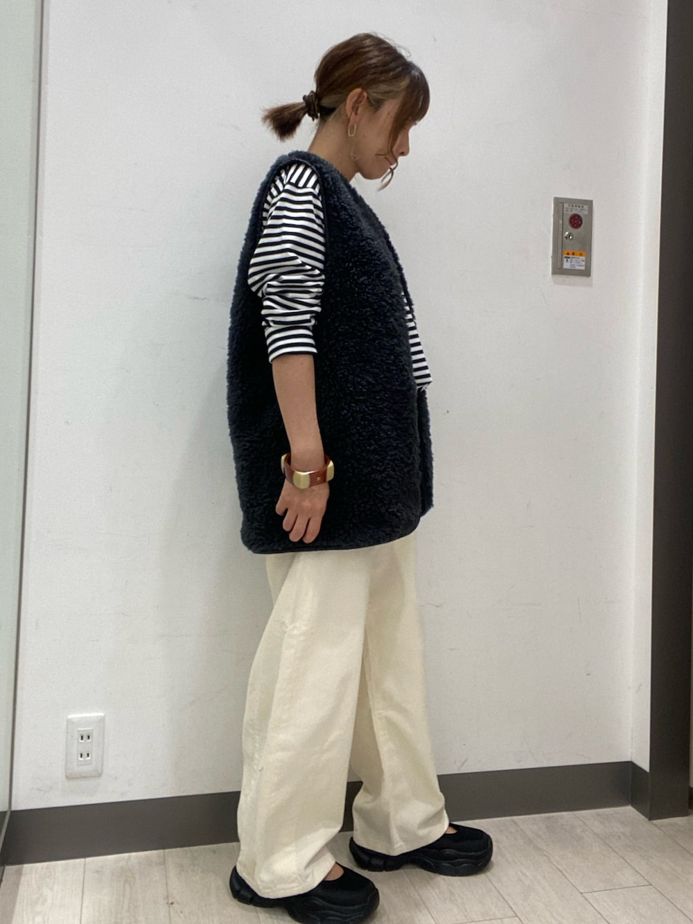 パンツはアイボリーの色みが、色々なトップスの色に合わせやすく、裾に向かってカーブしているのでシルエットがキレイです!