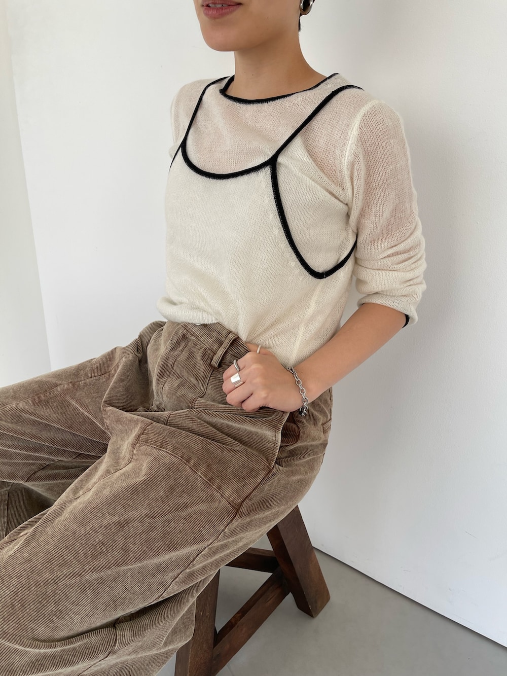 シアーニットには温かみのある冬らしいボトムを合わせるのがおすすめです✨