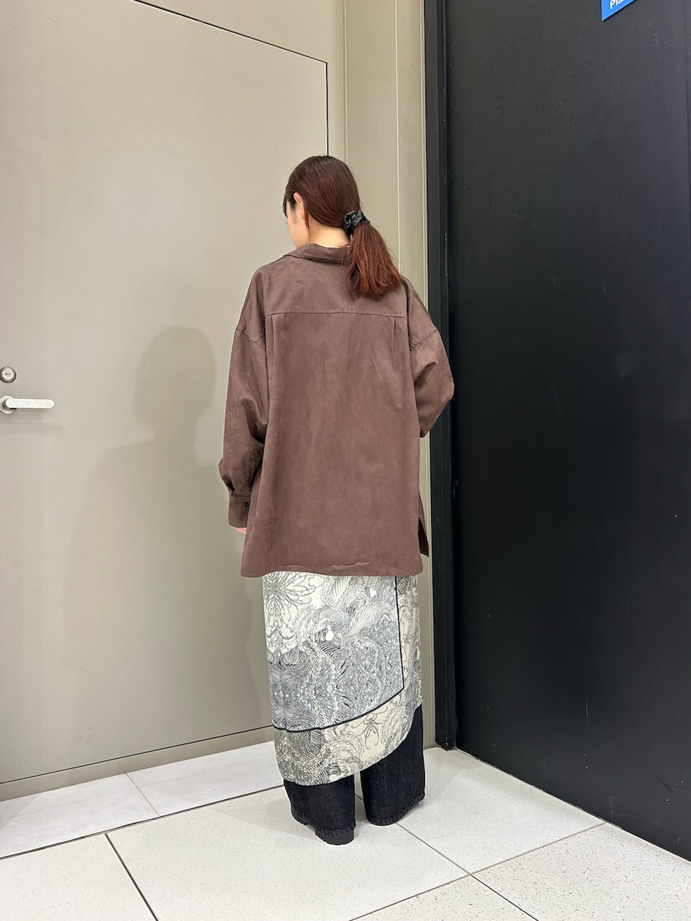 スエードのマットなコーディネートに、スカーフのツヤ感を足して今っぽく。いろんなアレンジが楽しめそうです!!