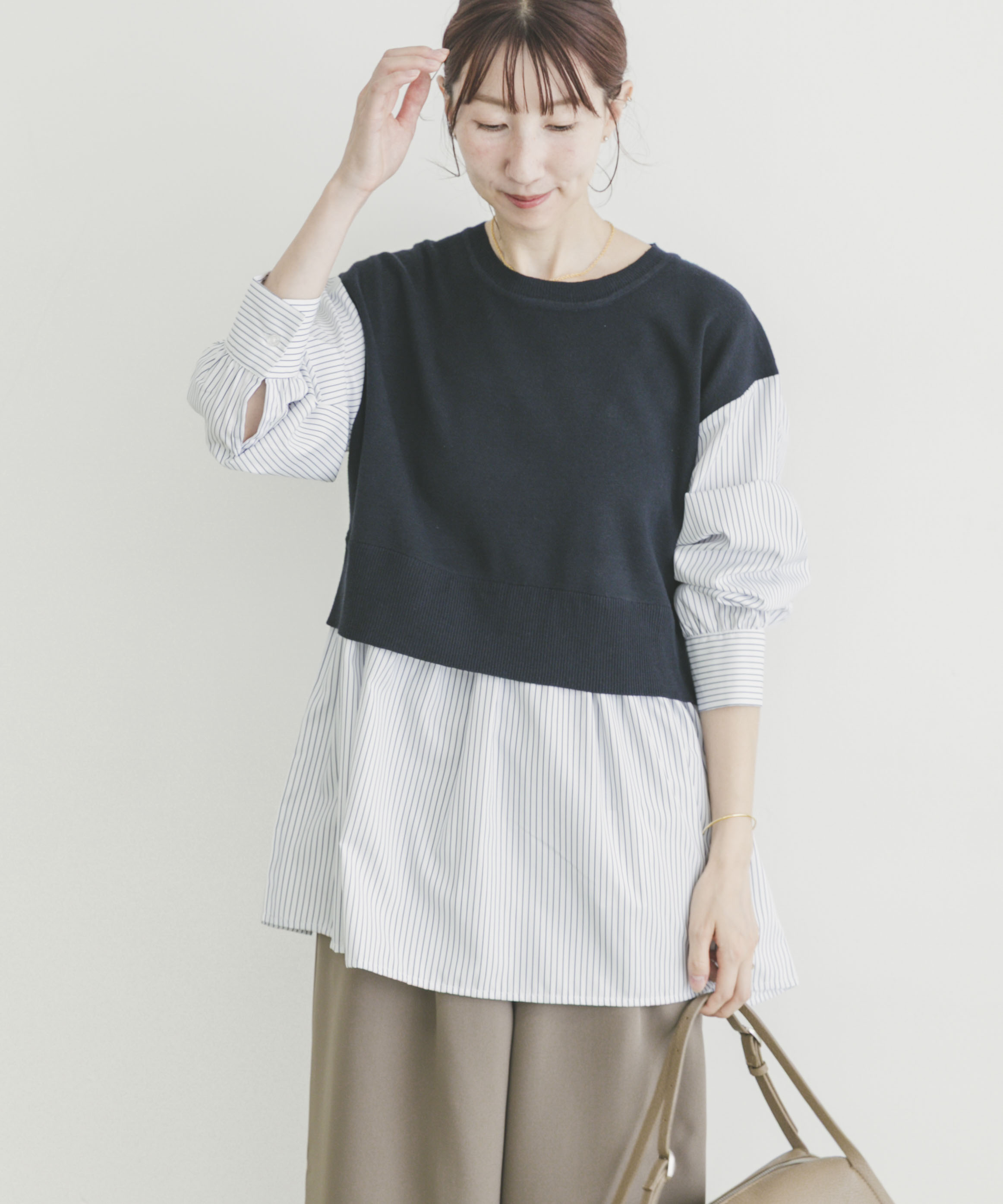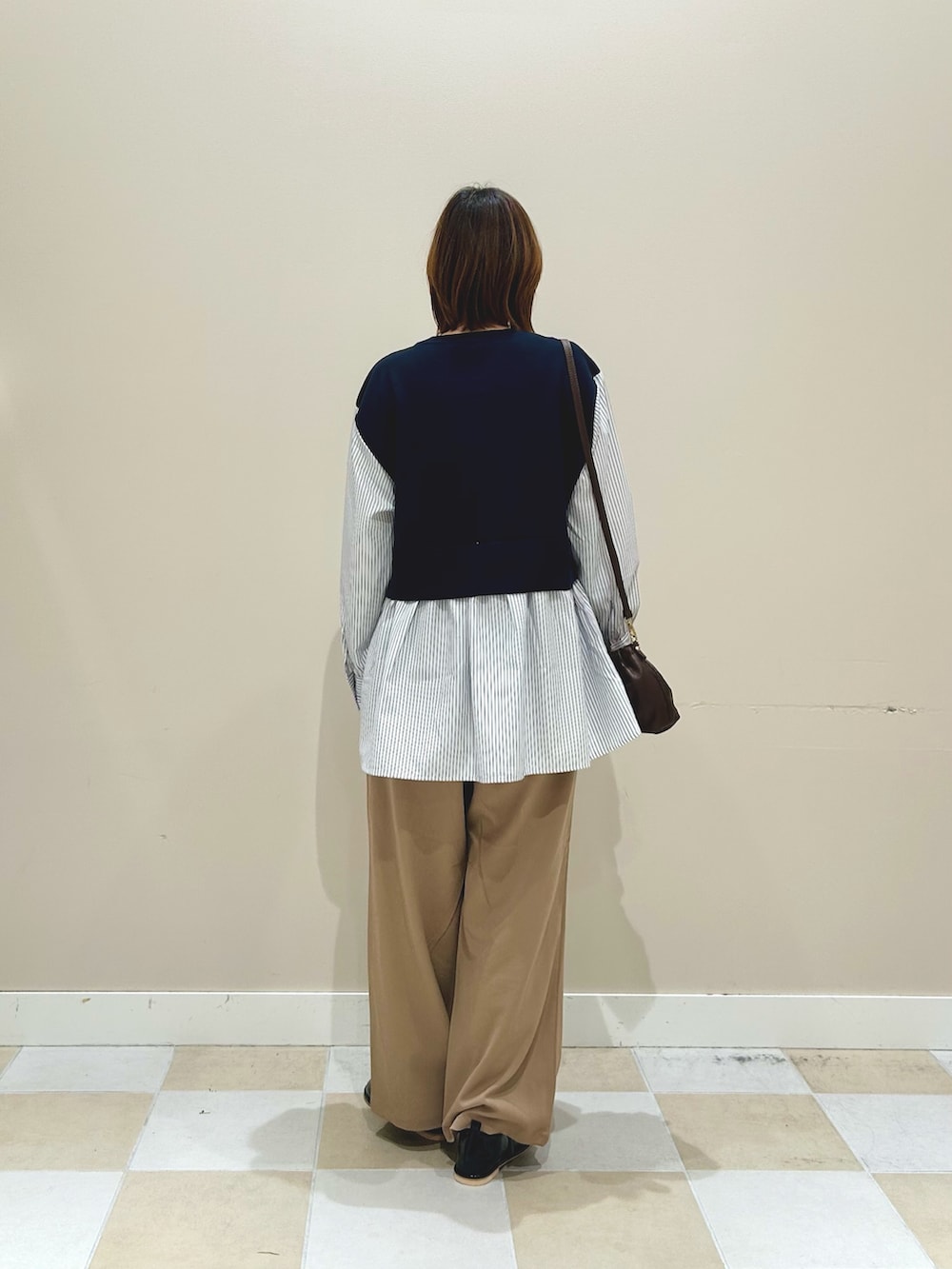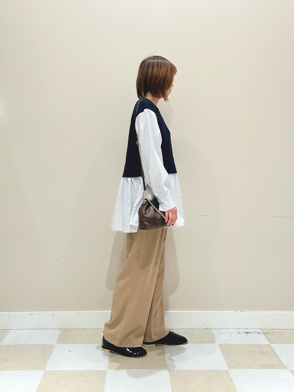 ニットベスト✖️ストライプシャツのドッキングトップスにキレイめなパンツで合わせました!