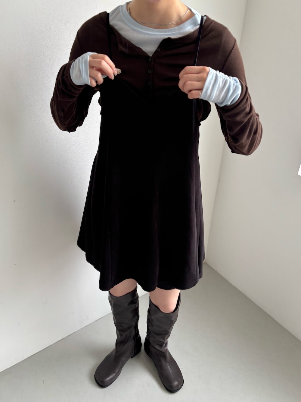 ブラウンとチャコールの組み合わせで大人っぽく、重ね着で抜け感をプラス!ロングブーツでスタイルアップも叶うコーデ✨