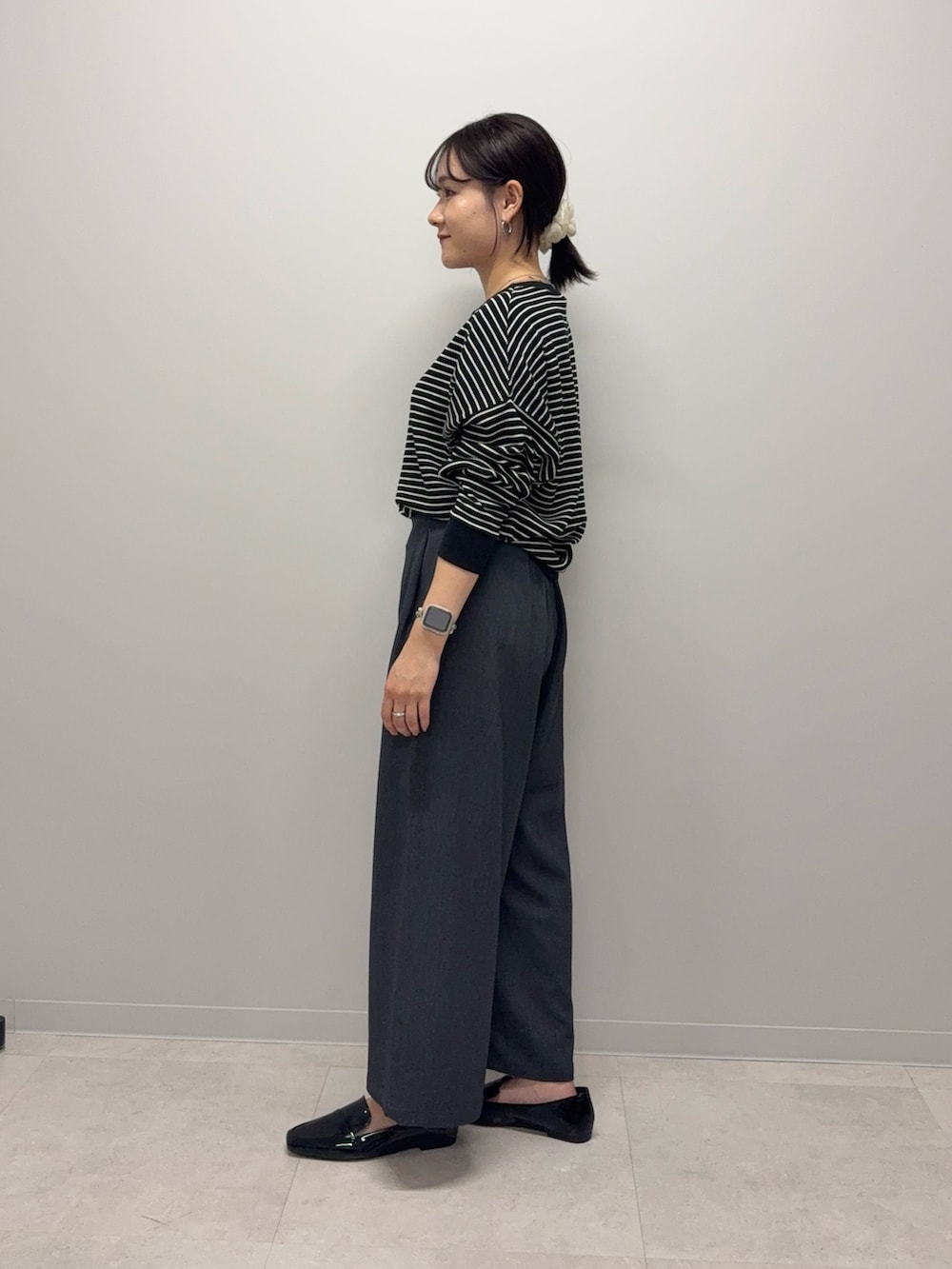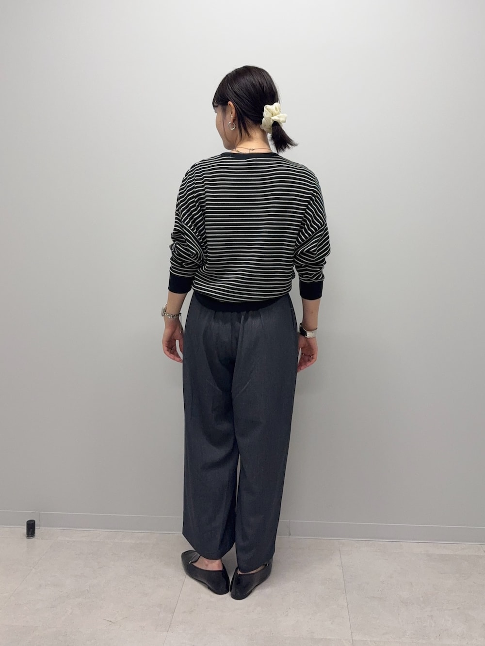 パンツはウエスト部分が後ろだけゴム仕様でフロントはスッキリしたデザインなのでカジュアルになりすぎず綺麗目なものでも合わせていただきやすいです!