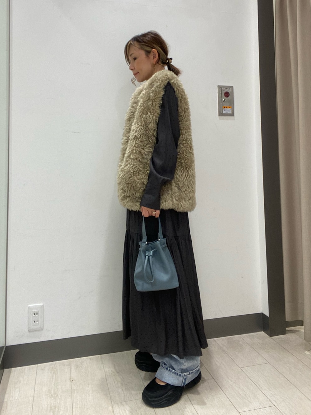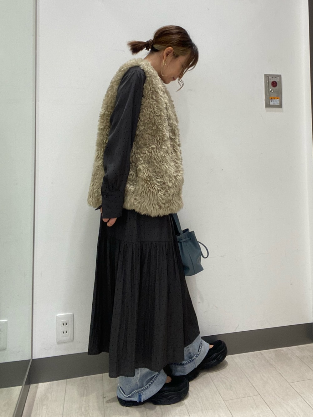 ボトムはビッグポケットデザインのデニムパンツを合わせました。