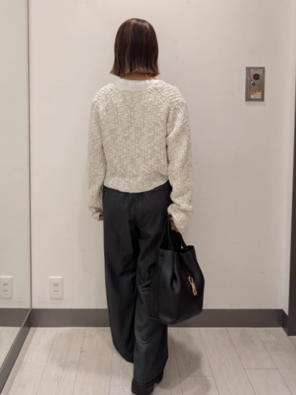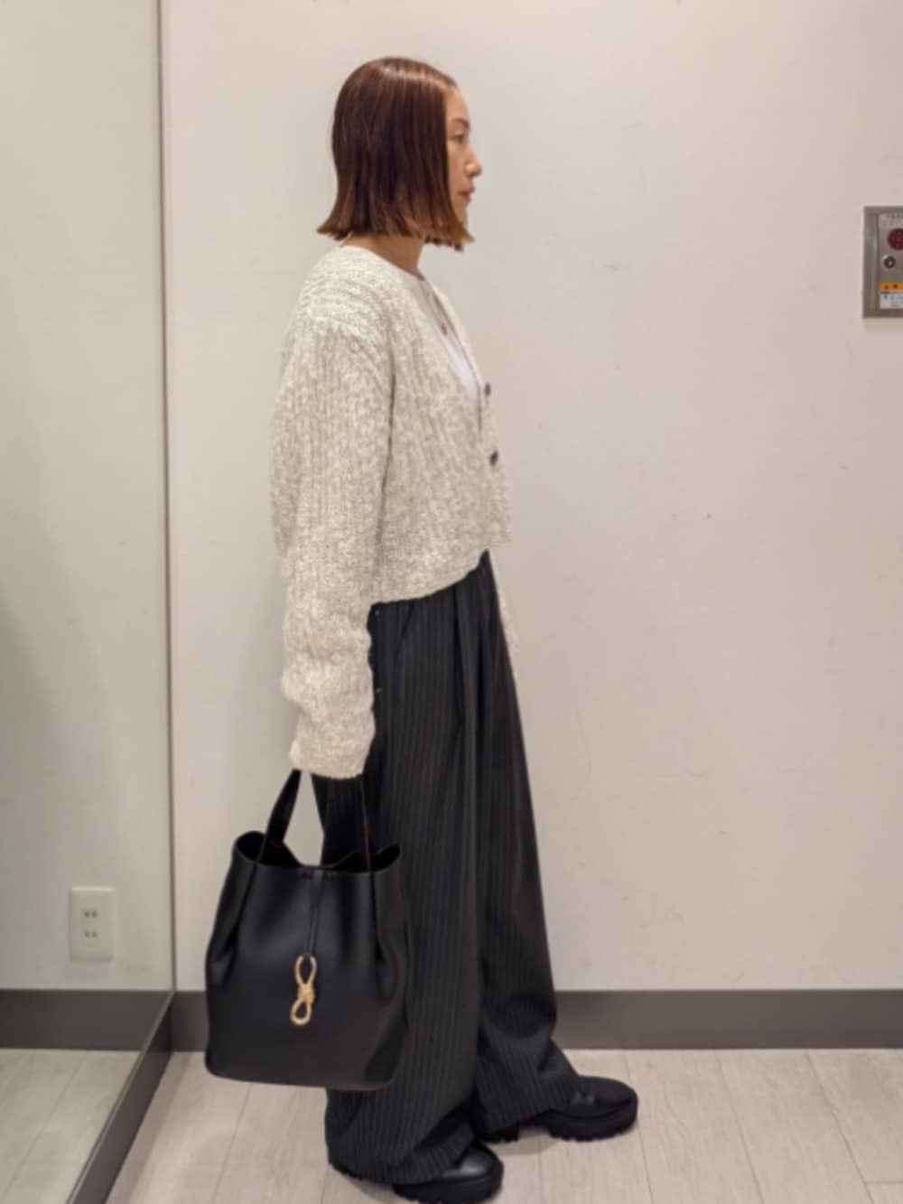 裾が短めのニットカーディガンはバランスよく着れます♫2種類の糸を使用していてシンプルながらも1枚で存在感があります🌼インナーを変えて着ていただくとまた違った雰囲気のイメージになりバリエーションも楽しめます!!