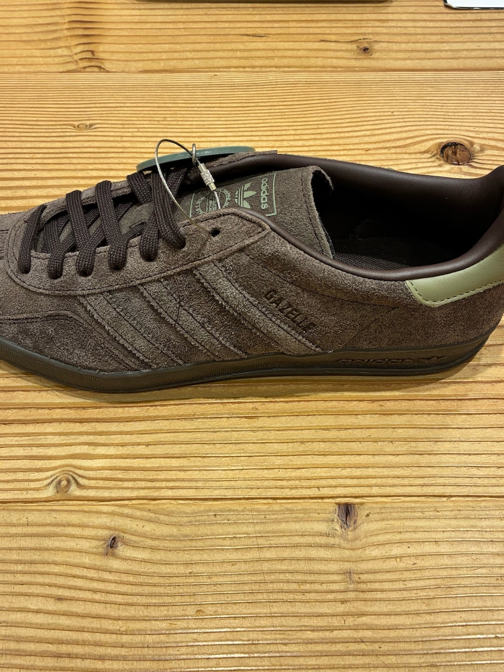 今回のモデルは、アッパーもスリーストライプスも同色のブラウンスウェードで上品に履ける一足。