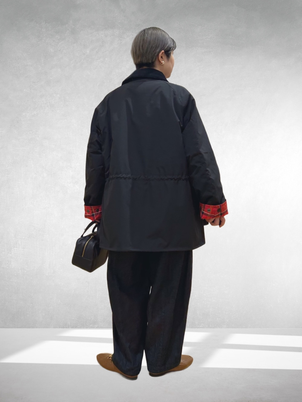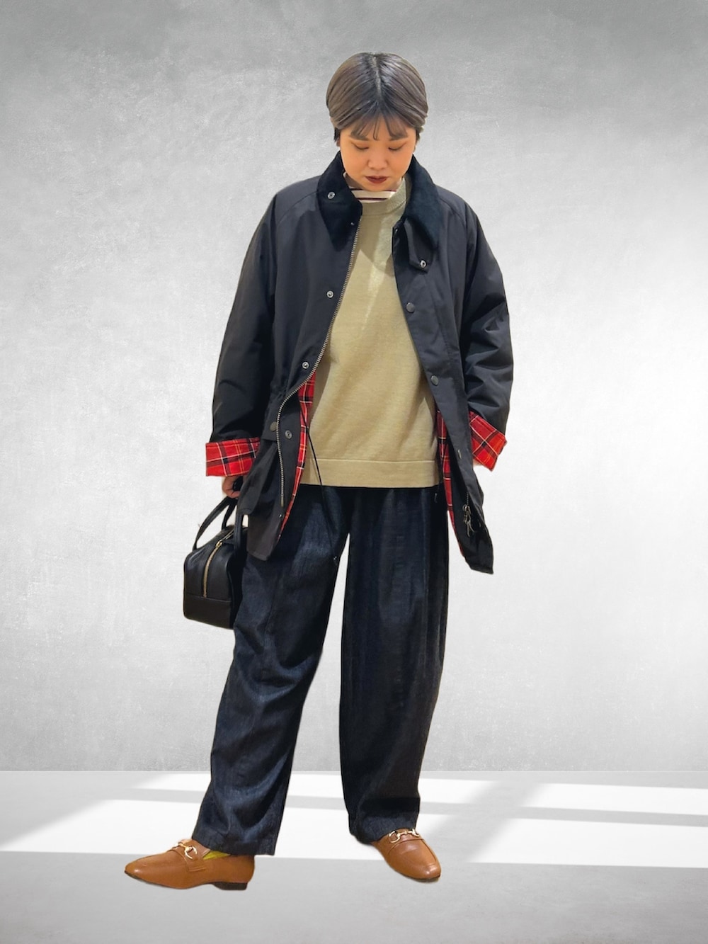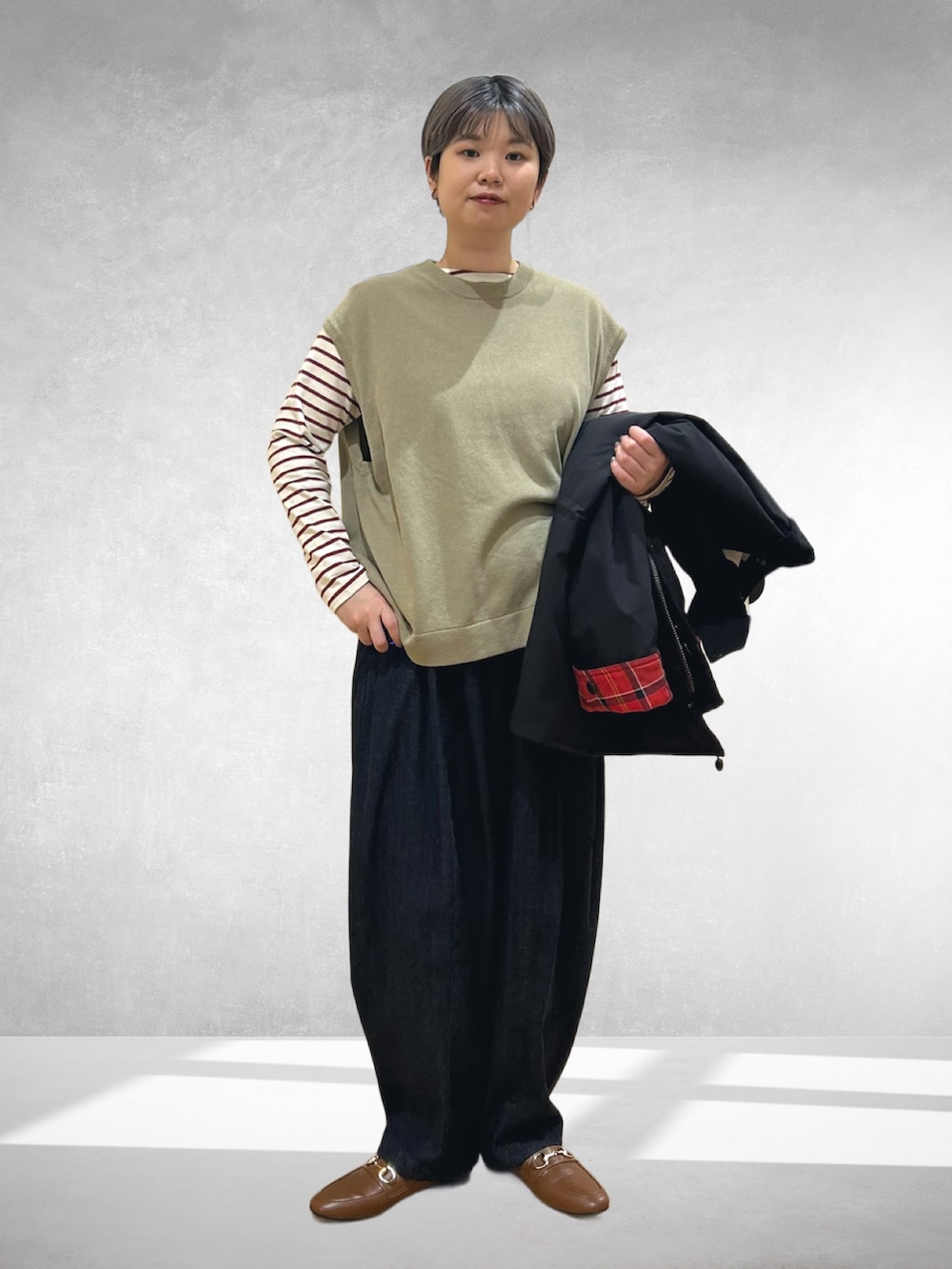 シンプルを合わせたデニムでカジュアルなスタイリング。