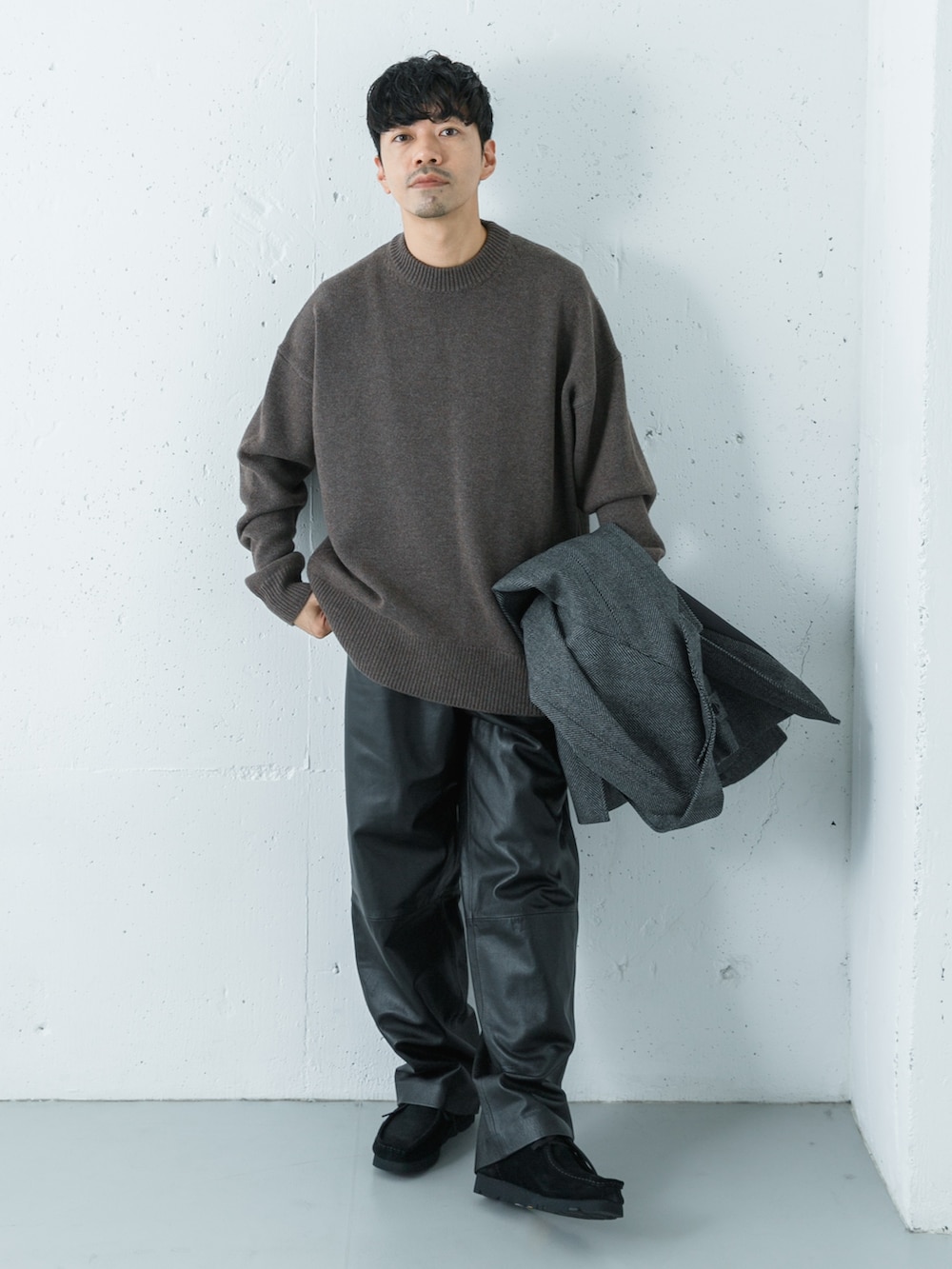 インナーのニットはブラウンでさりげない差し色がポイント。