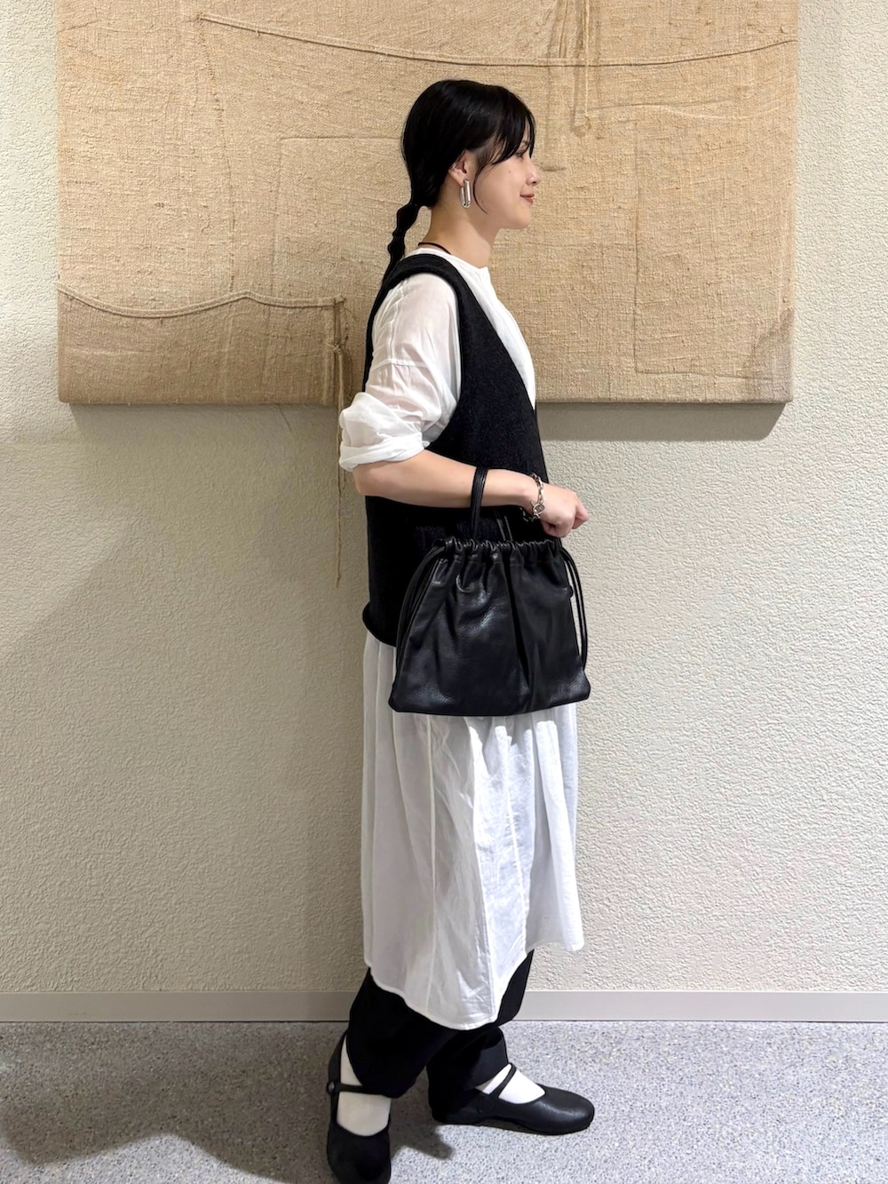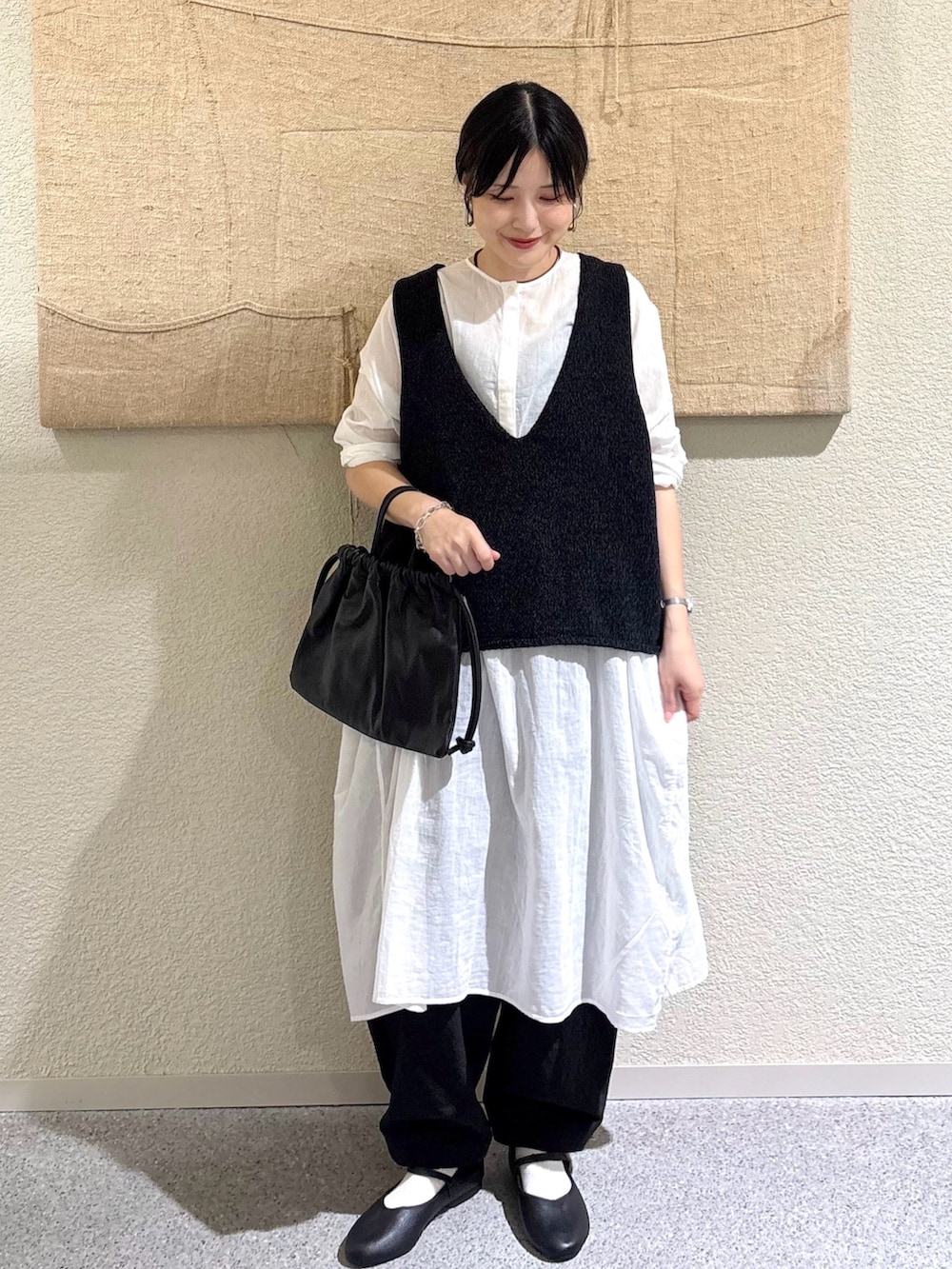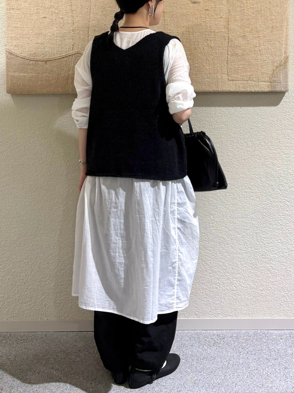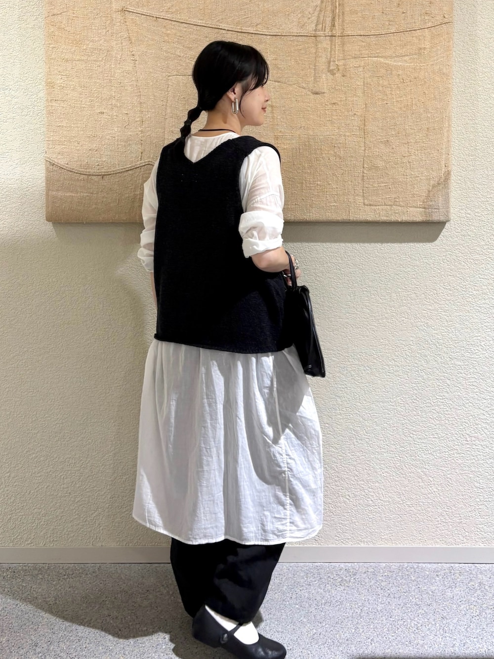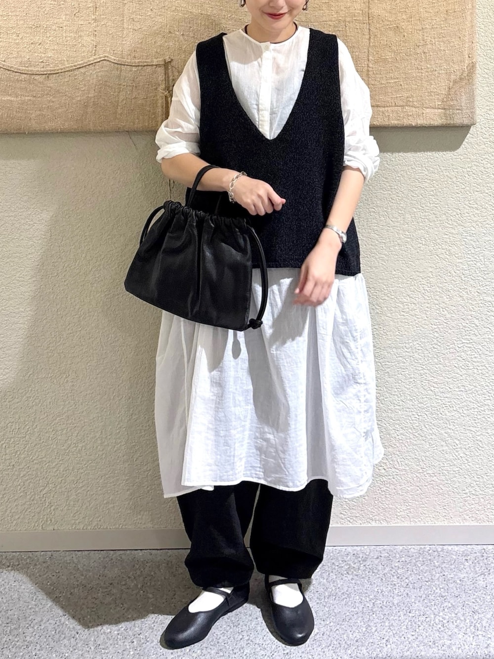 ・透け感のあるチュニックにニットベストを重ねて、奥行きのあるモノトーンスタイルに