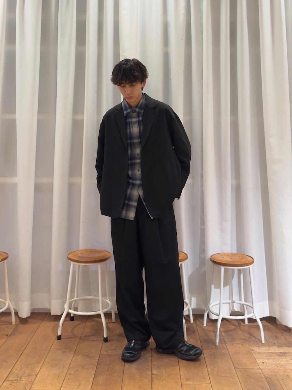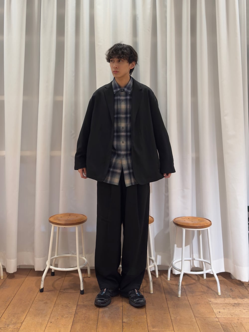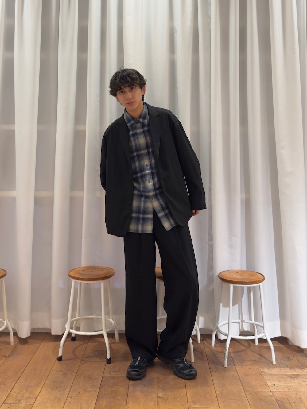 ウールのような温かみを感じるポリエステル素材のセットアップに、程よくラフなFORK & SPOONのネルシャツを合わせたスタイリングです‼️