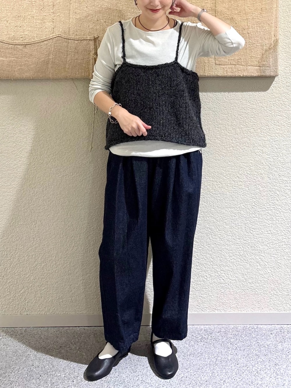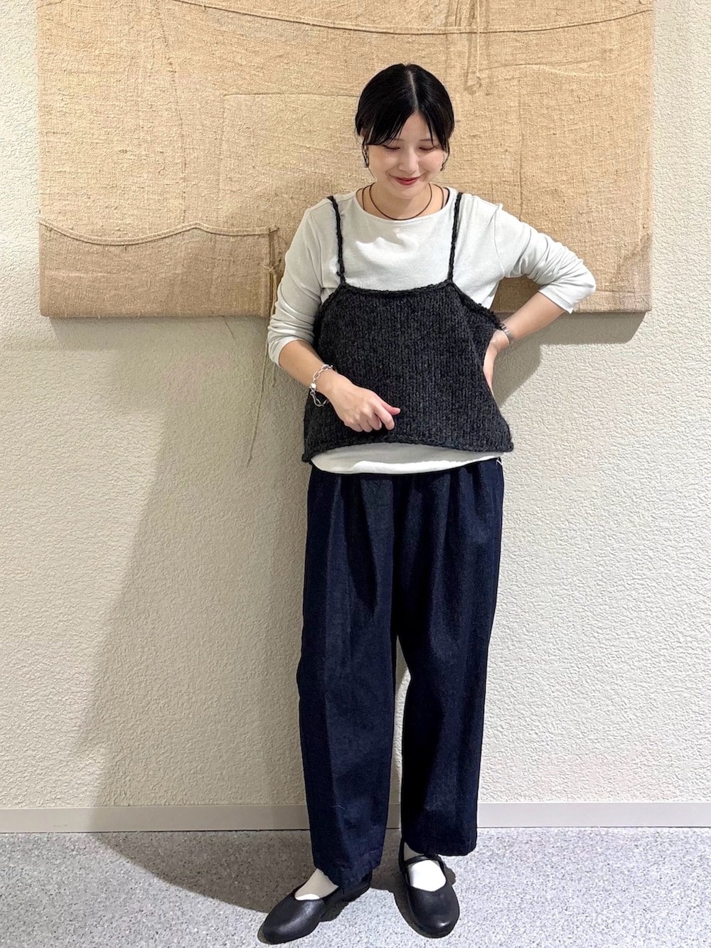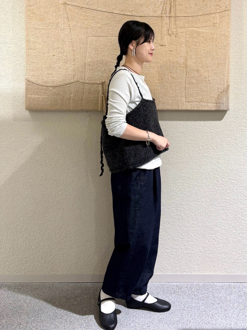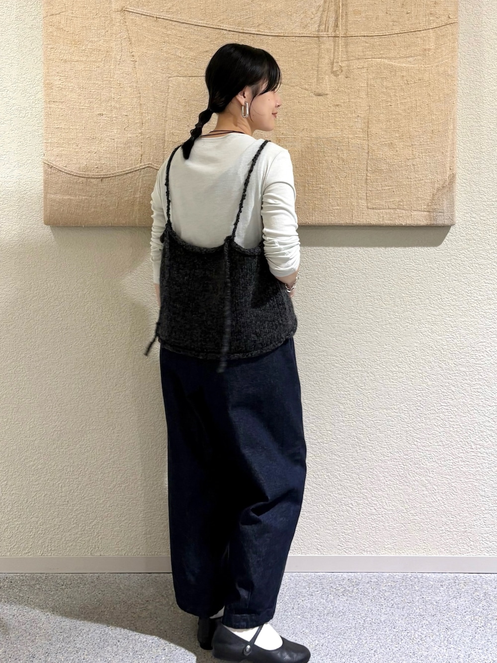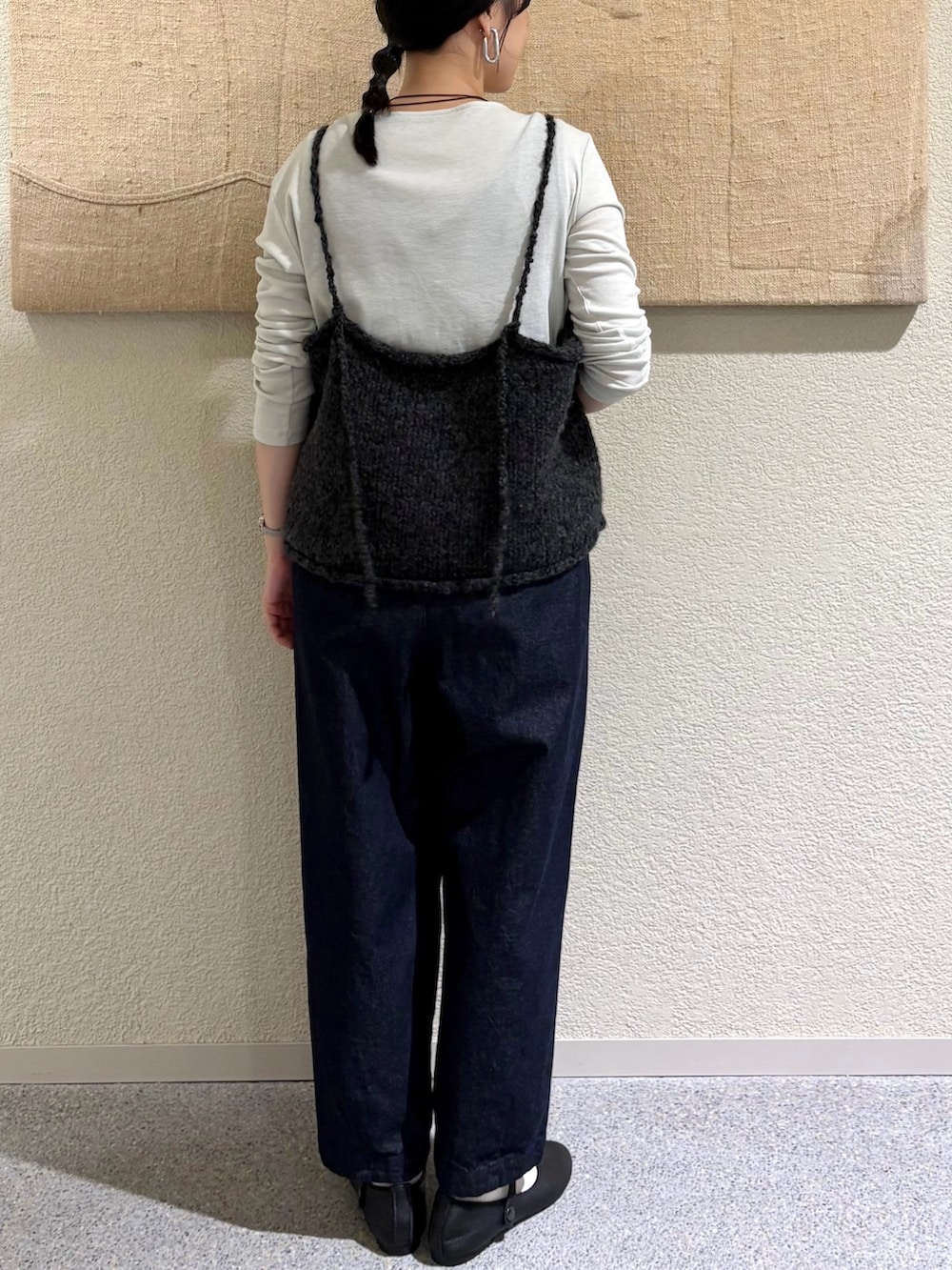 表情豊かなブークレ糸を使用したニットキャミソール。ややコンパクトなシルエットで、レイヤードすることで奥行きのあるスタイリングを演出。チャコールカラーが全体を引き締めます。
