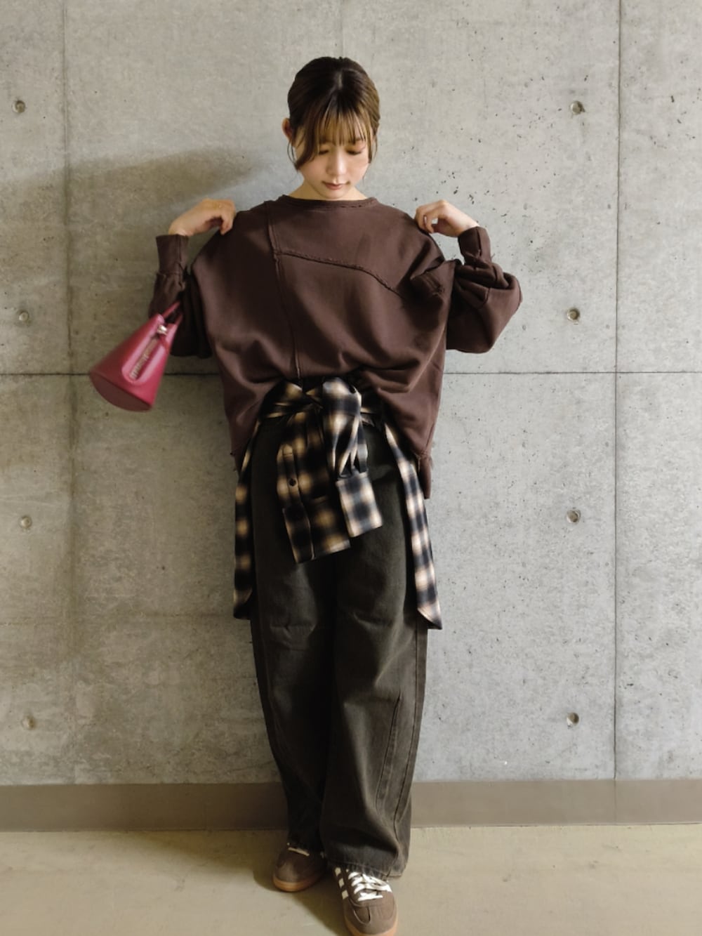 ブラウンのトップスはデザインが可愛くて、ゆったりしているので中にシャツや白Tなどをレイヤードできちゃいます😽🤍