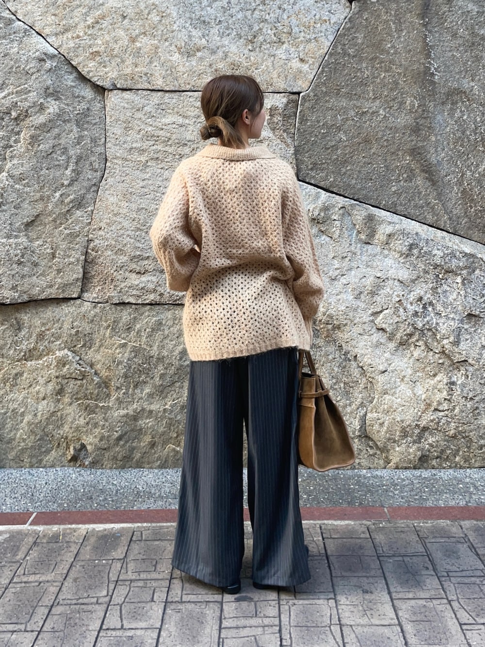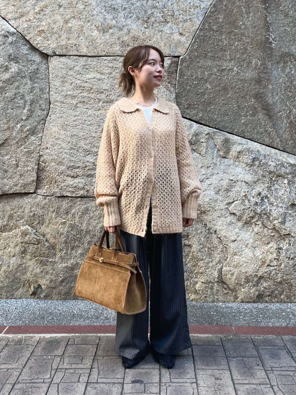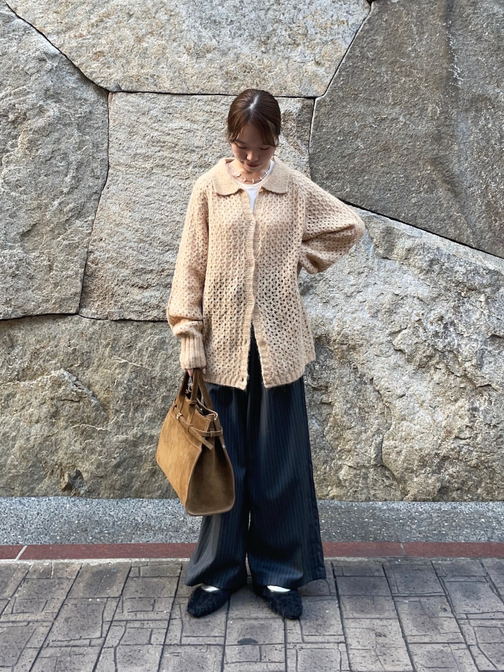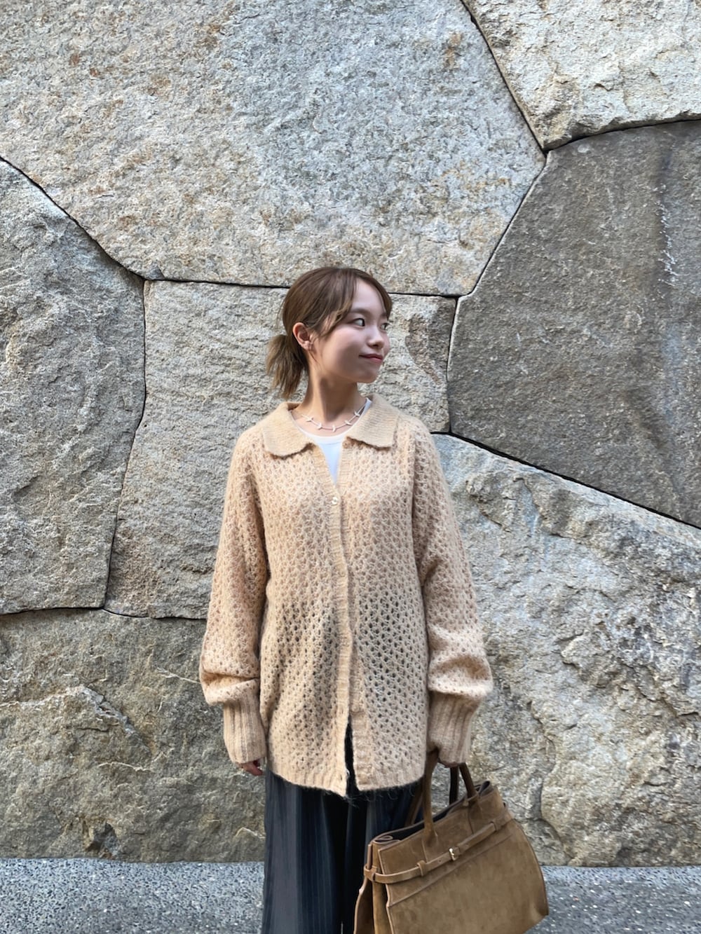 トップスのニットは透かし柄が、重ね着したりとレイヤーが楽しめるアイテムです!襟付きのカジュアルなアイテムで、ボタンを外して羽織としても使えますよ〜♪グレーの色違いがありましたが、私的になかなか無いこの色味がオススメです✨