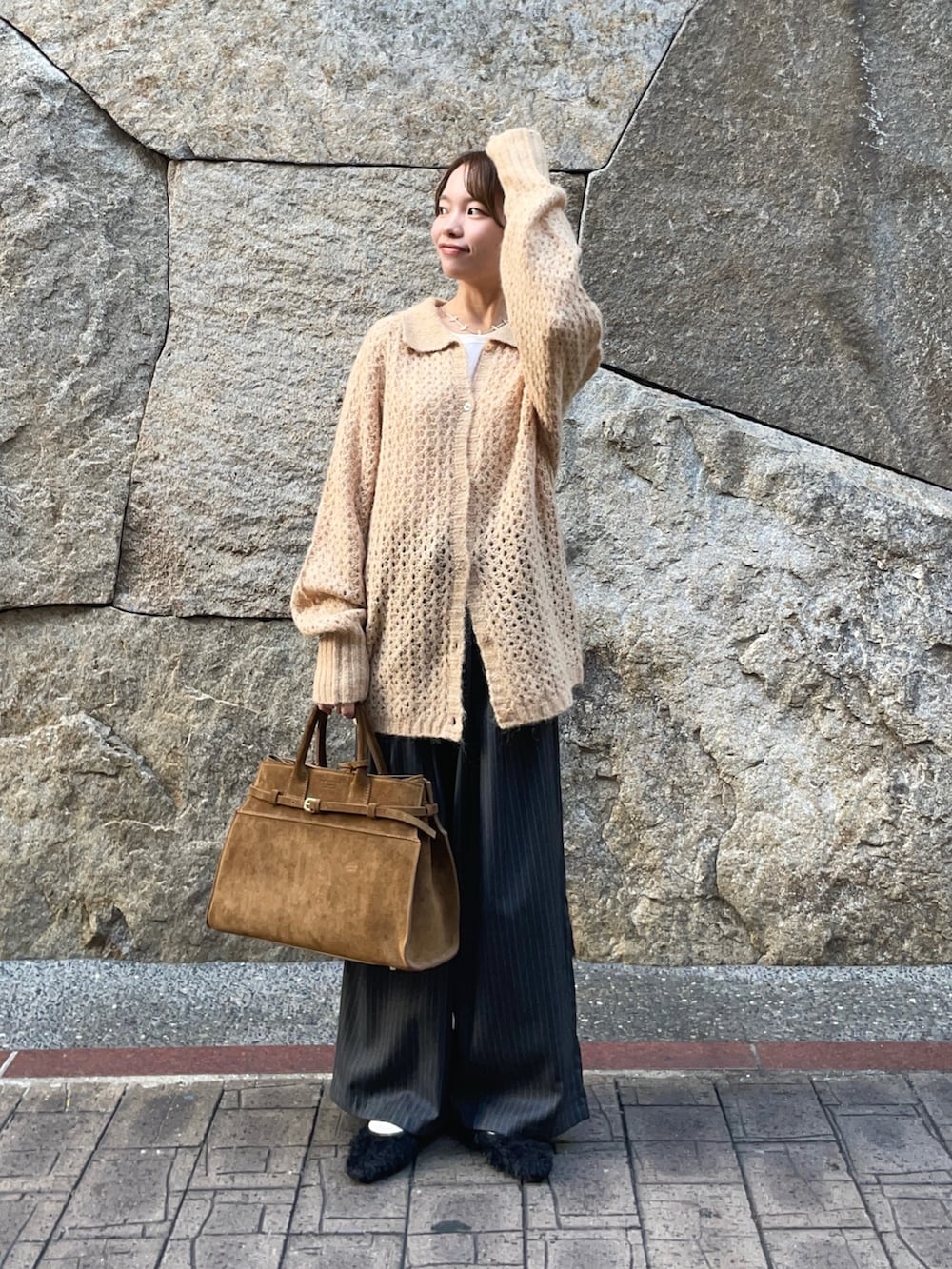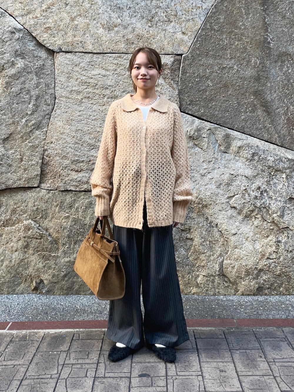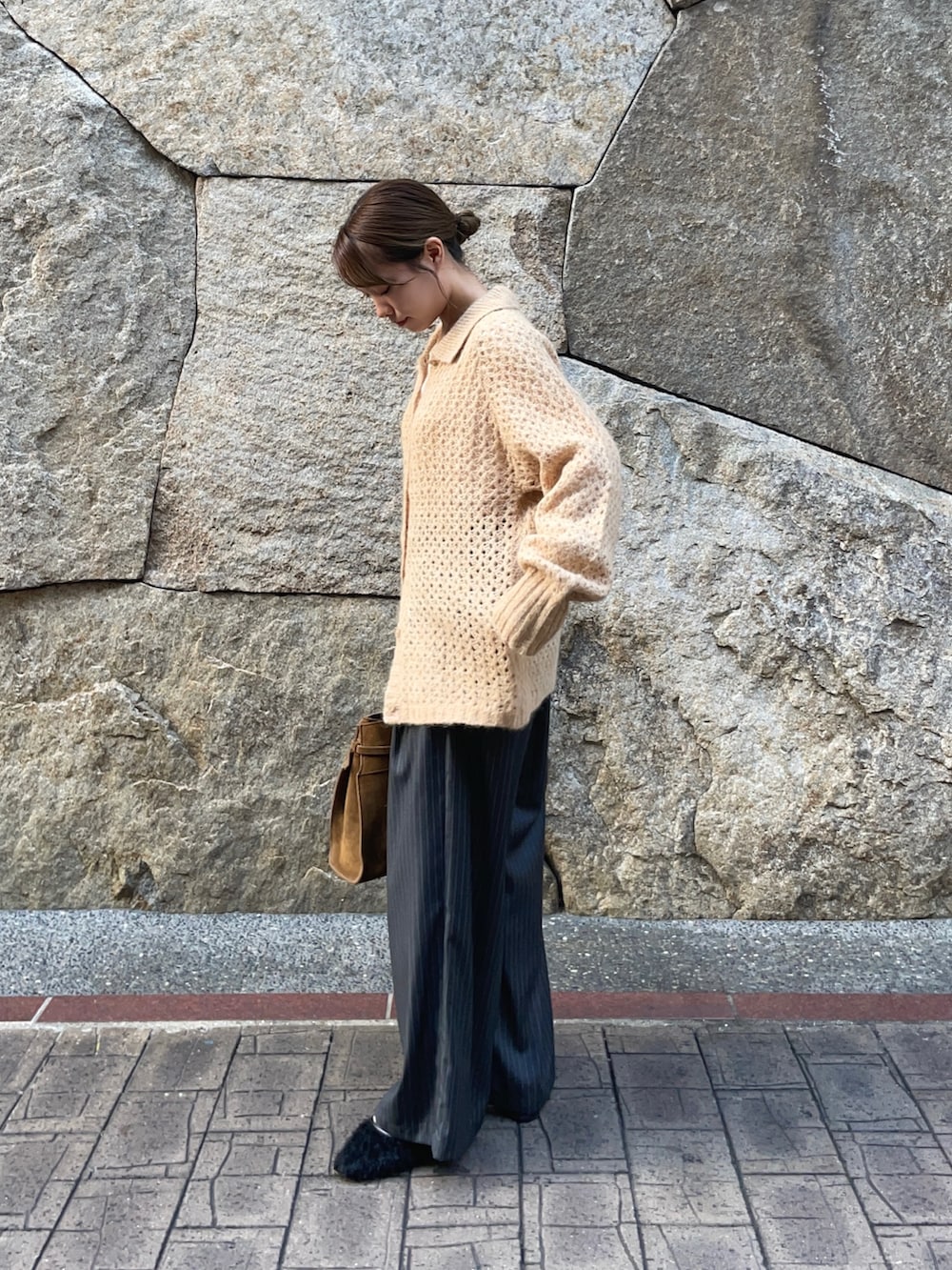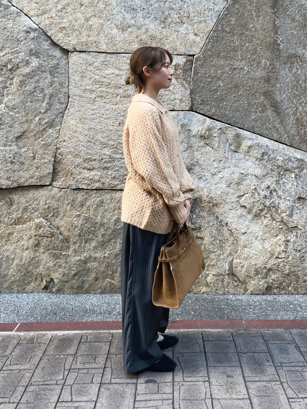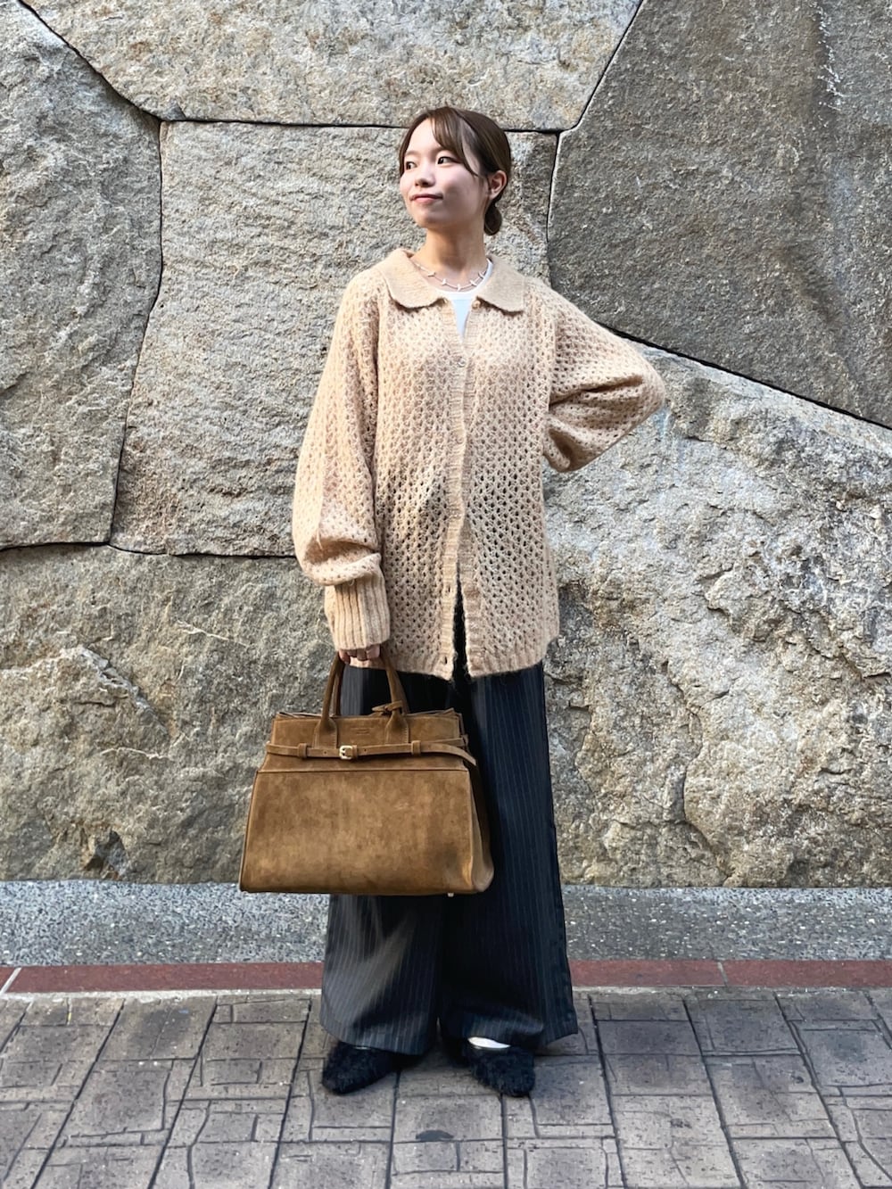 トップスのニットは透かし柄が、重ね着したりとレイヤーが楽しめるアイテムです!襟付きのカジュアルなアイテムで、ボタンを外して羽織としても使えますよ〜♪グレーの色違いがありましたが、私的になかなか無いこの色味がオススメです✨