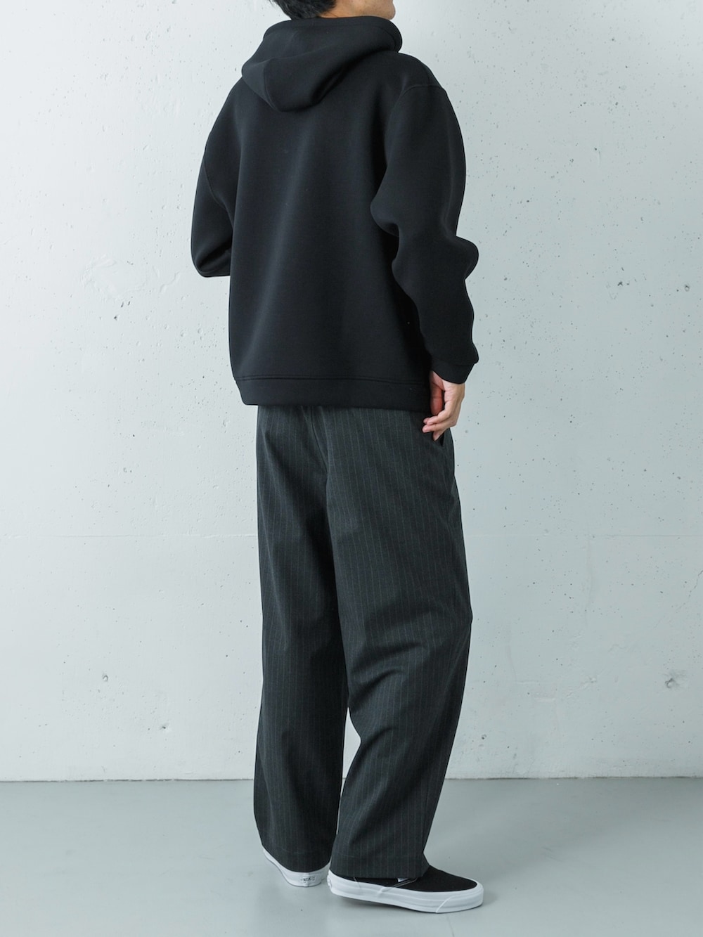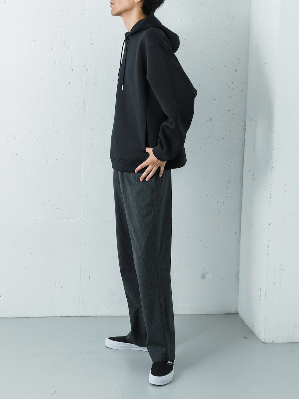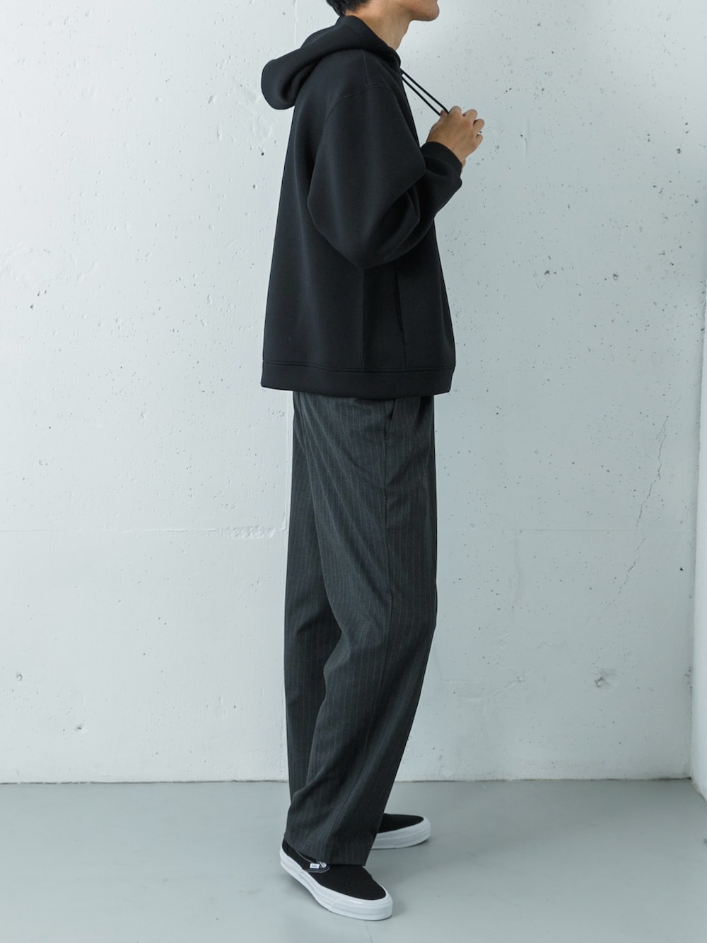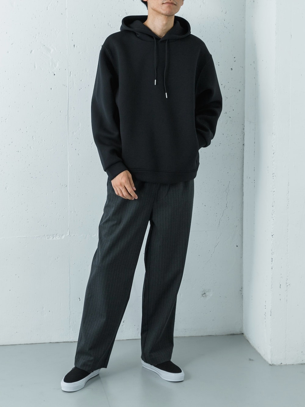 立体感のあるダンボールニットのパーカーに、ピンストライプのパンツを合わせたクリーンなカジュアルスタイル。