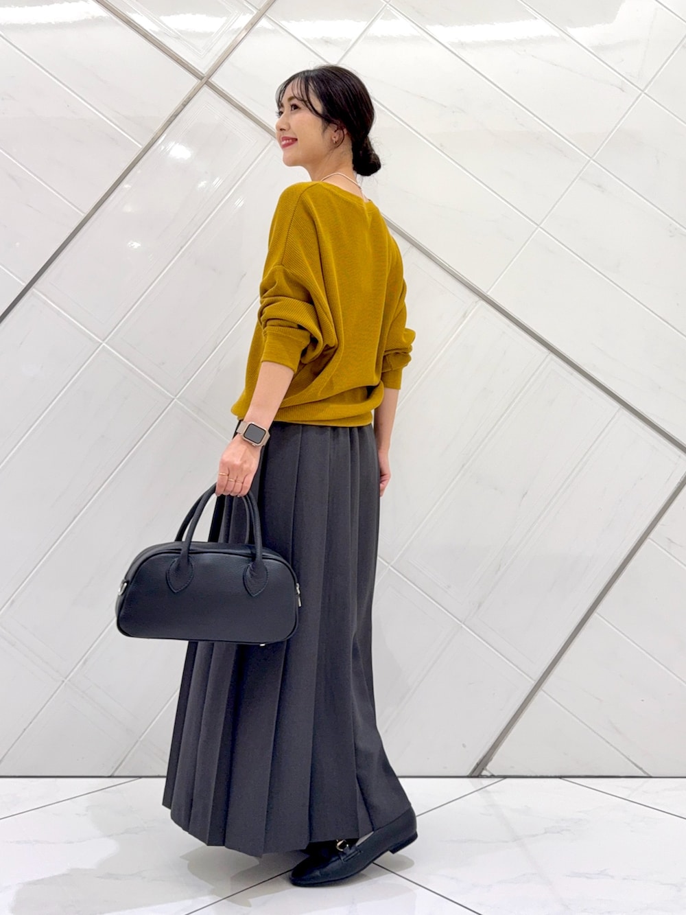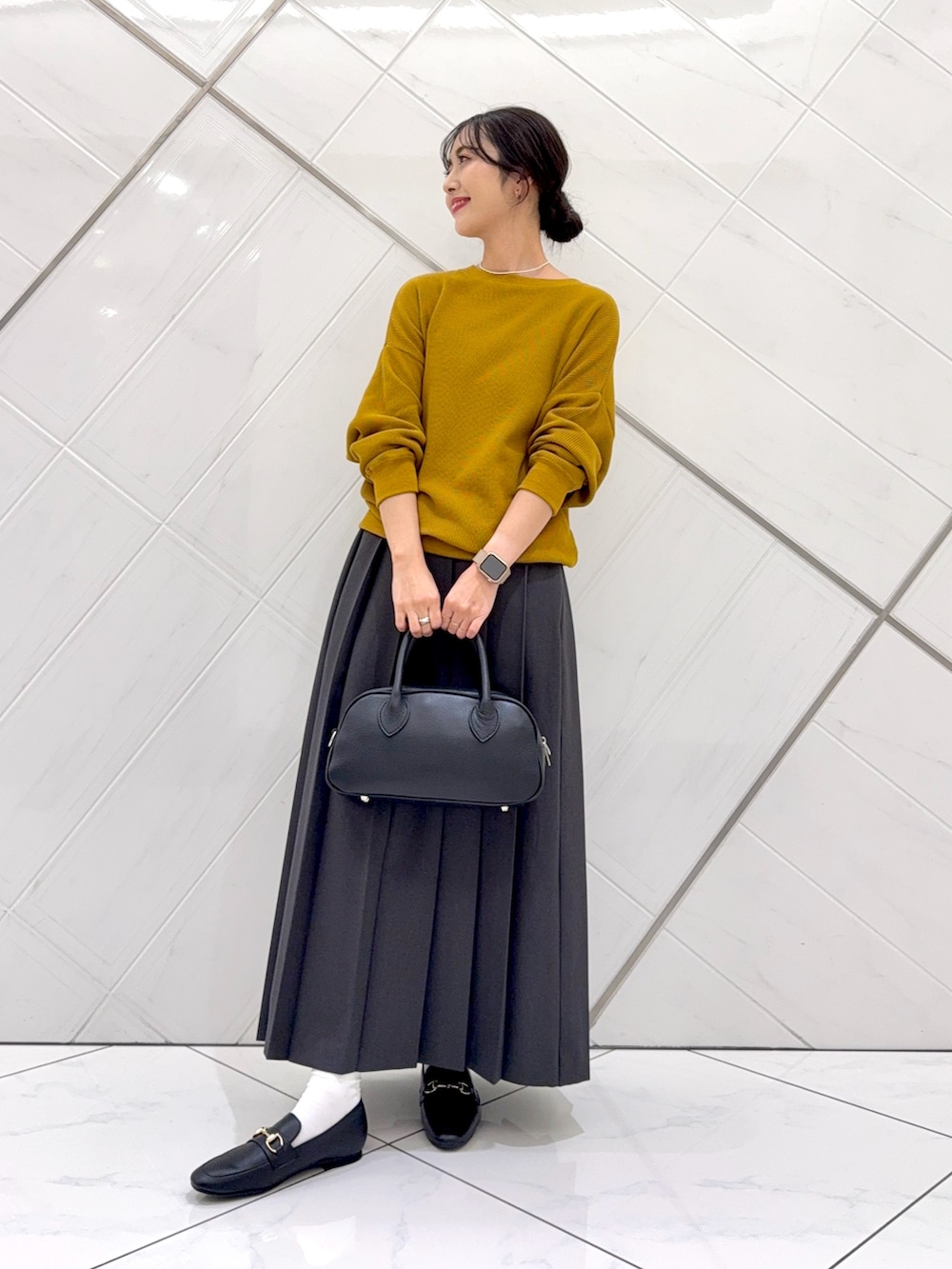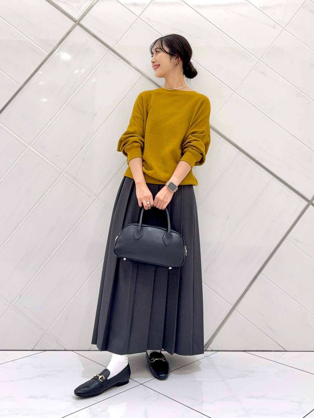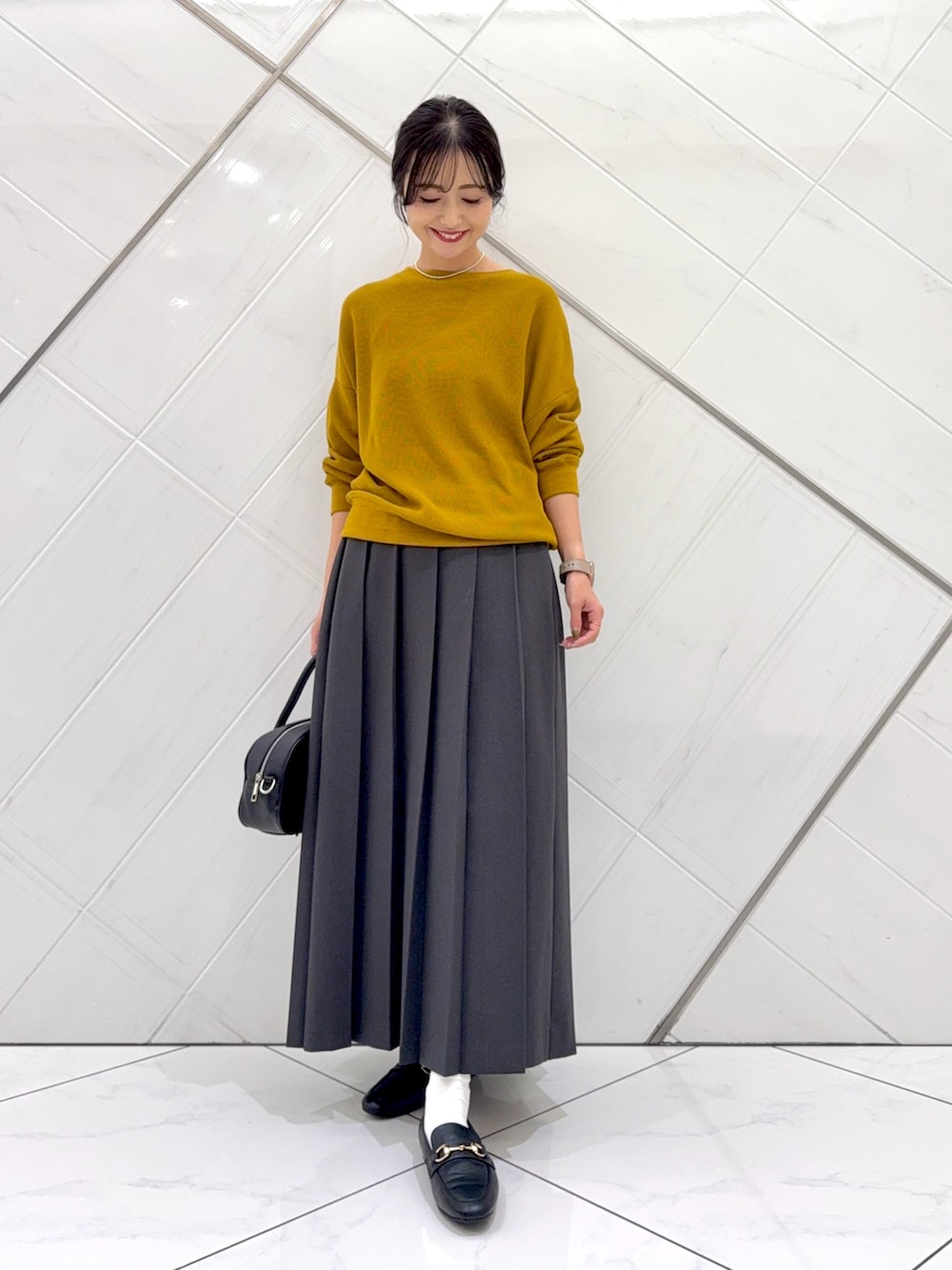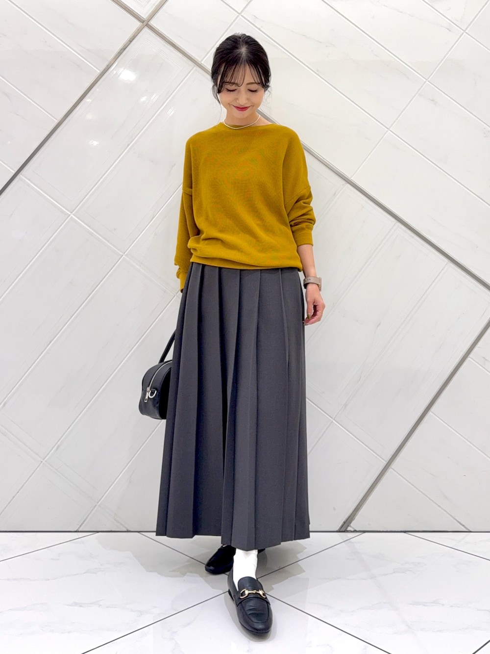 スカートはヒダが広めのプリーツスカートでウエストはゆったりとしており、腰で留まっているのでくるぶしの上くらいの着丈で長めです。