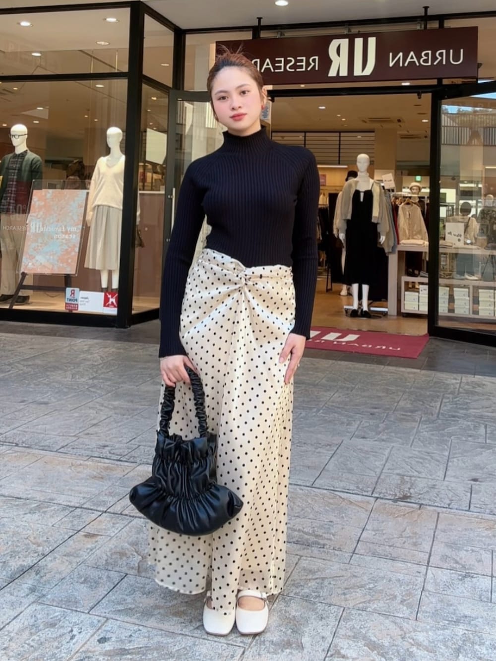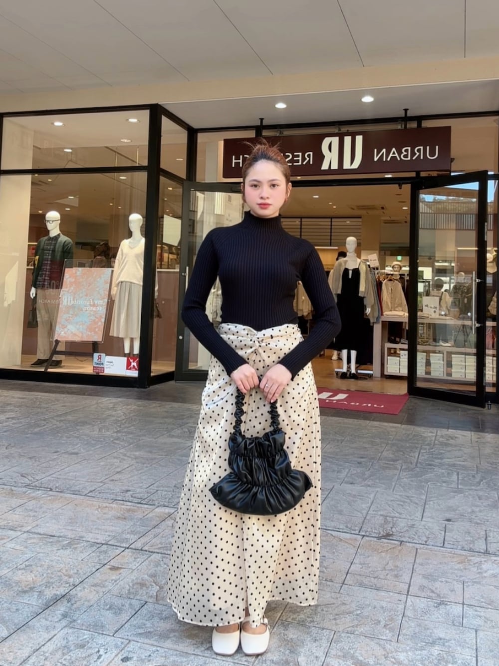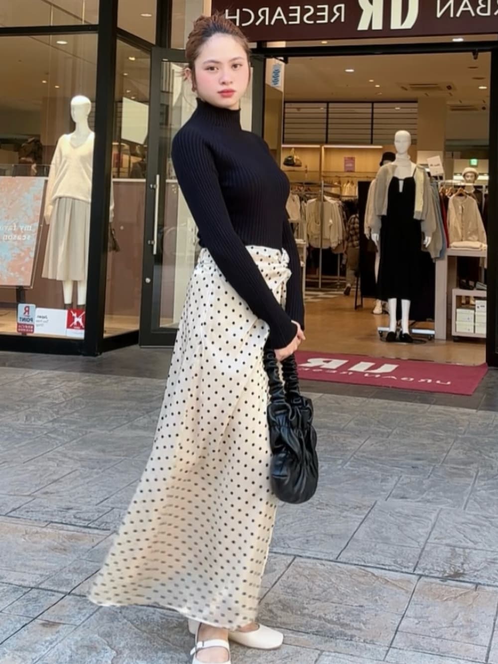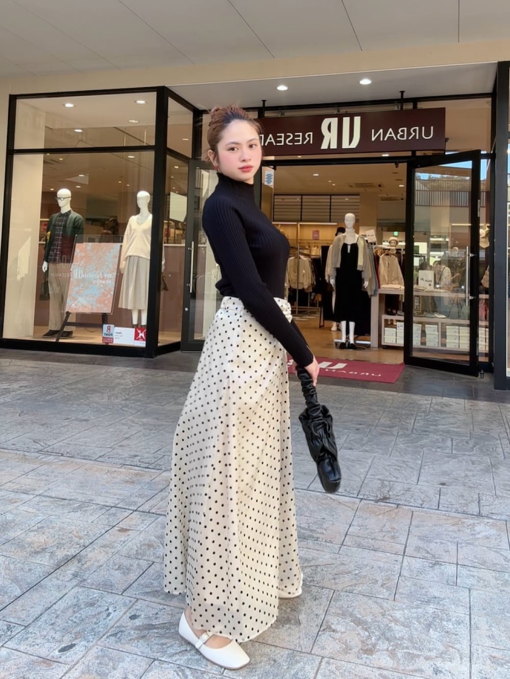 上品なハイネックトップスに、動くたびふんわり揺れるドット柄のロングスカートを合わせた、きれいめ秋コーデ。シンプルながらも女性らしさが引き立つスタイルで、デートやお出かけにもぴったり。落ち着いた色味で季節感も🍂
