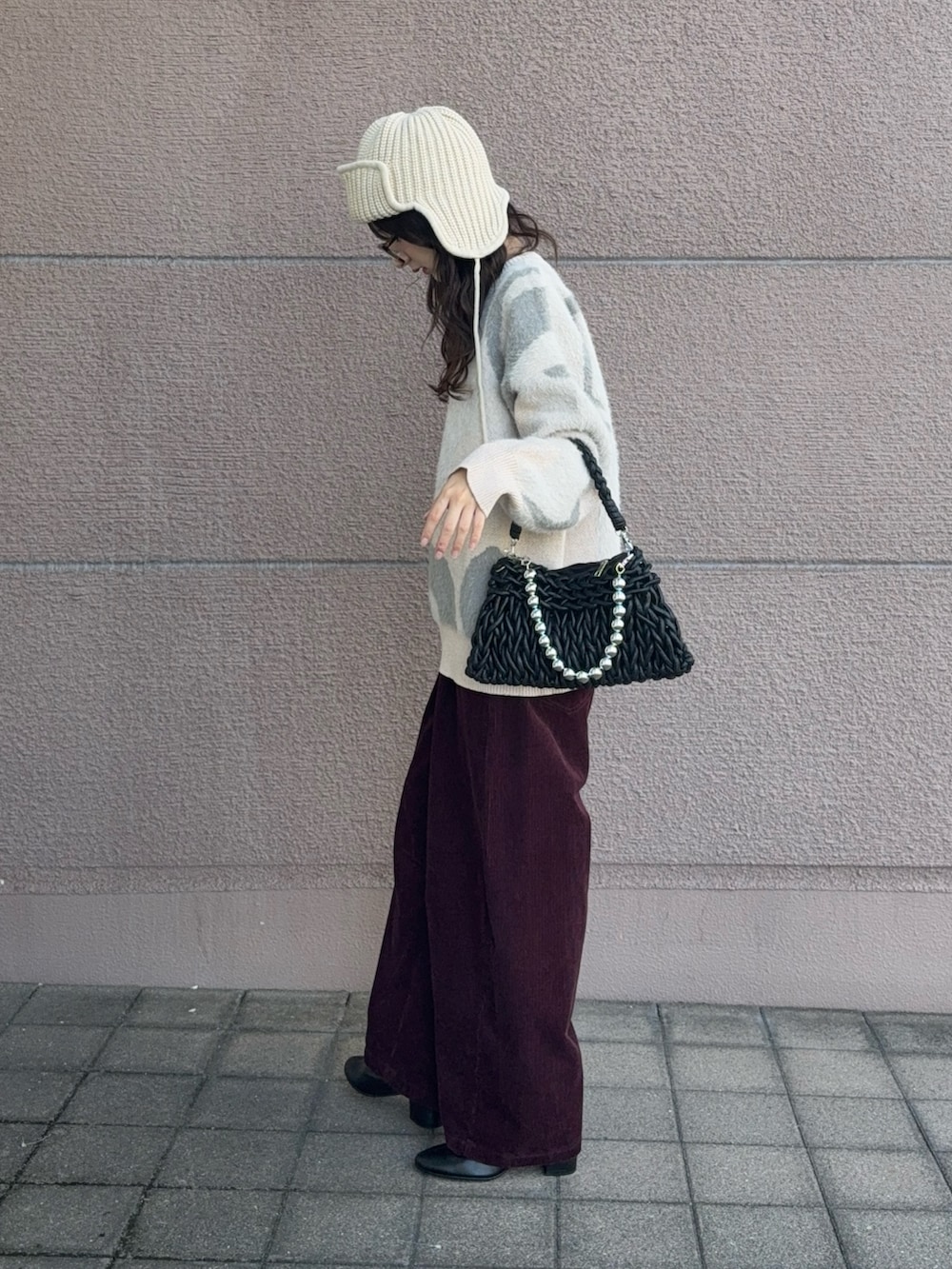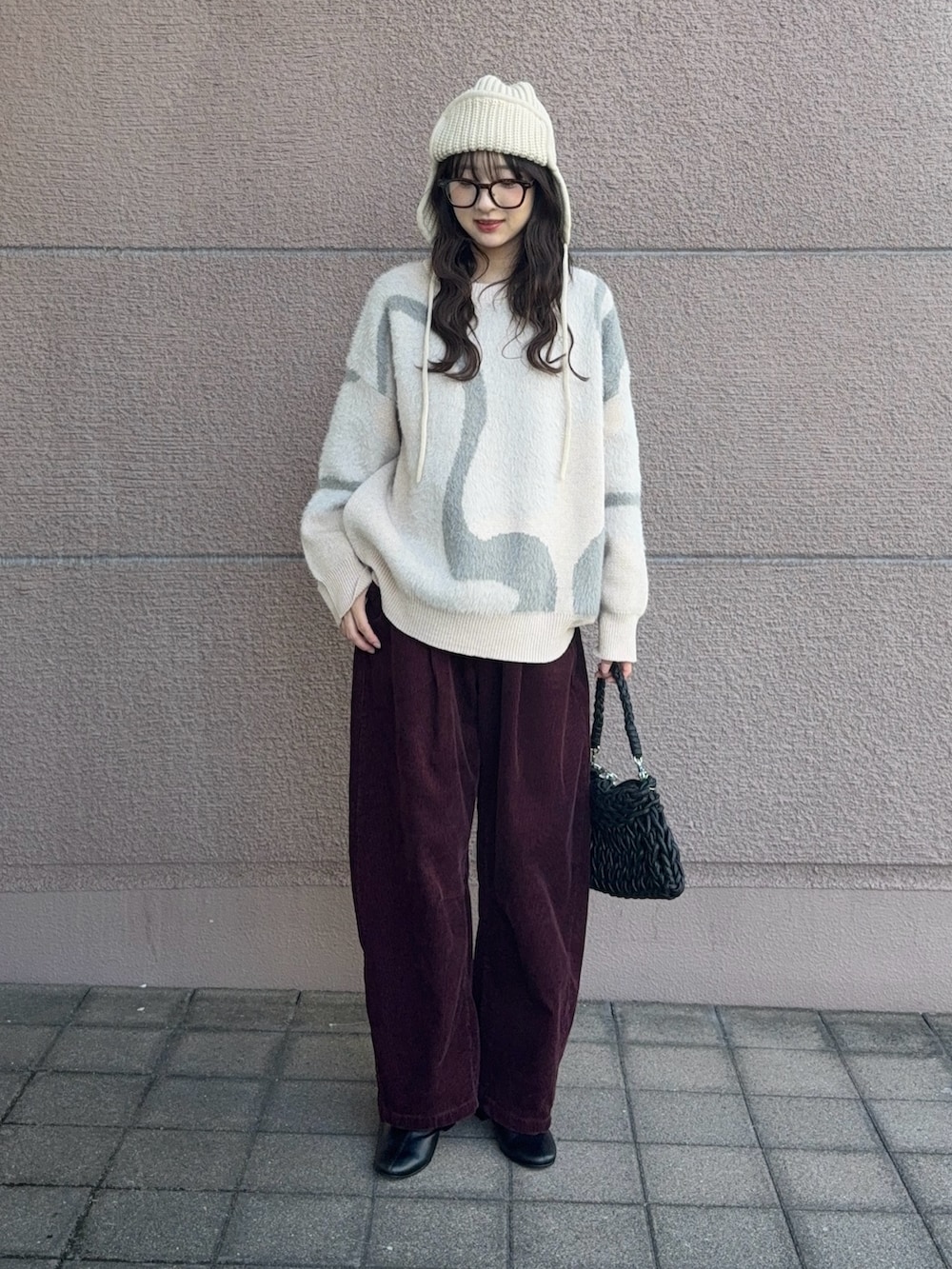 トップスはフェザーニットでデザインが可愛いアイテムになっています!ダボッとしたシルエットも可愛く生地も分厚めになっているので冬にピッタリなアイテムだと思います!