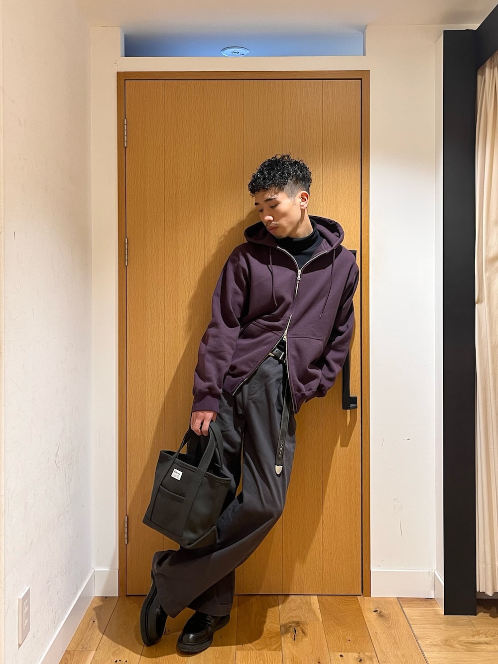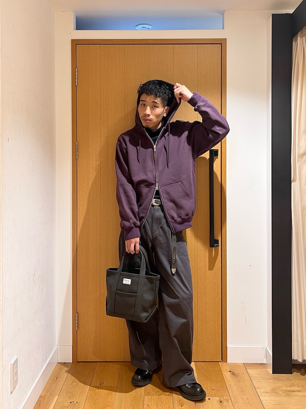 「FORK&SPOON」の深いパープルフーディーは全体を引き締め、「ORCIVAL」のメルトンバッグはスタイリングに柔らかさを加えてくれます。