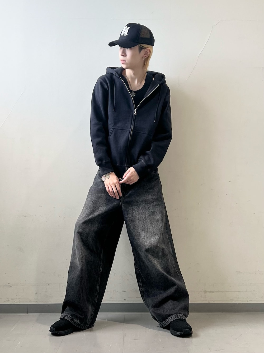 キャップを使ったオールブラックコーデになります!