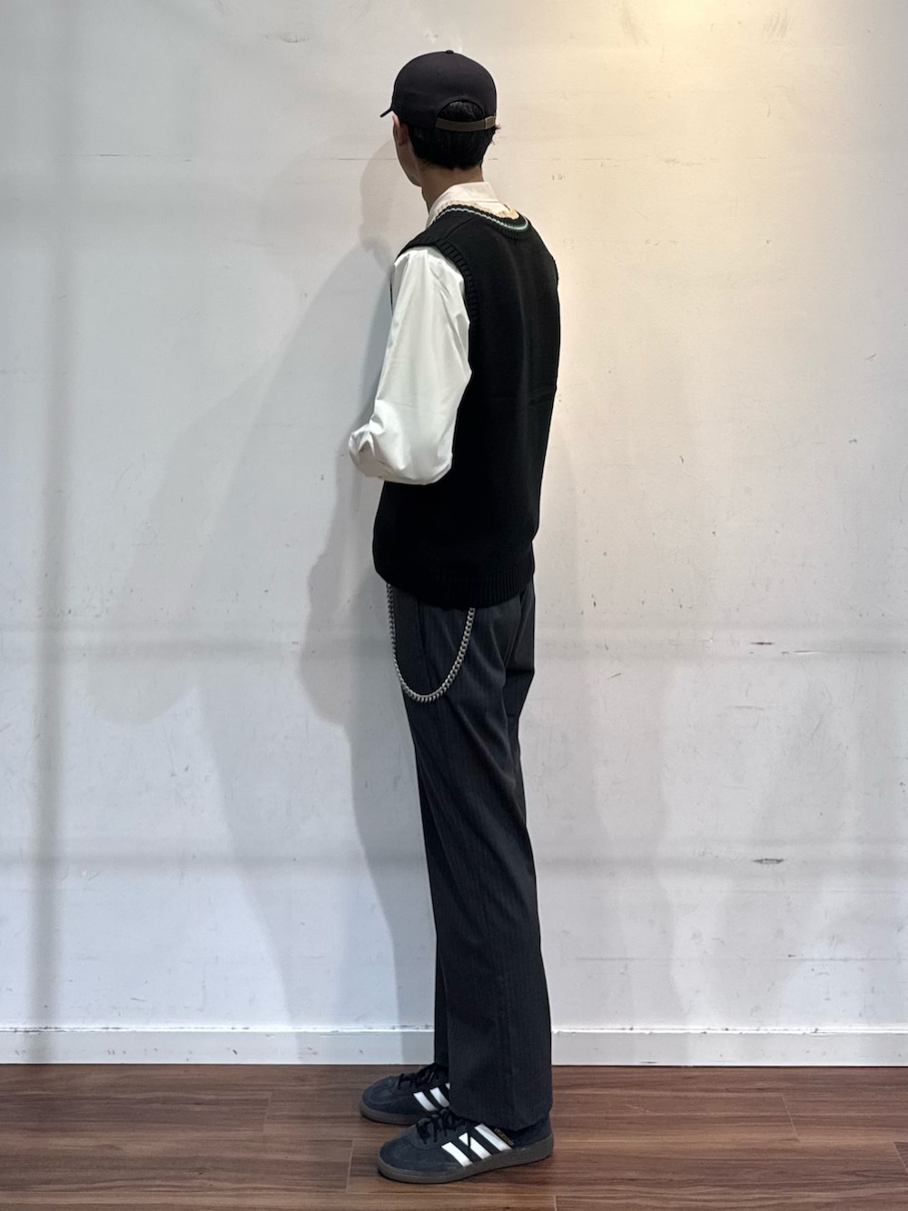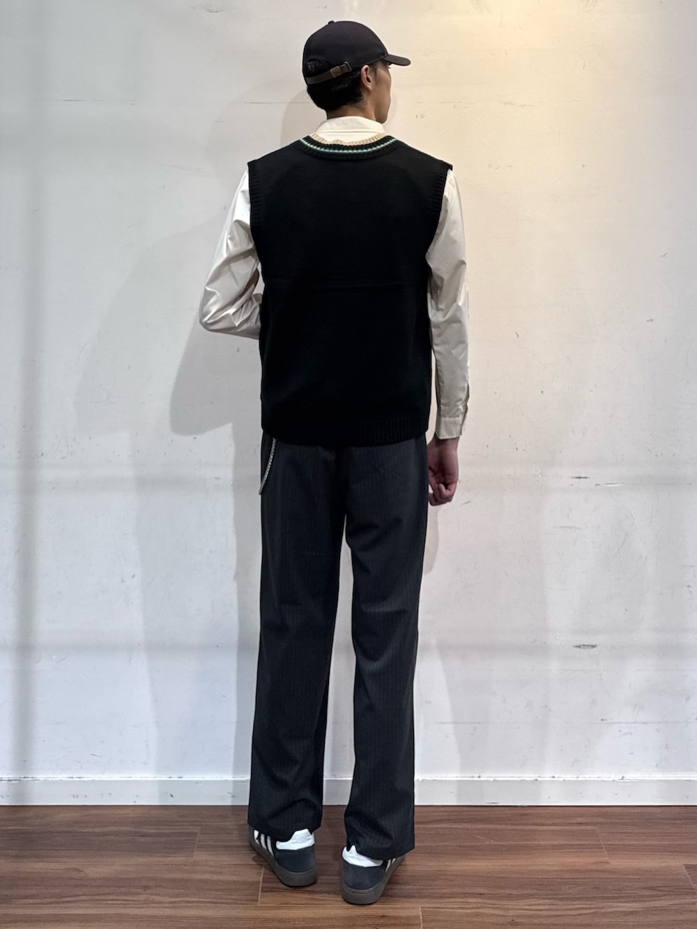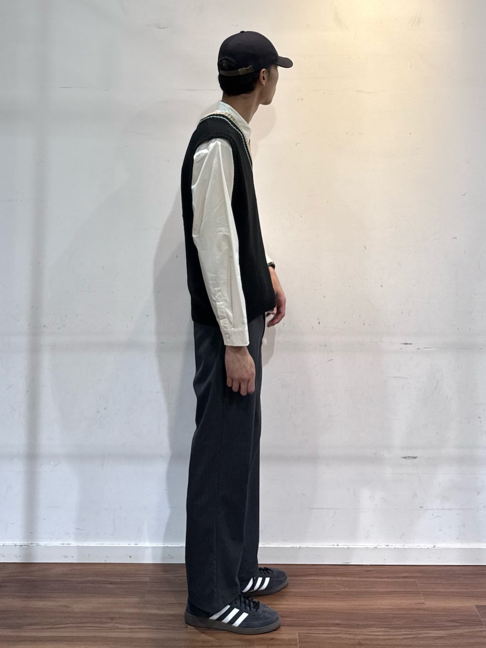 すっきり見えるVネックベスト。シャツやTシャツ合わせで様になるアイテム。さらにブレザーやテーラードジャケット合わせても良き👍