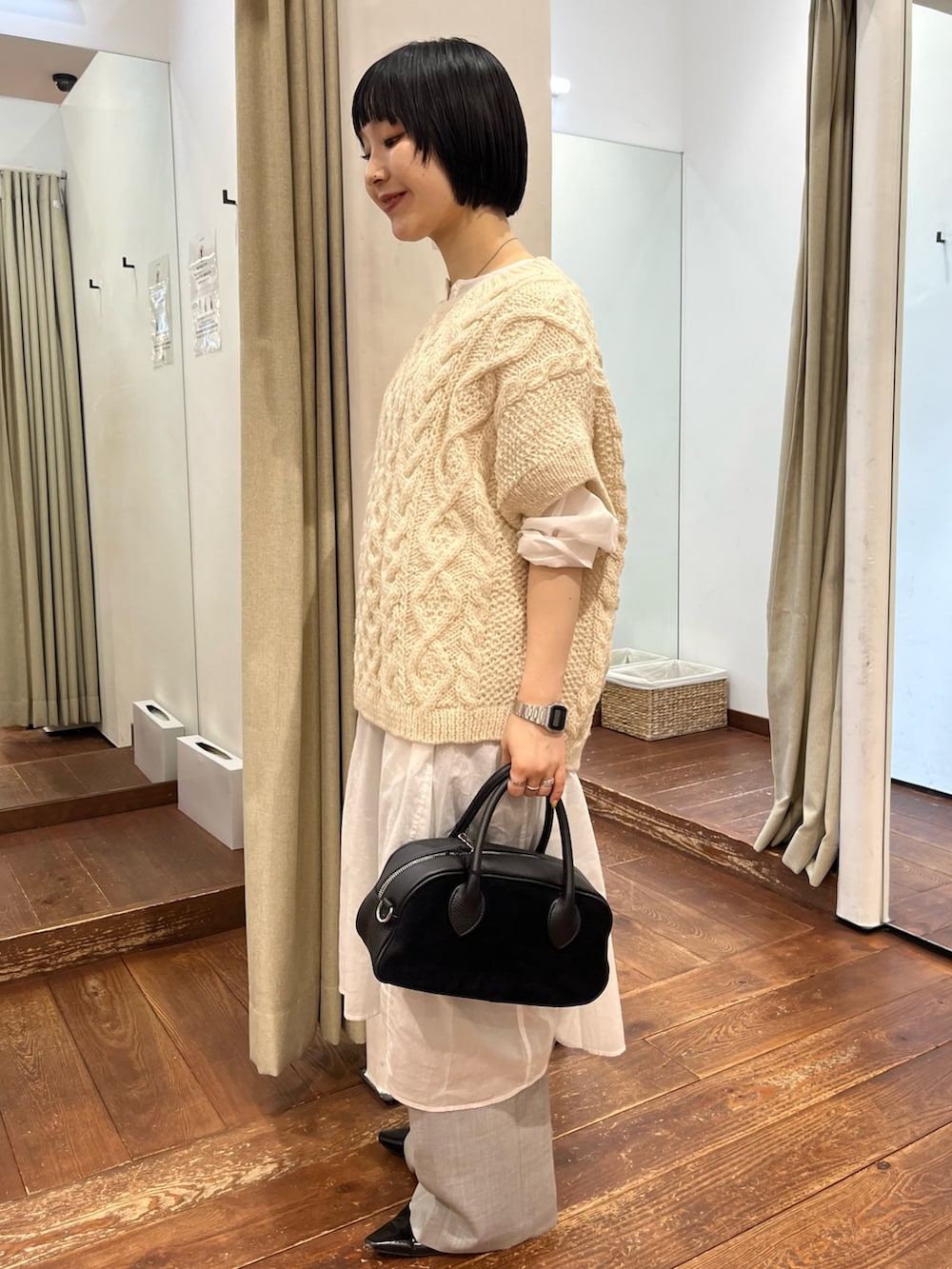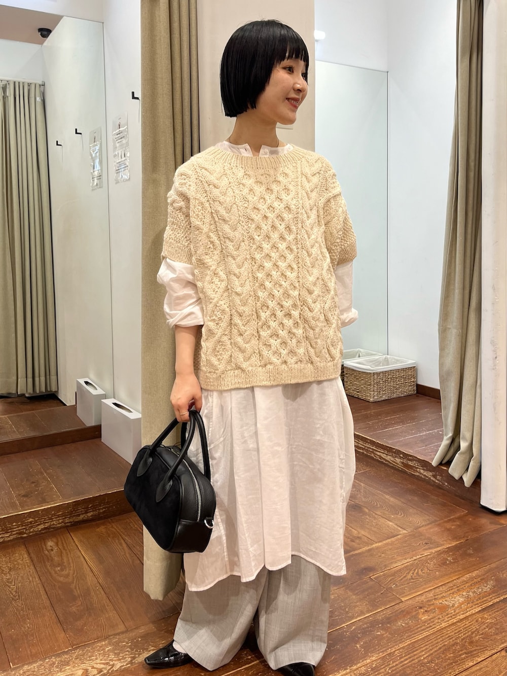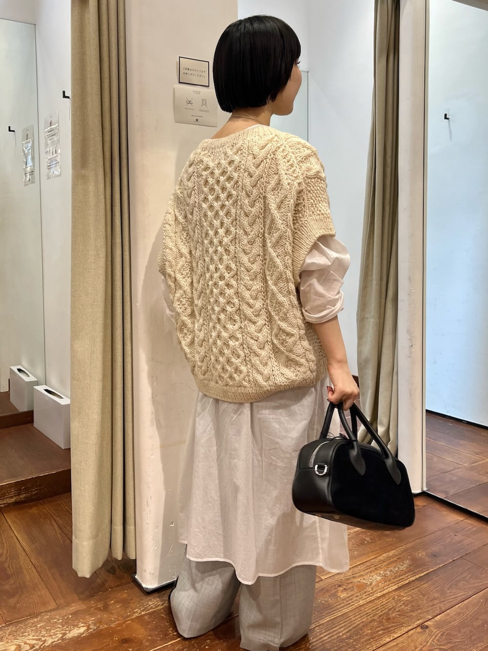 ざっくりアラン編みが特徴的で、しっかり幅もあるためもう少し冷え込むとタートルニットなどと重ねても◎