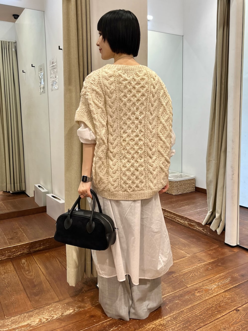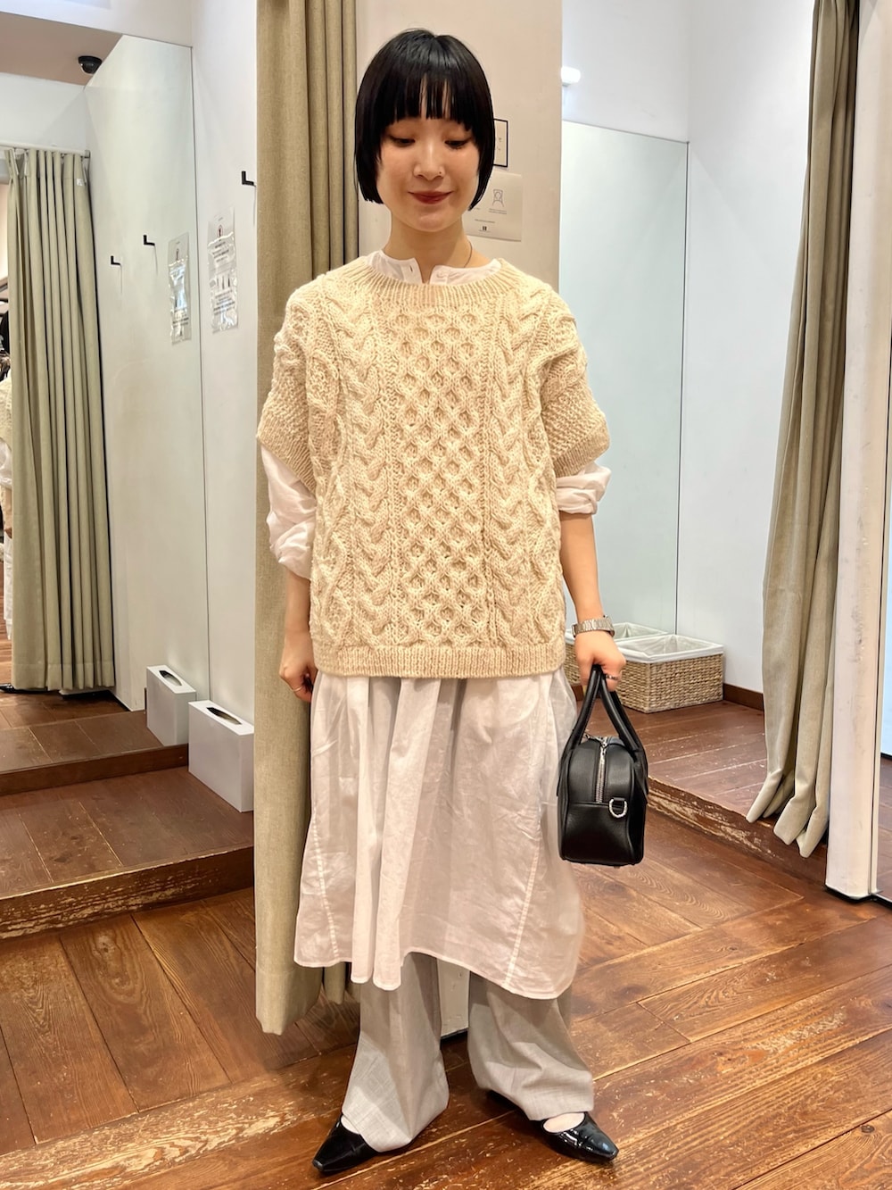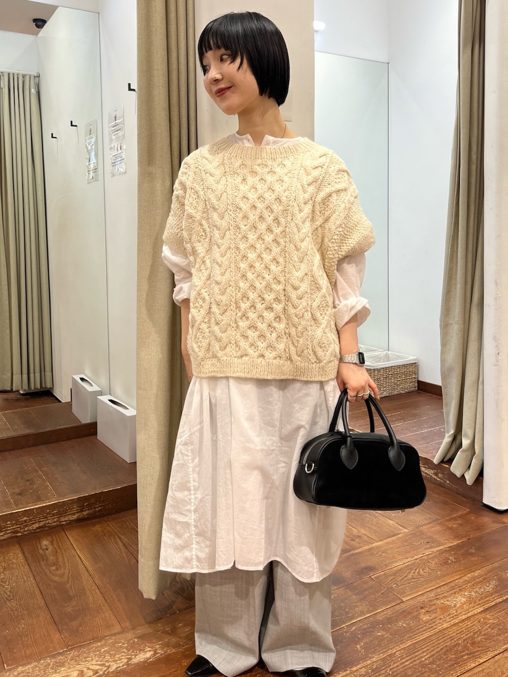 ざっくりアラン編みが特徴的で、しっかり幅もあるためもう少し冷え込むとタートルニットなどと重ねても◎