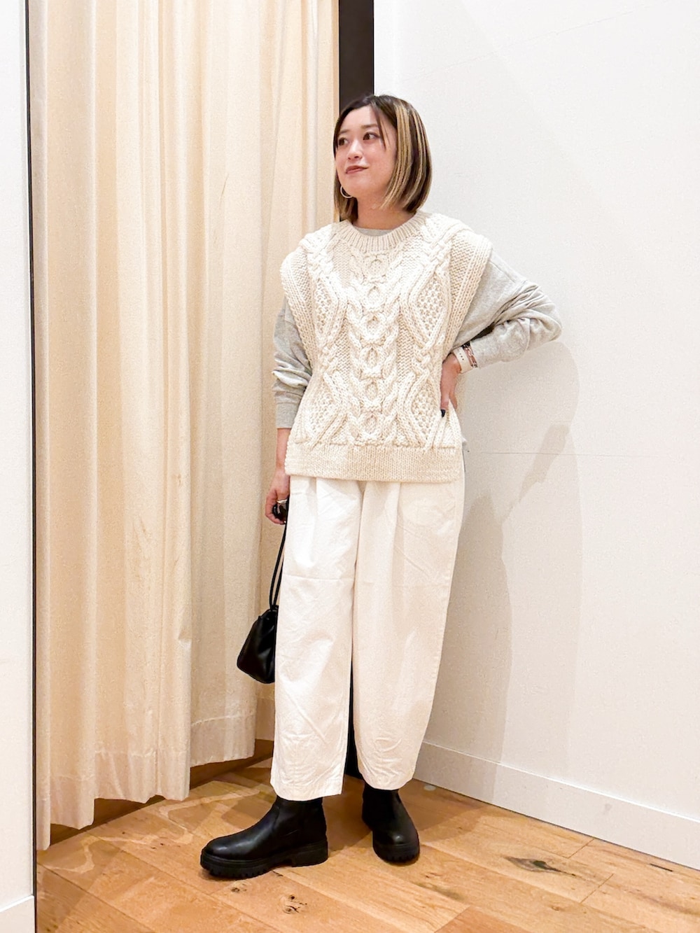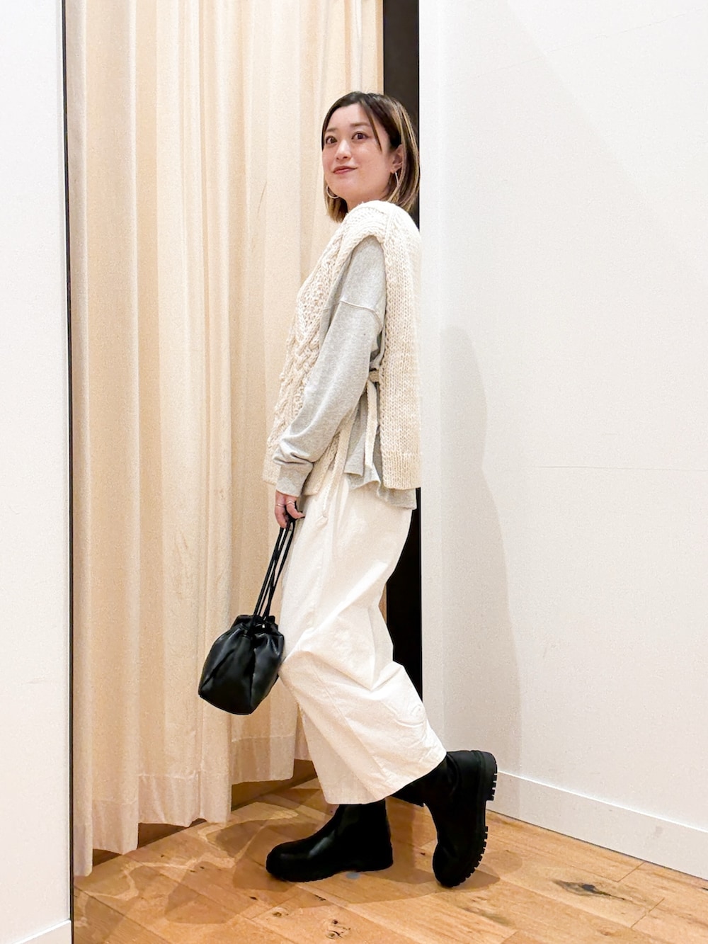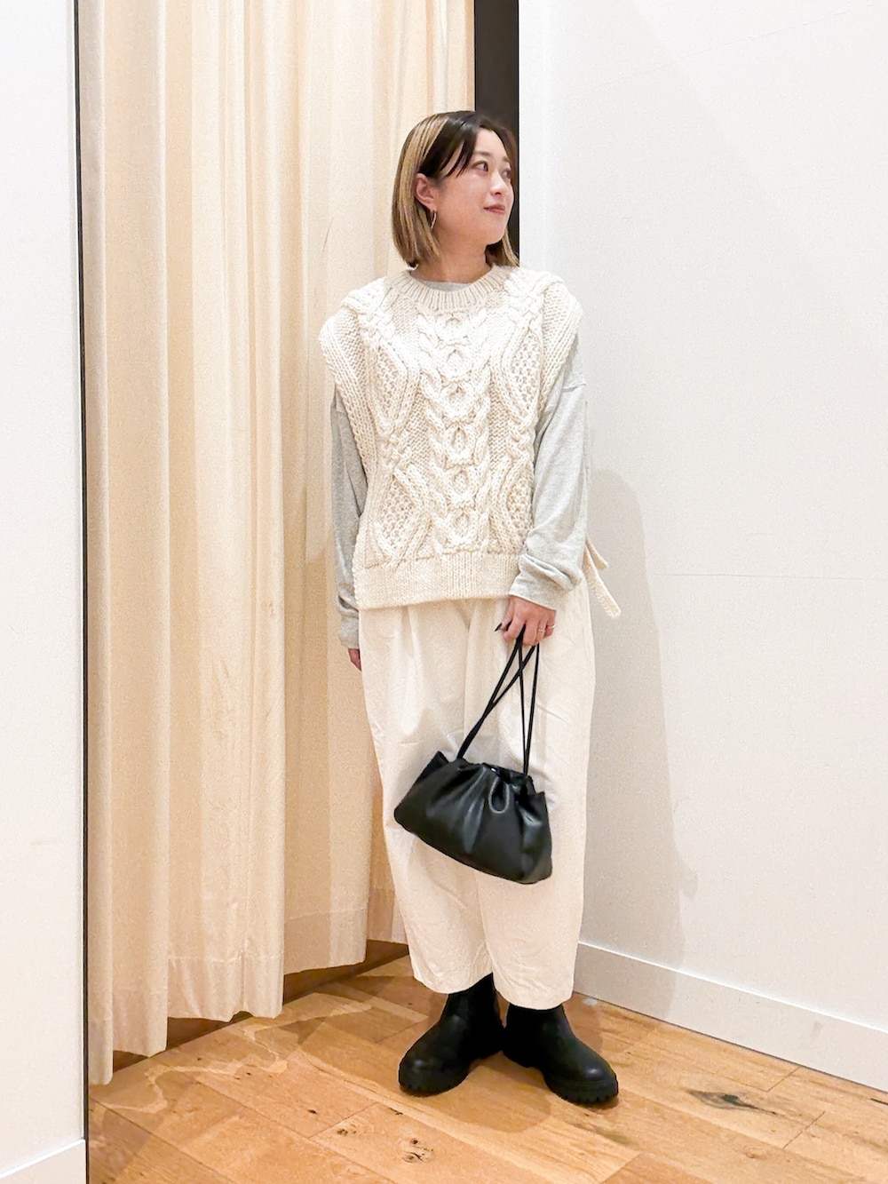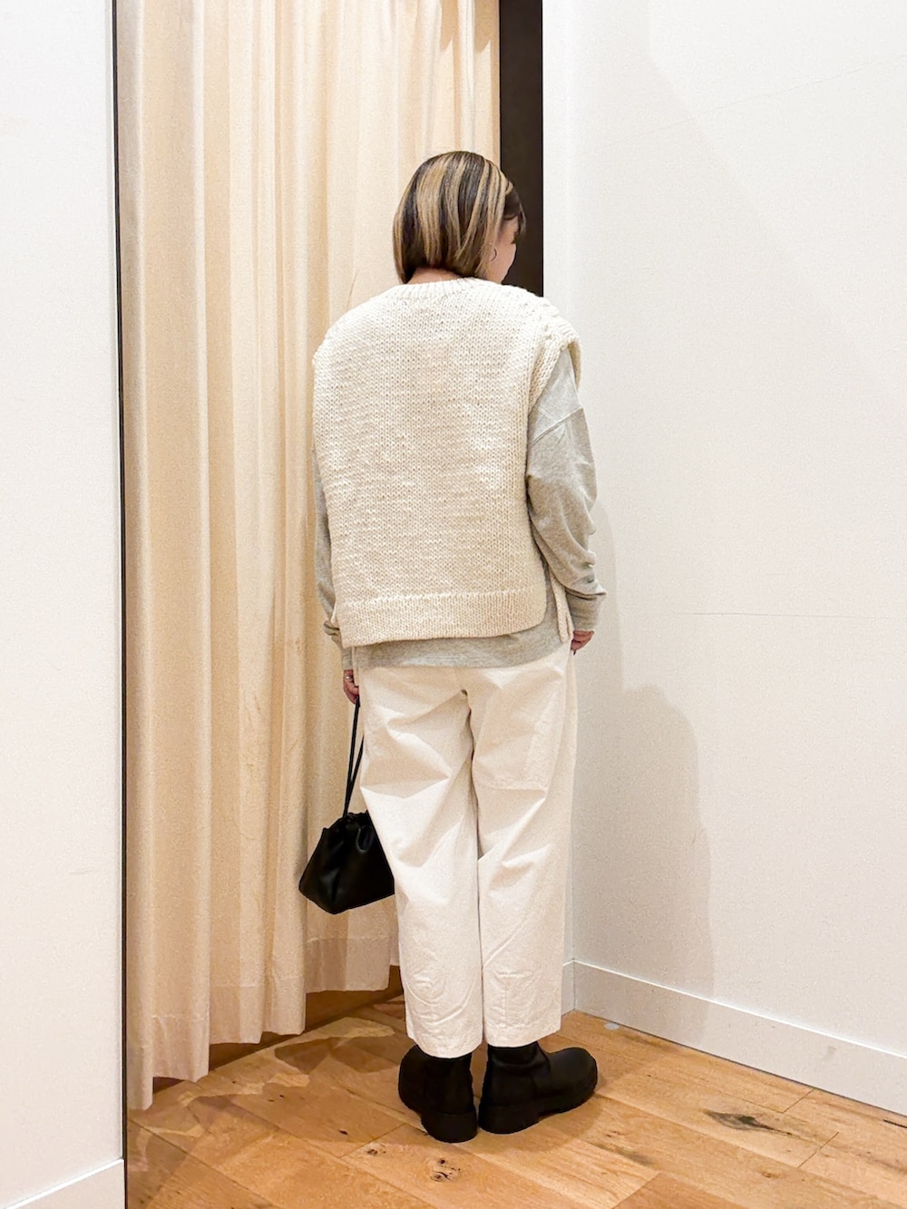 サイドを結んで調節するタイプのニットベストはカットソーからブラウスまでインナーを幅広く選べるので着回しにとてもオススメです。