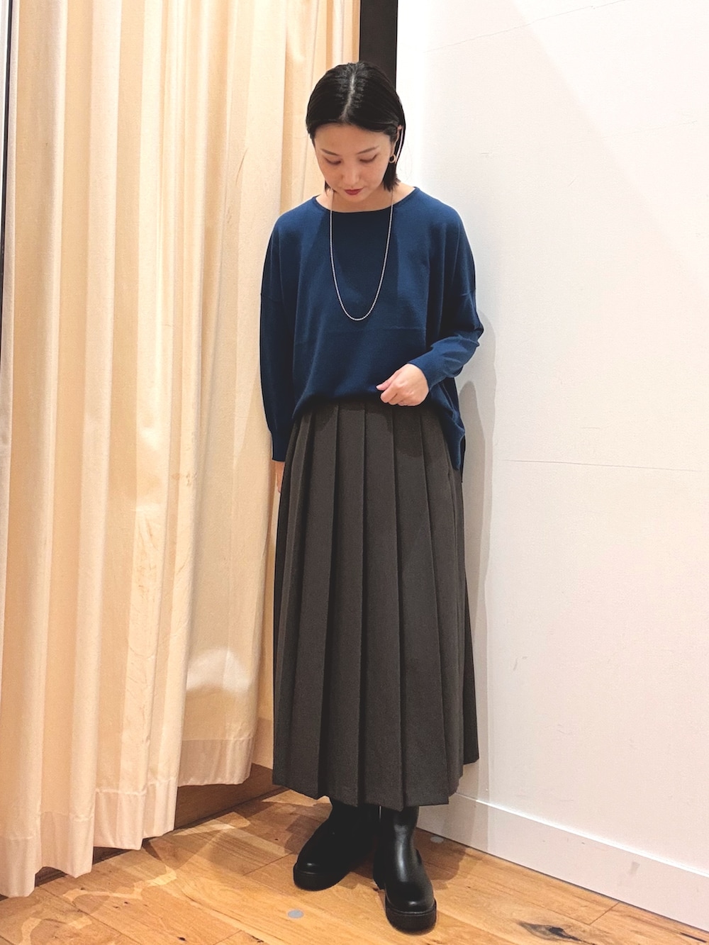 プリーツスカート合わせで綺麗めカジュアルに。
