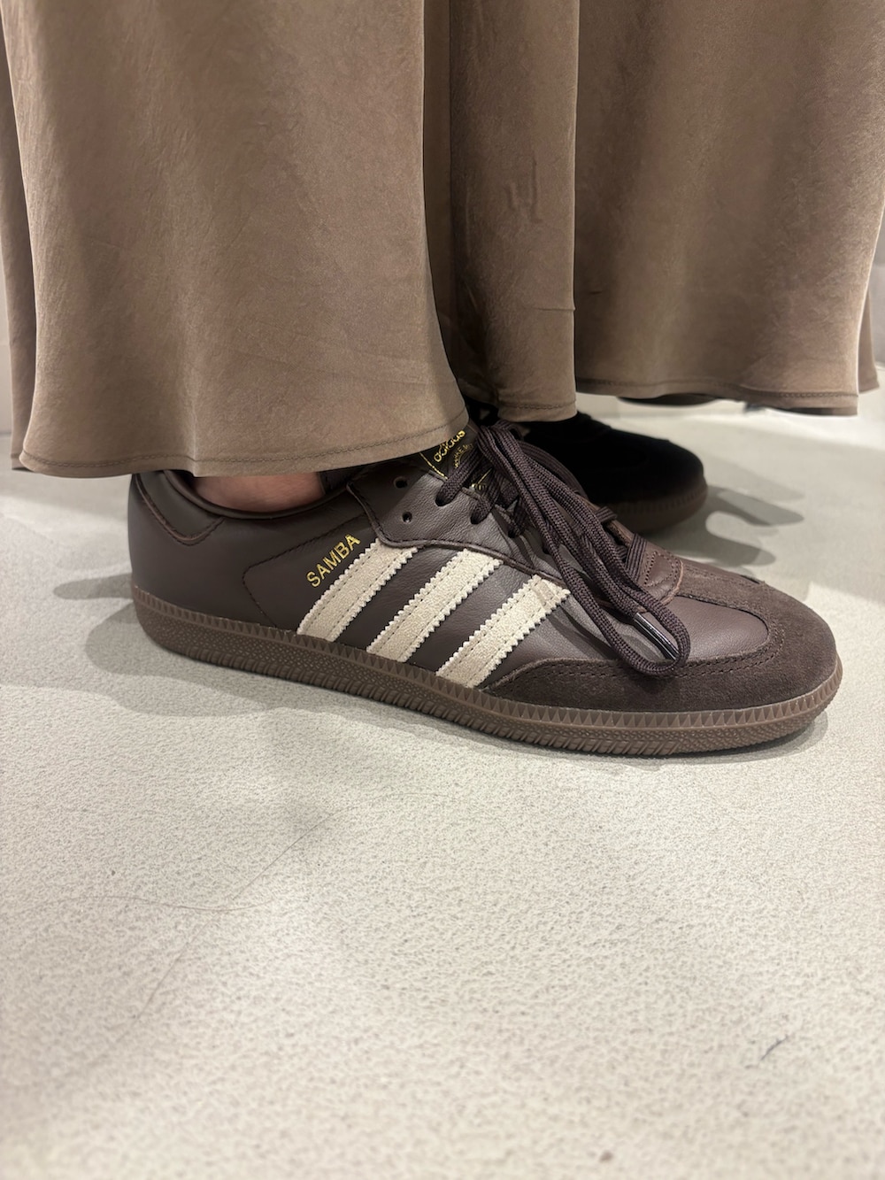 シューズは、秋冬コーデにぴったりなBROWNカラーの別注SAMBA OGで合わせました🤎