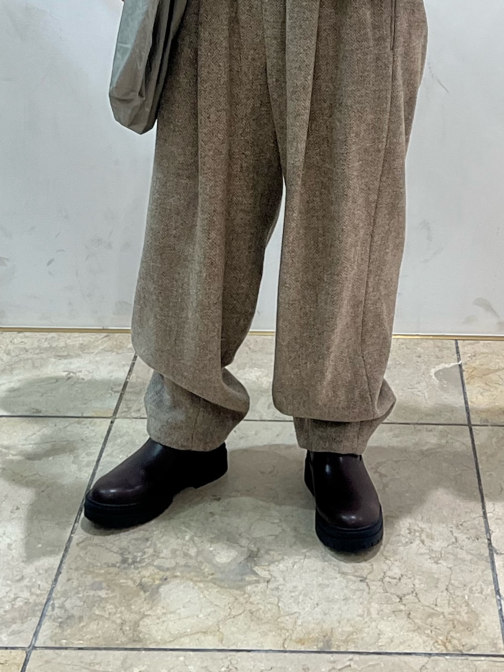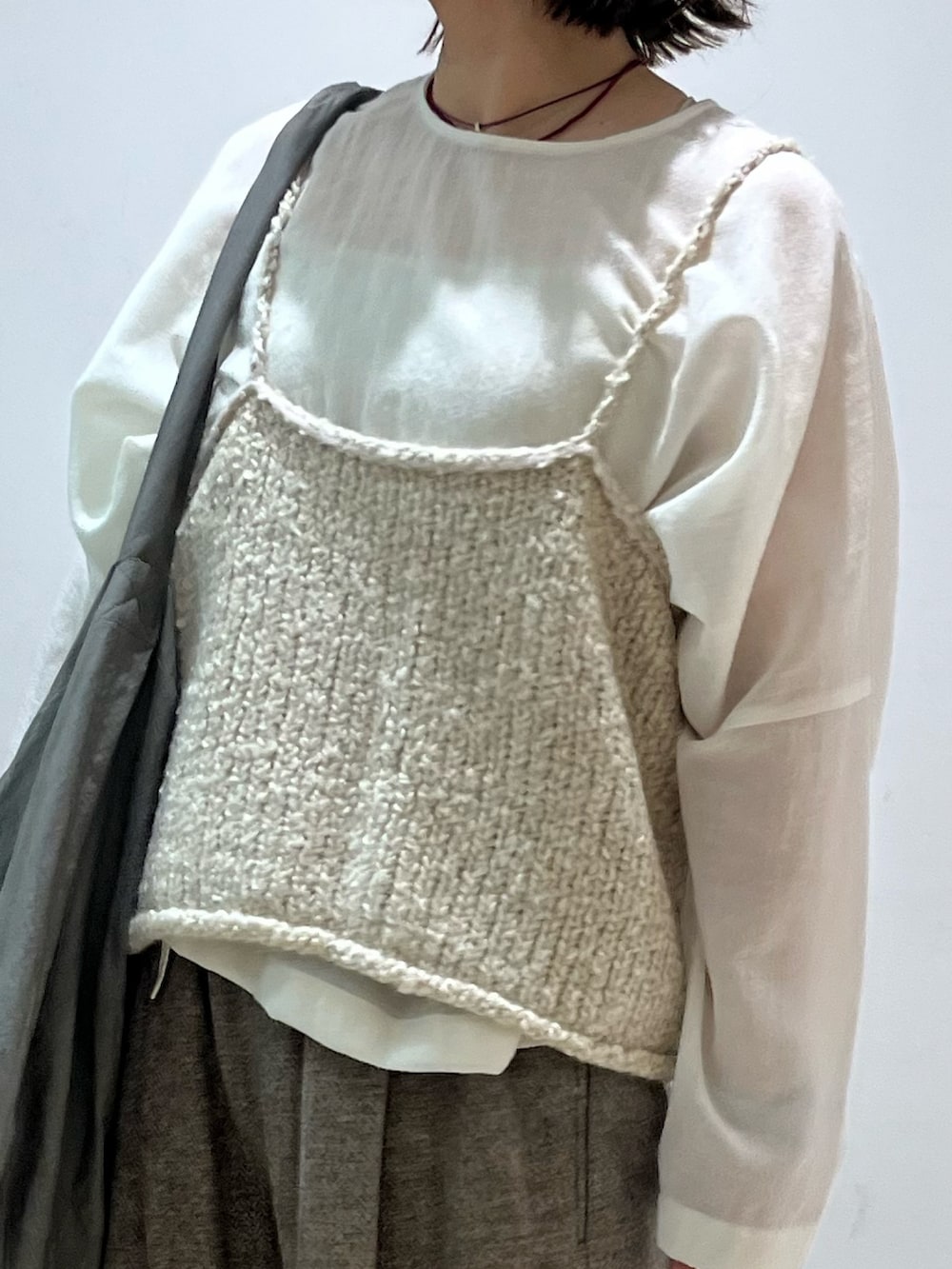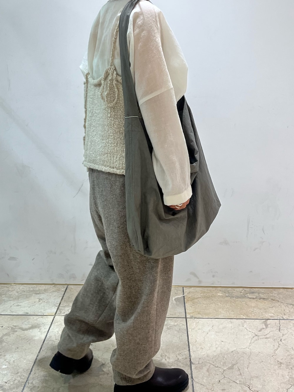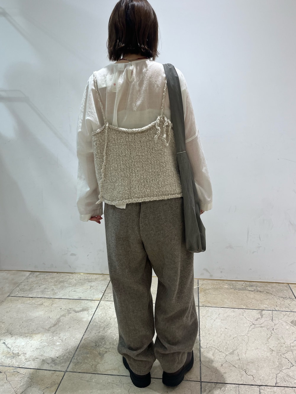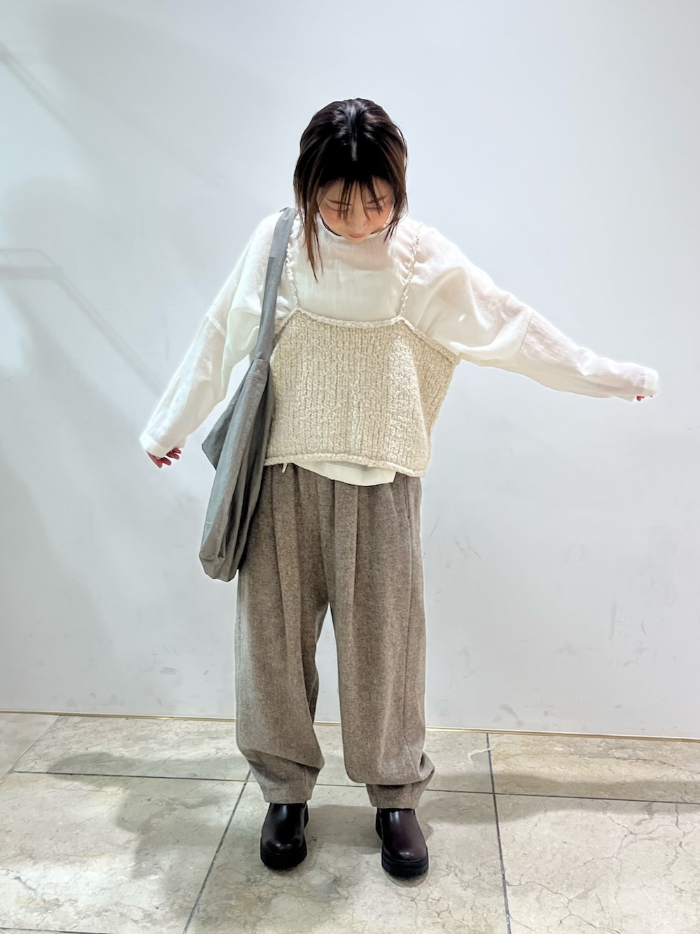 かぐれのアルパカウールブークレニットキャミは1着あると、アクセントになる優秀アイテム。かぐれのウールテーパードパンツに合わせて、素材で秋を楽しみました。